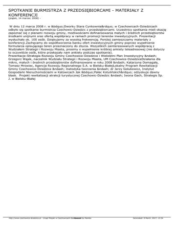 SPOTKANIE BURMISTRZA Z PRZEDSIĘBIORCAMI - MATERIAŁY Z KONFERENCJI (piątek, 14 marzec 2008) - W dniu 12 marca 2008 r. w „Dworku Stara Cynkownia” w Czechowicach-Dziedzicach odbyło się spotkanie burmistrza Czechowic-Dziedzic z przedsiębiorcami. Uczestnicy spotkania mieli okazję zapoznać się z planami rozwoju gminy, możliwościami dofinansowania małych i średnich przedsiębiorstw środkami unijnymi oraz ofertą współpracy w ramach promocji terenów inwestycyjnych. Prezentacji wysłuchało ok. 100 osób. Dziękujemy za wysoką frekwencję. Poniżej zamieszczamy materiały z konferencji.Zachęcamy do współtworzenia banku ofert inwestycyjnych gminy poprzez wypełnienie formularza opisującego teren przeznaczony do zbycia. Wszystkich zainteresowanych współpracą z Wydziałem Strategii i Rozwoju Miasta, prosimy o wypełnienie krótkiej ankiety teleadresowej (nie dotyczy to oczywiście osób, które przekazały nam ankiety podczas spotkania). Prezentacje:Strategia Rozwoju Gminy Czechowice-Dziedzice i Wieloletni Plan Inwestycyjny – Grzegorz Wąsik, naczelnik Wydziału Strategii i Rozwoju Miasta, UM Czechowice-DziedziceDziałania dla mikro, małych i średnich przedsiębiorstw dofinansowane w roku 2008 – Katarzyna Domagała, Tomasz Mrowiec, Agencja Rozwoju Regionalnego S.A. w Bielsku-BiałejLokalny Program Rewitalizacji Gminy Czechowice-Dziedzice – metodyka tworzenia – dr Jerzy Gołubowicz, Instytut Gospodarki Nieruchomościami w Katowicach Jak „Pałac Kotulińskich” odzyskuje dawny blask. Projekt rewitalizacji atrakcji turystycznej Czechowic-Dziedzic – Iwona Gach, Strategis Sp. J. w Bielsku-Białej http://www.czechowice-dziedzice.pl - Urząd Miejski w Czechowicach-Dziedzicach Powered by Mambo Generated: 8 March, 2017, 12:24