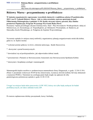 Różowy Marsz - przypominamy o profilaktyce Autor: Adres: http://www.nfz-zielonagora.pl/PL/263/3437/Rozowy_Marsz_-_przypominamy_o_profilaktyce/ Różowy Marsz - przypominamy o profilaktyce W imieniu organizatorów zapraszamy wszystkich chętnych w najbliższą sobotą (19 października 2013 ) na IV Lubuski Różowy Marsz . Jak co roku uczestnicy marszu spotykają się pod Filharmonią Zielonogórską o godzinie 11.30. Każdy otrzyma różowy parasol, abyz daleka promować Populacyjny Program Wczesnego Wyrwania Raka Piersi. Przemarsz będzie przezbiegać ulicami Zielonej Góry: Start - Plac Powstańców Wielkopolskich i dalej ul. Mickiewicza, ul. Żeromskiego, al. Niepodległości, pl. Bohaterów Westerplatte, ul. Bankowa, pl. Marszałka Józefa Piłsudskiego, ul. Podgórna do Szpitala Wojewódzkiego. Na terenie szpitala (w miejscu starej stołówki), organizatorzy planują zorganizowanie stoisk dla kobiet, gdzie m. in. będzie można: * wykonać pomiar glukozy we krwi, ciśnienia tętniczego, tkanki tłuszczowej. * skorzystać z porad kosmetycznych . * dowiedzieć się od profesjonalistów, jak odpowiednio dobrać stanik. * porozmawiać z Paniami ze Stowarzyszenia Amazonek oraz Stowarzyszenia Spotkania Kobiet. * skorzystać z bezpłatnej cytologii i mammografii Mammografia będzie możliwa w podstawionym mammobusie firmy Diagnostyk, w godz. 12.30-15.30 ( (Panie w przedziale wiekowym 50-69 lat bez skierowania, wystarczy dowód osobisty lub inny dokument z numerem PESEL). Natomiast na cytologię panie będa mogły się zgłaszać do izby ginekologiczno-położniczej szpitala w godz.12.30-15.30. Uwaga! na miejscu będa także pracownicy LOW NFZ, którzy nie tylko będą zachęcać do badań profilaktycznych, ale także zakładać konta ZIP. Po marszu zaplanowano drobny poczęstunek, kawę i herbatkę. strona 1 / 2 Różowy Marsz - przypominamy o profilaktyce Autor: Adres: http://www.nfz-zielonagora.pl/PL/263/3437/Rozowy_Marsz_-_przypominamy_o_profilaktyce/ ORGANIZATORZY: Kierownik wraz z zespołem Wojewódzkiego Ośrodka Koordynującego Populacyjny Program Wczesnego Wykrywania Raka Piersi dr n. med. Karolina Rabenda-Łącka strona 2 / 2 Powered by TCPDF (www.tcpdf.org)