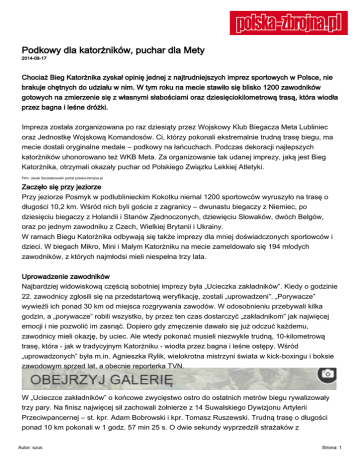 Podkowy dla katorżników, puchar dla Mety 2014-08-17 Chociaż Bieg Katorżnika zyskał opinię jednej z najtrudniejszych imprez sportowych w Polsce, nie brakuje chętnych do udziału w nim. W tym roku na mecie stawiło się blisko 1200 zawodników gotowych na zmierzenie się z własnymi słabościami oraz dziesięciokilometrową trasą, która wiodła przez bagna i leśne dróżki. Impreza została zorganizowana po raz dziesiąty przez Wojskowy Klub Biegacza Meta Lubliniec oraz Jednostkę Wojskową Komandosów. Ci, którzy pokonali ekstremalnie trudną trasę biegu, ma mecie dostali oryginalne medale – podkowy na łańcuchach. Podczas dekoracji najlepszych katorżników uhonorowano też WKB Meta. Za organizowanie tak udanej imprezy, jaką jest Bieg Katorżnika, otrzymali okazały puchar od Polskiego Związku Lekkiej Atletyki. Film: Jacek Szustakowski/ portal polska-zbrojna.pl Zaczęło się przy jeziorze Przy jeziorze Posmyk w podlublinieckim Kokotku niemal 1200 sportowców wyruszyło na trasę o długości 10,2 km. Wśród nich byli goście z zagranicy – dwunastu biegaczy z Niemiec, po dziesięciu biegaczy z Holandii i Stanów Zjednoczonych, dziewięciu Słowaków, dwóch Belgów, oraz po jednym zawodniku z Czech, Wielkiej Brytanii i Ukrainy. W ramach Biegu Katorżnika odbywają się także imprezy dla mniej doświadczonych sportowców i dzieci. W biegach Mikro, Mini i Małym Katorżniku na mecie zameldowało się 194 młodych zawodników, z których najmłodsi mieli niespełna trzy lata. Uprowadzenie zawodników Najbardziej widowiskową częścią sobotniej imprezy była „Ucieczka zakładników”. Kiedy o godzinie 22. zawodnicy zgłosili się na przedstartową weryfikację, zostali „uprowadzeni”. „Porywacze” wywieźli ich ponad 30 km od miejsca rozgrywania zawodów. W odosobnieniu przebywali kilka godzin, a „porywacze” robili wszystko, by przez ten czas dostarczyć „zakładnikom” jak najwięcej emocji i nie pozwolić im zasnąć. Dopiero gdy zmęczenie dawało się już odczuć każdemu, zawodnicy mieli okazję, by uciec. Ale wtedy pokonać musieli niezwykle trudną, 10-kilometrową trasę, która - jak w tradycyjnym Katorżniku - wiodła przez bagna i leśne ostępy. Wśród „uprowadzonych” była m.in. Agnieszka Rylik, wielokrotna mistrzyni świata w kick-boxingu i boksie zawodowym sprzed lat, a obecnie reporterka TVN. W „Ucieczce zakładników” o końcowe zwycięstwo ostro do ostatnich metrów biegu rywalizowały trzy pary. Na finisz najwięcej sił zachowali żołnierze z 14 Suwalskiego Dywizjonu Artylerii Przeciwpancernej – st. kpr. Adam Bobrowski i kpr. Tomasz Ruszewski. Trudną trasę o długości ponad 10 km pokonali w 1 godz. 57 min 25 s. O dwie sekundy wyprzedzili strażaków z Autor: szus Strona: 1 Ochotniczej Straży Pożarnej w Potępie Roberta Jaruszowca i Marka Pilarskiego oraz o 25 s zawodników z klubu biegowego Zadyszka Oświęcim Grzegorza Domańskiego i Zbigniewa Firka. – Trasa była dłuższa, niż przed rokiem i cięższa – komentowali na mecie zwycięzcy. Najlepsi katorżnicy to... Biegacze z Oświęcimia, którzy zajęli trzecie miejsce, byli pełni uznania dla rywali, z którymi przyszło im przegrać. – Chłopakom należy się szacunek. Gratulujemy strażakom i żołnierzom z Suwałk. Na trasie pracowaliśmy zespołowo. Naprawdę pracowaliśmy trzema drużynami na ten sukces – mówi Zbigniew Firek. – W debiucie zajęliśmy trzecie miejsce. Liczyliśmy na pierwsze, ale trudno. Trzeba się zadowolić trzecim – dodaje biegacz z Zadyszki Oświęcim i podkreśla, że od lat startuje z kolegami z klubu w Biegu Przełajowym o Nóż Komandosa. – Za rok zrewanżujemy się rywalom – przyznaje Grzegorz Domański, który biegł skuty razem z kolegą z oświęcimskiego klubu. – Za rok powalczymy o pierwsze miejsce – zapowiada Grzegorz Domański. Paweł Januszewski, mistrz Europy w biegu na 400 m przez płotki z 1998 roku, w Biegu Katorżnika startował po raz piąty i na mecie przekazał organizatorom szczególne podziękowania. – Chciałem podziękować za dwie ostatnie przeszkody, typowo płotkarskie. W końcu mogłem wykorzystać swoją technikę po tylu latach – mówi czołowy przed laty płotkarz w Europie. – Piąty rok tu startuję i po raz pierwszy organizatorzy zrobili malutki gest w stronę płotkarza. Bardzo im dziękuję – dodaje były zawodnik Wojskowego Klubu Sportowego Wawel Kraków. Nagrody wręczał szef BBN Najlepsi biegacze odebrali gratulacje i nagrody od szefa Biura Bezpieczeństwa Narodowego i towarzyszących mu gen. broni w st. spoczynku Lecha Konopki, prezesa Wojskowej Federacji Sportu, i gen. dyw. Jerzego Michałowskiego, zastępcy dowódcy generalnego. Minister Koziej był po raz pierwszy na zawodach w Kokotku i nie krył swego zadowolenia z tego, co robi Wojskowy Klub Biegacza Meta. – Jestem zafascynowany tym, co tutaj robicie. Bardzo dziękuję za te 10 lat. Bardzo dziękuję za tę dobrą robotę, za stworzenie takiej dobrej atmosfery – podkreślił szef BBN. Gratulował również wszystkim uczestnikom biegu. – To jest upowszechnianie waszej świadomości w dziedzinie bezpieczeństwa i popularyzowanie przy okazji jednej z najlepszych jednostek Wojska Polskiego, jaką jest tutejsza Jednostka Wojskowa Komandosów – podkreślił minister. *** Fundacja Byłych Żołnierzy i Funkcjonariusz Sił Specjalnych „Szturman” podczas X Biegu Katorżnika prowadziła akcję charytatywną na zakup protez dla afgańskiego policjanta, któremu po ataku rebeliantów uratowali życie polscy lekarze ze szpitala polowego. Akcja trwa dalej, a wpłaty można kierować na konto: Fundacja Byłych Żołnierzy i Funkcjonariusz Sił Specjalnych „Szturman”; ul. Sobieskiego 35; 42-700 Lubliniec; Alior Bank nr 18 2490 0005 0000 4600 6874 5845; dopisek „Tygrys”. Wyniki Autor: szus Strona: 2 „Ucieczka zakładników” 1. st. kpr. Adam Bobrowski i kpr. Tomasz Ruszewski (14 Suwalski Dywizjon Artyleri