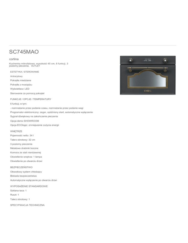 SC745MAO cortina Kuchenka mikrofalowa, wysokość 45 cm, 6 funkcji, 3 poziomy pieczenia, OUTLET ESTETYKA / STEROWANIE Antracytowy Pokrętła miedziane Pokrętła z mosiądzu Wyświetlacz: LED Sterowanie za pomocą pokręteł FUNKCJE / OPCJE / TEMPERATURY 6 funkcji, w tym: - rozmrażanie przez podanie czasu, rozmrażanie przez podanie wagi Programator elektroniczny: zegar, opóźniony start, automatyczne wyłączenie Sygnał dźwiękowy na zakończenie pieczenia Opcja demo SHOWROOM Opcja ECOlogic: zmniejszenie zużycia energii WNĘTRZE Pojemność netto: 34 l Talerz obrotowy: 32 cm 3 poziomy pieczenia Metalowe drabinki boczne Komora ze stali nierdzewnej Oświetlenie wnętrza: 1 lampa Oświetlenie po otwarciu drzwi BEZPIECZEŃSTWO Obwodowy system chłodzący Blokada bezpieczeństwa Automatyczne wyłączenie po otwarciu drzwi WYPOSAŻENIE STANDARDOWE Szklana taca: 1 Ruszt: 1 Talerz obrotowy: 1 SPECYFIKACJA TECHNICZNA SC745MAO cortina urządzenia kompaktowe 60cm antracyt kuchenki mikrofalowe