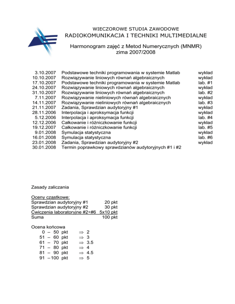 WIECZOROWE STUDIA ZAWODOWE RADIOKOMUNIKACJA I TECHNIKI MULTIMEDIALNE Harmonogram zajęć z Metod Numerycznych (MNMR) zima 2007/2008 3.10.2007 10.10.2007 17.10.2007 24.10.2007 31.10.2007 7.11.2007 14.11.2007 21.11.2007 28.11.2006 5.12.2006 12.12.2006 19.12.2007 9.01.2008 16.01.2008 23.01.2008 30.01.2008 Podstawowe techniki programowania w systemie Matlab Rozwiązywanie liniowych równań algebraicznych Podstawowe techniki programowania w systemie Matlab Rozwiązywanie liniowych równań algebraicznych Rozwiązywanie liniowych równań algebraicznych Rozwiązywanie nieliniowych równań algebraicznych Rozwiązywanie nieliniowych równań algebraicznych Zadania, Sprawdzian audytoryjny #1 Interpolacja i aproksymacja funkcji Interpolacja i aproksymacja funkcji Całkowanie i różniczkowanie funkcji Całkowanie i różniczkowanie funkcji Symulacja statystyczna Symulacja statystyczna Zadania, Sprawdzian audytoryjny #2 Termin poprawkowy sprawdzianów audytoryjnych #1 i #2 Zasady zaliczania Oceny cząstkowe: Sprawdzian audytoryjny #1 20 pkt Sprawdzian audytoryjny #2 30 pkt Ćwiczenia laboratoryjne #2÷#6 5x10 pkt Suma 100 pkt Ocena końcowa 0 – 50 pkt 51 – 60 pkt 61 – 70 pkt 71 – 80 pkt 81 – 90 pkt 91 – 100 pkt ⇒ ⇒ ⇒ ⇒ ⇒ ⇒ 2 3 3.5 4 4.5 5 wykład wykład lab. #1 wykład lab. #2 wykład lab. #3 wykład wykład lab. #4 wykład lab. #5 wykład lab. #6 wykład