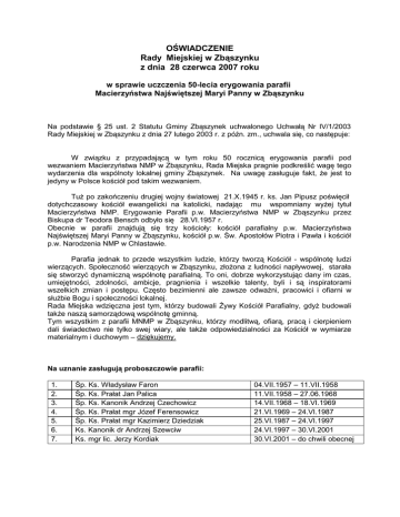 OŚWIADCZENIE Rady Miejskiej w Zbąszynku z dnia 28 czerwca 2007 roku w sprawie uczczenia 50-lecia erygowania parafii Macierzyństwa Najświętszej Maryi Panny w Zbąszynku Na podstawie § 25 ust. 2 Statutu Gminy Zbąszynek uchwalonego Uchwałą Nr IV/1/2003 Rady Miejskiej w Zbąszynku z dnia 27 lutego 2003 r. z późn. zm., uchwala się, co następuje: W związku z przypadającą w tym roku 50 rocznicą erygowania parafii pod wezwaniem Macierzyństwa NMP w Zbąszynku, Rada Miejska pragnie podkreślić wagę tego wydarzenia dla wspólnoty lokalnej gminy Zbąszynek. Na uwagę zasługuje fakt, że jest to jedyny w Polsce kościół pod takim wezwaniem. Tuż po zakończeniu drugiej wojny światowej 21.X.1945 r. ks. Jan Pipusz poświęcił dotychczasowy kościół ewangelicki na katolicki, nadając mu wspomniany wyżej tytuł Macierzyństwa NMP. Erygowanie Parafii p.w. Macierzyństwa NMP w Zbąszynku przez Biskupa dr Teodora Bensch odbyło się 28.VI.1957 r. Obecnie w parafii znajdują się trzy kościoły: kościół parafialny p.w. Macierzyństwa Najświętszej Maryi Panny w Zbąszynku, kościół p.w. Św. Apostołów Piotra i Pawła i kościół p.w. Narodzenia NMP w Chlastawie. Parafia jednak to przede wszystkim ludzie, którzy tworzą Kościół - wspólnotę ludzi wierzących. Społeczność wierzących w Zbąszynku, złożona z ludności napływowej, starała się stworzyć dynamiczną wspólnotę parafialną. To oni, dobrze wykorzystując dany im czas, umiejętności, zdolności, ambicje, pragnienia i wszelkie talenty, byli i są inspiratorami wszelkich zmian i postępu. Często bezimienni ale zawsze odważni, pracowici i ofiarni w służbie Bogu i społeczności lokalnej. Rada Miejska wdzięczna jest tym, którzy budowali Żywy Kościół Parafialny, gdyż budowali także naszą samorządową wspólnotę gminną. Tym wszystkim z parafii MNMP w Zbąszynku, którzy modlitwą, ofiarą, pracą i cierpieniem dali świadectwo nie tylko swej wiary, ale także odpowiedzialności za Kościół w wymiarze materialnym i duchowym – dziękujemy. Na uznanie zasługują proboszczowie parafii: 1. 2. 3. 4. 5. 6. 7. Śp. Ks. Władysław Faron Śp. Ks. Prałat Jan Palica Śp. Ks. Kanonik Andrzej Czechowicz Śp. Ks. Prałat mgr Józef Ferensowicz Śp. Ks. Prałat mgr Kazimierz Dziedziak Ks. Kanonik dr Andrzej Szewciw Ks. mgr lic. Jerzy Kordiak 04.VII.1957 – 11.VII.1958 11.VII.1958 – 27.06.1968 14.VII.1968 – 18.VI.1969 21.VI.1969 – 24.VI.1987 25.VI.1987 – 24.VI.1997 24.VI.1997 – 30.VI.2001 30.VI.2001 – do chwili obecnej Szczególną wdzięczność parafianie wyrażają Najświętszej Maryi Pannie. Przywiązanie do Niej znajduje wyraz między innymi w istniejących różach różańcowych, udziale w nabożeństwach Maryjnych, pielgrzymkach do Rokitna i Medjugorje. Pod opieką Maryi przez całe dziesiątki lat rodzice przekazują dar wiary swoim dzieciom. Znakiem obecności Maryi w parafii jest Jej figura z Dzieciątkiem Jezus. Przy parafii działa Duszpasterska Rada Parafialna, Liturgiczna Służba Ołtarza, Schola Dziecięca i Młodzieżowa, Parafialna Grupa „Caritas” , Akcja Katolicka, grupy: Wspólnota Królowej Pokoju, Ruch Rodzin Nazaretańskich, Ruch Światło-Życie - Kościół Domowy. Istnieje 20 róż różańcowych. Rada Miejska dziękuje wszystkim zaangażowanym w rozwój wspólnoty parafialnej, a tym samym i samorządowej. Chlubą naszej gminy jest fakt, że ze Zbąszynka wywodzi się Jego Ekscelencja ks. Bp Krzysztof Białasik, kierujący diecezją Oruro w Boliwii oraz kapłani, ojcowie i bracia zakonni oraz siostra zakonna: Beata Bok, Józef Białasik, Jacek Woźny, Dariusz Śmierzchalski-Wachocz, Mateusz Fleiszerowicz, Piotr Cieślak, Robert Nowak, Rafał Szczepaniak, Krzysztof Hojzer, pracujący na misjach oraz w parafiach za granicą i w Polsce. Słowa wdzięczności kierujemy do sióstr ze Zgromadzenia Jezusa Miłosiernego, które przez wiele lat owocnie pracowały w parafii. Zbąszynecki Kościół Parafialny był ostoją działań wolnościowych. W okresie po 1980r. pomagał i wspierał osoby oraz rodziny działające w ruchu Solidarność. Rada Miejska dziękuje parafianom za 50 aktywnych lat w budowaniu wiary i polskości i życzy utrzymania tożsamości wiary, tożsamości narodowej i kulturowej w nowej rzeczywistości europejskiej. Oświadczenie podlega rozplakatowaniu na urzędowych tablicach ogłoszeń. Przewodniczący Rady Jan Mazur