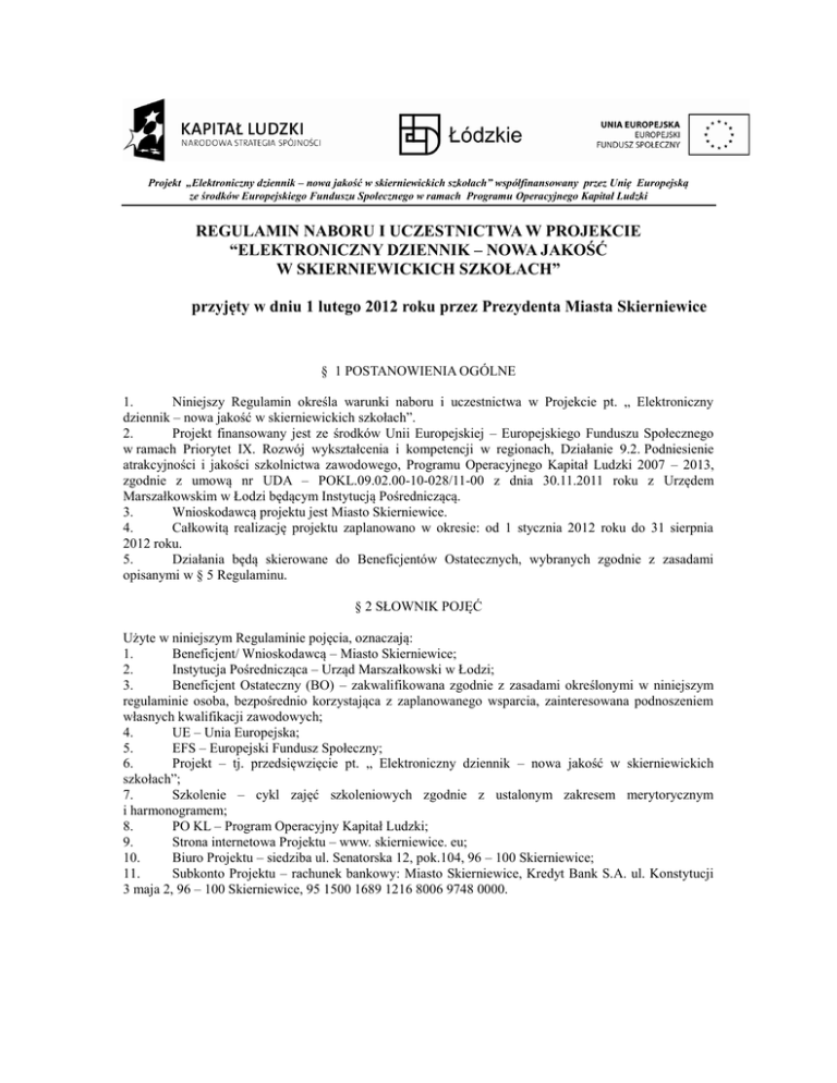 Projekt „Elektroniczny dziennik – nowa jakość w skierniewickich szkołach” współfinansowany przez Unię Europejską ze środków Europejskiego Funduszu Społecznego w ramach Programu Operacyjnego Kapitał Ludzki REGULAMIN NABORU I UCZESTNICTWA W PROJEKCIE “ELEKTRONICZNY DZIENNIK – NOWA JAKOŚĆ W SKIERNIEWICKICH SZKOŁACH” przyjęty w dniu 1 lutego 2012 roku przez Prezydenta Miasta Skierniewice § 1 POSTANOWIENIA OGÓLNE 1. Niniejszy Regulamin określa warunki naboru i uczestnictwa w Projekcie pt. „ Elektroniczny dziennik – nowa jakość w skierniewickich szkołach”. 2. Projekt finansowany jest ze środków Unii Europejskiej – Europejskiego Funduszu Społecznego w ramach Priorytet IX. Rozwój wykształcenia i kompetencji w regionach, Działanie 9.2. Podniesienie atrakcyjności i jakości szkolnictwa zawodowego, Programu Operacyjnego Kapitał Ludzki 2007 – 2013, zgodnie z umową nr UDA – POKL.09.02.00-10-028/11-00 z dnia 30.11.2011 roku z Urzędem Marszałkowskim w Łodzi będącym Instytucją Pośredniczącą. 3. Wnioskodawcą projektu jest Miasto Skierniewice. 4. Całkowitą realizację projektu zaplanowano w okresie: od 1 stycznia 2012 roku do 31 sierpnia 2012 roku. 5. Działania będą skierowane do Beneficjentów Ostatecznych, wybranych zgodnie z zasadami opisanymi w § 5 Regulaminu. § 2 SŁOWNIK POJĘĆ Użyte w niniejszym Regulaminie pojęcia, oznaczają: 1. Beneficjent/ Wnioskodawcą – Miasto Skierniewice; 2. Instytucja Pośrednicząca – Urząd Marszałkowski w Łodzi; 3. Beneficjent Ostateczny (BO) – zakwalifikowana zgodnie z zasadami określonymi w niniejszym regulaminie osoba, bezpośrednio korzystająca z zaplanowanego wsparcia, zainteresowana podnoszeniem własnych kwalifikacji zawodowych; 4. UE – Unia Europejska; 5. EFS – Europejski Fundusz Społeczny; 6. Projekt – tj. przedsięwzięcie pt. „ Elektroniczny dziennik – nowa jakość w skierniewickich szkołach”; 7. Szkolenie – cykl zajęć szkoleniowych zgodnie z ustalonym zakresem merytorycznym i harmonogramem; 8. PO KL – Program Operacyjny Kapitał Ludzki; 9. Strona internetowa Projektu – www. skierniewice. eu; 10. Biuro Projektu – siedziba ul. Senatorska 12, pok.104, 96 – 100 Skierniewice; 11. Subkonto Projektu – rachunek bankowy: Miasto Skierniewice, Kredyt Bank S.A. ul. Konstytucji 3 maja 2, 96 – 100 Skierniewice, 95 1500 1689 1216 8006 9748 0000. § 3 CEL PROJEKTU 1. Celem ogólnym Projektu jest podniesienie jakości procesu kształcenia w ZSZ nr 1, ZSZ nr 2 i ZS nr 4 w Skierniewicach prowadzących kształcenie zawodowe poprzez realizację i wdrożenie programów i narzędzi efektywnego zarządzania placówką oświatową. 2. Celem szczegółowym Projektu jest podniesienie poziomu wiedzy i umiejętności 129 pracowników skierniewickiej oświaty z zakresu wykorzystywania elektronicznego dziennika w codziennej pracy oraz usprawnienie procesu nauczania, zarządzania i administrowania przez zwiększenie wykorzystania ICT w ZSZ nr 1, ZSZ nr 2 oraz ZS nr 4 w Skierniewicach. § 4 ZAKRES WSPARCIA 1. Udział w Projekcie jest bezpłatny. Dofinansowanie w ramach projektu obejmuje koszt szkolenia pracowników oświaty, druk materiałów szkoleniowych i promocyjnych, zakup 11 komputerów przenośnych wraz z oprogramowaniem (w tym po 3 dla każdej ze szkół biorącej udział w Projekcie), zakup rocznej licencji elektronicznego dziennika dla każdej ze szkół biorącej udział w Projekcie. 2. Głównym przedmiotem wsparcia jest umożliwienie Beneficjentowi Ostatecznemu udziału w szkoleniu, którego tematyka obejmuje: MODUŁ I: ICT W PRACY DYREKTORA(dla 6 osób) – miejsce i rola ICT w zarządzaniu szkołami kształcenia zawodowego, systemowe gromadzenie informacji o uczniu, budowa systemu ED, monitorowanie dydaktycznej pracy szkoły, posługiwanie się dziennikiem w czasie lekcji, sporządzanie wydruków i raportów, dołączanie rozkładów materiału nauczania, praca w module lekcyjnym, przeglądanie witryn dla rodzica/ucznia, drukowanie świadectw szkolnych, zaawansowane funkcje pakietu biurowego dla edukacji. MODUŁ II: ICT W PRACY SZKOLNEGO SEKRETARIATU (dla 6 osób) – budowa zintegrowanego systemu ED, prowadzenie ewidencji uczniów, rejestrowanie przepływów uczniów, klasyfikacja uczniów, sporządzenie zestawień i wydruków, zamykanie roku szkolnego, tworzenie list, pism i filarów według własnego projektu, eksport danych do systemu informacji oświatowej, zaawansowane funkcje pakietu biurowego dla szkolnej administracji. MODUŁ III: ICT W PRACY NAUCZYCIELA ( dla 117 osób): posługiwanie się ED w czasie lekcji, dokonywanie wpisów przez wychowawcę, sporządzanie wydruków i raportów, dołączanie rozkładów materiału nauczania, praca w module lekcyjnym, przeglądanie witryn dla rodzica/ ucznia, drukowanie świadectw szkolnych, zaawansowane funkcje pakietu biurowego dla edukacji. § 5 BENEFICJENCI OSTATECZNI I ICH REKRUTACJA 1. W projekcie udział wezmą pracownicy skierniewickich placówek oświatowych z ZSZ nr 1, ZSZ nr 2 oraz ZS nr 4 w Skierniewicach. Odbędzie się szkolenie dla 3 dyrektorów i 3 wicedyrektorów, 6 osób kadry administracyjnej oraz 117 nauczycieli. 2. Proces rekrutacji przebiegać będzie w 3 etapach: a) Etap I: Kampania informacyjno – promocyjna Celem tego etapu będzie dotarcie z informacją o Projekcie do dyrektorów, nauczycieli oraz kadry administracyjnej ZSZ nr 1, ZSZ nr 2 oraz ZS nr 4. Odbędzie się spotkanie z dyrektorami, a następnie spotkanie inaugurujące Projekt. b) Etap II: Wybór uczestników w oparciu o warunki formalne W szkoleniach udział wezmą wszyscy dyrektorzy oraz wskazani przez nich wicedyrektorzy oraz kadra administracyjna. Wśród nauczycieli zostanie przeprowadzona ankieta rekrutacyjna, na podstawie, której zostaną oni zakwalifikowani na Szkolenie. Wśród uczestników zostanie zakwalifikowanych co najmniej 20 nauczycieli posiadających stopień awansu – dyplomowany. c) Etap III: Podpisanie dokume
