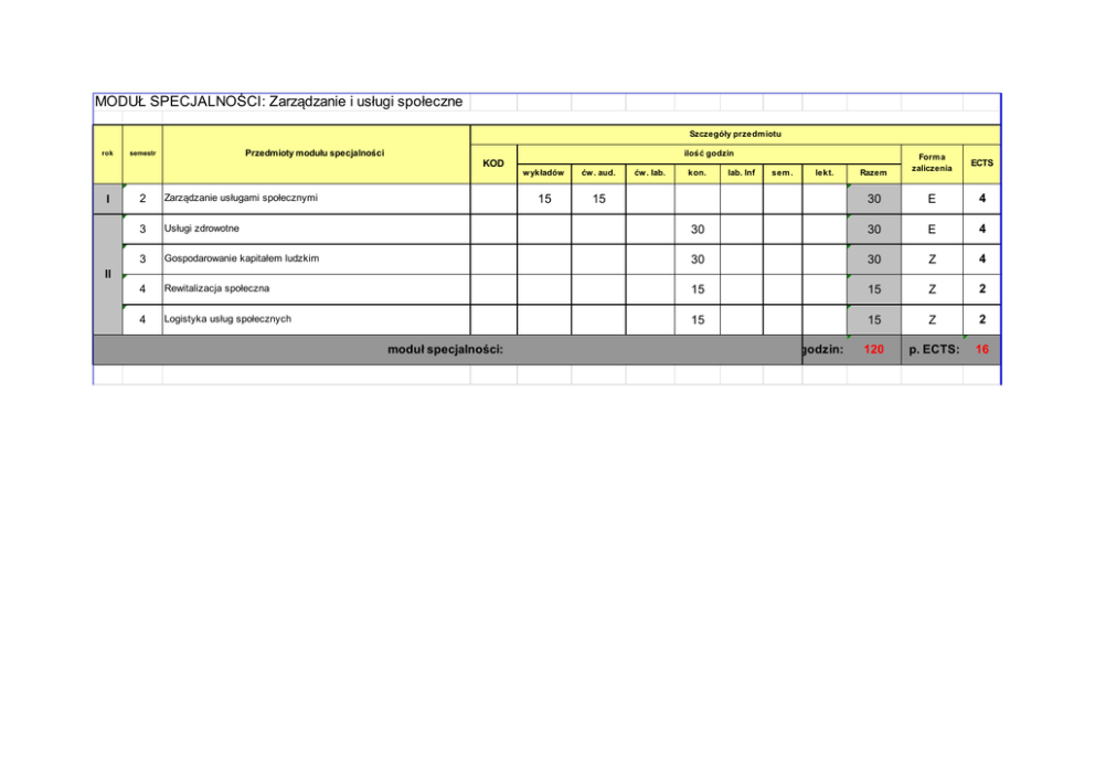 MODUŁ SPECJALNOŚCI: Zarządzanie i usługi społeczne Szczegóły przedm iotu rok Przedmioty modułu specjalności semestr ilość godzin Form a zaliczenia ECTS 30 E 4 KOD I w ykładów ćw . aud. 15 15 ćw . lab. kon. lab. Inf sem . lekt. Razem 2 Zarządzanie usługami społecznymi 3 Usługi zdrowotne 30 30 E 4 3 Gospodarowanie kapitałem ludzkim 30 30 Z 4 4 Rewitalizacja społeczna 15 15 Z 2 4 Logistyka usług społecznych 15 15 Z 2 120 p. ECTS: 16 II moduł specjalności: godzin: