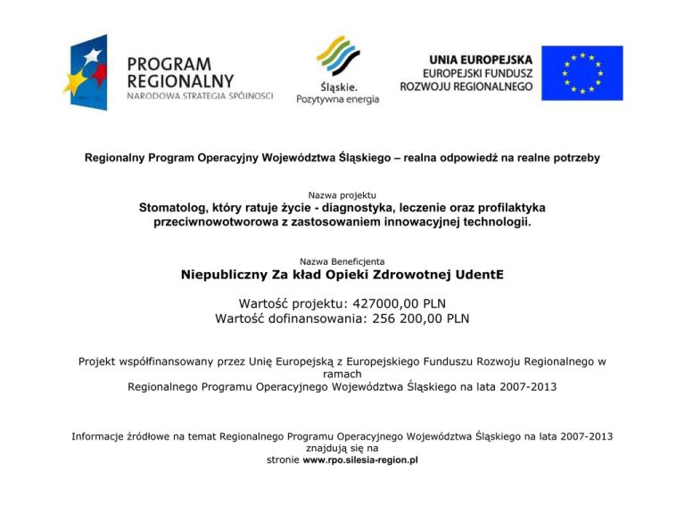 Regionalny Program Operacyjny Województwa Śląskiego – realna odpowiedź na realne potrzeby Nazwa projektu Stomatolog, który ratuje życie - diagnostyka, leczenie oraz profilaktyka przeciwnowotworowa z zastosowaniem innowacyjnej technologii. Nazwa Beneficjenta Niepubliczny Za kład Opieki Zdrowotnej UdentE Wartość projektu: 427000,00 PLN Wartość dofinansowania: 256 200,00 PLN Projekt współfinansowany przez Unię Europejską z Europejskiego Funduszu Rozwoju Regionalnego w ramach Regionalnego Programu Operacyjnego Województwa Śląskiego na lata 2007-2013 Informacje źródłowe na temat Regionalnego Programu Operacyjnego Województwa Śląskiego na lata 2007-2013 znajdują się na stronie www.rpo.silesia-region.pl