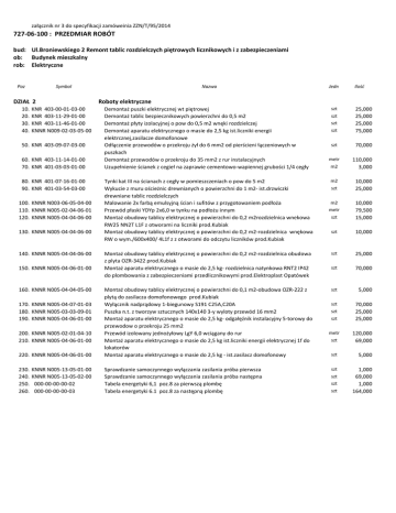załącznik nr 3 do specyfikacji zamóweinia ZZN/T/95/2014 727-06-100 : PRZEDMIAR ROBÓT bud: Ul.Broniewskiego 2 Remont tablic rozdzielczych piętrowych licznikowych i z zabezpieczeniami ob: Budynek mieszkalny rob: Elektryczne Poz Symbol DZIAŁ 2 Nazwa Jedn Ilość Roboty elektryczne szt szt szt szt 25,000 25,000 25,000 75,000 szt 70,000 metr m2 110,000 3,000 m2 szt 10,000 25,000 m2 metr szt 10,000 79,500 15,000 szt 10,000 Montaż obudowy tablicy elektrycznej o powierzchni do 0,2 m2-rozdzielnica obudowa z plyta OZR-3422 prod.Kubiak Montaż aparatu elektrycznego o masie do 2,5 kg- rozdzielnica natynkowa RNT2 IP42 do plombowania z zabezpieczeniami przedlicznikowymi prod.Elektroplast Opatówek szt 25,000 szt 70,000 szt 5,000 szt szt szt 70,000 25,000 25,000 metr szt 120,000 69,000 220. KNNR N005-04-06-01-00 Montaż obudowy tablicy elektrycznej o powierzchni do 0,1 m2-obudowa OZR-222 z plytą do zasilacza domofonowego prod.Kubiak Wyłącznik nadprądowy 1-biegunowy S191 C25A,C20A Puszka n.t. z tworzyw sztucznych 140x140 3-y wyloty przewód 16 mm2 Montaż aparatu elektrycznego o masie do 2,5 kg- odgałęźnik instalacyjny 5-torowy do przewodow o przekroju 25 mm2 Przewód izolowany jednożyłowy LgY 6,0 wciągany do rur Montaż aparatu elektrycznego o masie do 2,5 kg ist.liczniki energii elektrycznej 1f do lokatorów Montaż aparatu elektrycznego o masie do 2,5 kg - ist.zasilacz domofonowy 230. 240. 250. 260. Sprawdzanie samoczynnego wyłączania zasilania próba pierwsza Sprawdzanie samoczynnego wyłączania zasilania próba następna Tabela energetyki 6,1 poz.8 za pierwszą plombę Tabela energetyki 6.1 poz.8 za następną plombę 10. 20. 30. 40. KNR 403-00-01-03-00 KNR 403-11-29-01-00 KNR 403-11-46-01-00 KNNR N009-02-03-05-00 50. KNR 403-09-07-03-00 60. KNR 403-11-14-01-00 70. KNR 401-03-03-01-00 80. KNR 401-07-16-01-00 90. KNR 401-03-54-03-00 100. KNNR N003-06-05-04-00 110. KNNR N005-02-04-06-01 120. KNNR N005-04-04-06-00 130. KNNR N005-04-04-06-00 140. KNNR N005-04-04-06-00 150. KNNR N005-04-06-01-00 160. KNNR N005-04-04-05-00 170. KNNR N005-04-07-01-03 180. KNNR N005-03-03-09-01 190. KNNR N005-04-06-01-00 200. KNNR N005-02-01-04-10 210. KNNR N005-04-06-01-00 KNNR N005-13-05-01-00 KNNR N005-13-05-02-00 000-00-00-00-02 000-00-00-00-03 Demontaż puszki elektrycznej wt piętrowej Demontaż tablic bezpiecznikowych powierzchni do 0,5 m2 Demontaż płyty izolacyjnej o pow do 0,5 m2 wnęki rozdzielczej Demontaż aparatu elektrycznego o masie do 2,5 kg ist.liczniki energii elektrcznej,zasilacze domofonowe Odłączenie przewodów o przekroju żył do 6 mm2 od pierścieni łączeniowych w puszkach Demontaż przewodów o przekroju do 35 mm2 z rur instalacyjnych Uzupełnienie ścianek z cegieł na zaprawie cementowo-wapiennej grubości 1/4 cegły Tynki kat III na ścianach z cegły w pomieszczeniach o pow do 5 m2 Wykucie z muru ościeżnic drewnianych o powierzchni do 1 m2- ist.drzwiczki drewniane tablic rozdzielczych Malowanie 2x farbą emulsyjną ścian i sufitów z przygotowaniem podłoża Przewód płaski YDYp 2x6,0 w tynku na podłożu innym Montaż obudowy tablicy elektrycznej o powierzchni do 0,2 m2rozdzielnica wnekowa RW25 NN2T L1F z otworami na liczniki prod.Kubiak Montaż obudowy tablicy elektrycznej o powierzchni do 0,2 m2-rozdzielnica wnękowa RW o wym./600x400/ 4L1f z z otworami do odczytu liczników prod.Kubiak szt 5,000 szt szt szt szt 1,000 69,000 1,000 164,000