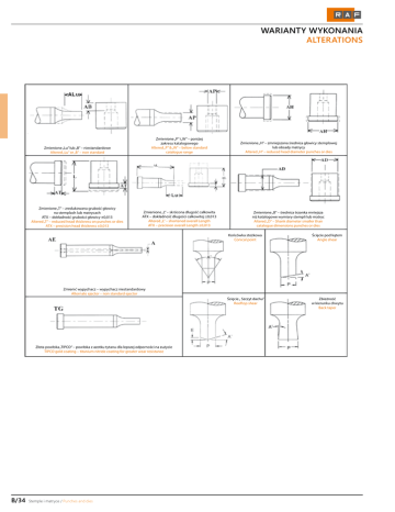 WARIANTY WYKONANIA ALTERATIONS Zmienione „Lu” lub „B” – niestandardowe Altered „Lu” or „B” – non standard Zmienione „P” i „W” – poniżej zakresu katalogowego Altered „P” & „W” – below standard catalogue range Zmienione „H” – zmniejszona średnica głowicy stemplowej lub obsady matrycy Altered „H” – reduced head diameter punches or dies Zmienione „T” – zredukowana grubość głowicy na stemplach lub matrycach ATX – dokładność grubości głowicy ±0,013 Altered „T” – reduced head thickness on punches or dies ATX – precision head thickness ±0,013 Zmienione „L” – skrócona długość całkowita ATX – dokładność długości całkowitej ±0,013 Altered „L” – shortened overall Length ATX – precision overall Length ±0,013 Zmienione „B” – średnica trzonka mniejsza niż katalogowe wymiary stempli lub matryc Altered „D” – Shank diameter smaller than catalogue dimensions punches or dies Końcówka stożkowa Conical point Ścięcie pod kątem Angle shear Ścięcie „ Szczyt dachu” Rooftop shear Zbieżność w kierunku chwytu Back taper Zmienić wypychacz – wypychacz niestandardowy Alternate ejector – non standard ejector Złota powłoka „TIPCO” – powłoka z azotku tytanu dla lepszej odporności na zużycie TIPCO gold coating – titanium nitride coating for greater wear resistance B/34 Stemple i matryce / Punches and dies