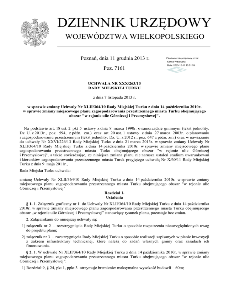 DZIENNIK URZĘDOWY WOJEWÓDZTWA WIELKOPOLSKIEGO Poznań, dnia 11 grudnia 2013 r. Elektronicznie podpisany przez: Karina Wiśniewska Poz. 7161 Data: 2013-12-11 13:51:33 UCHWAŁA NR XXX/263/13 RADY MIEJSKIEJ TURKU z dnia 7 listopada 2013 r. w sprawie zmiany Uchwały Nr XLII/364/10 Rady Miejskiej Turku z dnia 14 października 2010r. w sprawie zmiany miejscowego planu zagospodarowania przestrzennego miasta Turku obejmującego obszar "w rejonie ulic Górniczej i Przemysłowej". Na podstawie art. 18 ust. 2 pkt 5 ustawy z dnia 8 marca 1990r. o samorządzie gminnym (tekst jednolity: Dz. U. z 2013r., poz. 594, z późn. zm.) oraz art. 20 ust. 1 ustawy z dnia 27 marca 2003r. o planowaniu i zagospodarowaniu przestrzennym (tekst jednolity: Dz. U. z 2012 r., poz. 647 z późn. zm.) oraz w nawiązaniu do uchwały Nr XXVI/226/13 Rady Miejskiej Turku z dnia 21 marca 2013r. w sprawie zmiany Uchwały Nr XLII/364/10 Rady Miejskiej Turku z dnia 14 października 2010r. w sprawie zmiany miejscowego planu zagospodarowania przestrzennego miasta Turku obejmującego obszar "w rejonie ulic Górniczej i Przemysłowej", a także stwierdzając, że niniejsza zmiana planu nie narusza ustaleń studium uwarunkowań i kierunków zagospodarowania przestrzennego miasta Turek przyjętego uchwałą Nr X/60/11 Rady Miejskiej Turku z dnia 9 maja 2011r., Rada Miejska Turku uchwala: zmianę Uchwały Nr XLII/364/10 Rady Miejskiej Turku z dnia 14 października 2010r. w sprawie zmiany miejscowego planu zagospodarowania przestrzennego miasta Turku obejmującego obszar "w rejonie ulic Górniczej i Przemysłowej" Rozdział 1. Ustalenia § 1. 1. Załącznik graficzny nr 1 do Uchwały Nr XLII/364/10 Rady Miejskiej Turku z dnia 14 października 2010r. w sprawie zmiany miejscowego planu zagospodarowania przestrzennego miasta Turku obejmującego obszar „w rejonie ulic Górniczej i Przemysłowej” stanowiący rysunek planu, pozostaje bez zmian. 2. Załącznikami do niniejszej uchwały są: 1) załącznik nr 2 – rozstrzygnięcia Rady Miejskiej Turku o sposobie rozpatrzenia nieuwzględnionych uwag do projektu planu; 2) załącznik nr 3 – rozstrzygnięcia Rady Miejskiej Turku o sposobie realizacji zapisanych w planie inwestycji z zakresu infrastruktury technicznej, które należą do zadań własnych gminy oraz zasadach ich finansowania. § 2. 1. W uchwale Nr XLII/364/10 Rady Miejskiej Turku z dnia 14 października 2010r. w sprawie zmiany miejscowego planu zagospodarowania przestrzennego miasta Turku obejmującego obszar "w rejonie ulic Górniczej i Przemysłowej": 1) Rozdział 9, § 24, pkt 1, ppkt 3 otrzymuje brzmienie: maksymalna wysokość budowli – 60m; Dziennik Urzędowy Województwa Wielkopolskiego –2– Poz. 7161 2) Rozdział 8, § 20, pkt 2 otrzymuje brzmienie: Dopuszcza się na terenach przemysłowych lokalizacje budowli o wysokości do 60m. W przypadku lokalizowania obiektów o wysokości równej i większej niż 50,0m n.p.t. należy uwzględnić przepisy odrębne. 2. Pozostałe ustalenia Uchwały Nr XLII/364/10 Rady Miejskiej Turku z dnia 14 października 2010r. w sprawie zmiany miejscowego planu zagospodarowania przestrzennego miasta Turku obejmującego obszar "w rejonie ulic Górniczej i Przemysłowej" pozostają bez zmian. Rozdział 2. PRZEPISY KOŃCOWE § 3. Uchwała podlega ogłoszeniu w Dzienniku Urzędowym Województwa Wielkopolskiego. § 4. Uchwała wchodzi w życie po upływie 14 dni od dnia jej ogłoszenia w Dzienniku Urzędowym Województwa Wielkopolskiego. § 5. Wykonanie uchwały powierza się Burmistrzowi Miasta Turek. Przewodniczący Rady (-) Marek Pańczyk Dziennik Urzędowy Województwa Wielkopolskiego –3– Poz. 7161 Dziennik Urzędowy Województwa Wielkopolskiego –4– Poz. 7161 Dziennik Urzędowy Województwa Wielkopolskiego –5– Poz. 7161