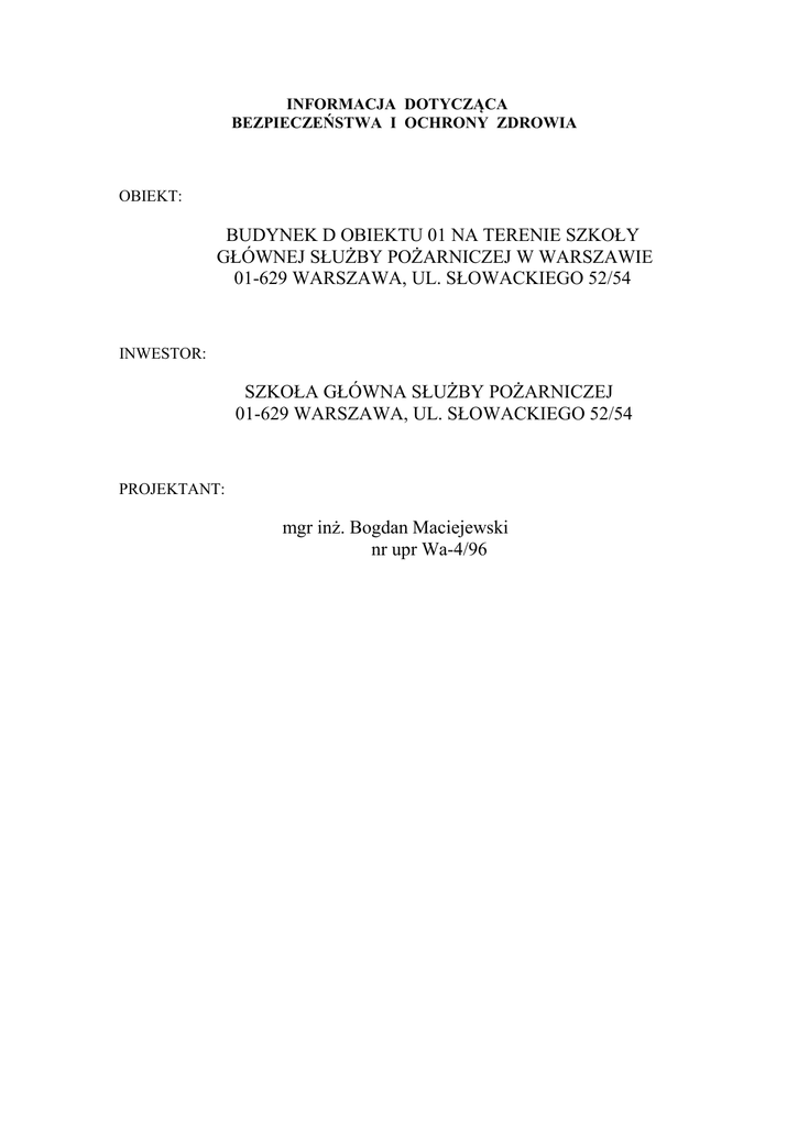 INFORMACJA DOTYCZĄCA BEZPIECZEŃSTWA I OCHRONY ZDROWIA OBIEKT: BUDYNEK D OBIEKTU 01 NA TERENIE SZKOŁY GŁÓWNEJ SŁUŻBY POŻARNICZEJ W WARSZAWIE 01-629 WARSZAWA, UL. SŁOWACKIEGO 52/54 INWESTOR: SZKOŁA GŁÓWNA SŁUŻBY POŻARNICZEJ 01-629 WARSZAWA, UL. SŁOWACKIEGO 52/54 PROJEKTANT: mgr inż. Bogdan Maciejewski nr upr Wa-4/96 1. Zakres robót Zakres robót obejmuje doposażenie w wentylację nawiewno-wywiewną. 2. Istniejące obiekty budowlane teren budowy stanowi budynek D obiektu 01 na terenie Szkoły Głównej Służby Pożarniczej w Warszawie przy ul. Słowackiego 52/54 3. Elementy zagospodarowania działki lub terenu stwarzające zagrożenie Należy zabezpieczyć teren uwzględniający zabezpieczenie prac na dachu budynku. 4. Przewidywane zagrożenia Przyczyny organizacyjne powstania wypadków przy pracy: a. niewłaściwa ogólna organizacja pracy a) niewłaściwa ogólna organizacja pracy nieprawidłowy podział pracy lub rozplanowanie zadań, niewłaściwe polecenia przełożonych, brak nadzoru, brak instrukcji posługiwania się czynnikiem materialnym, tolerowanie przez nadzór odstępstw od zasad bezpieczeństwa pracy, brak lub niewłaściwe przeszkolenie w zakresie BHP i ergonomii, dopuszczenie do pracy człowieka z przeciwwskazaniami lub bez badań lekarskich; b) niewłaściwa organizacja stanowiska pracy: niewłaściwe usytuowanie urządzeń na stanowiskach pracy, nieodpowiednie przejścia i dojścia, brak środków ochrony indywidualnej lub niewłaściwy ich dobór c) niewłaściwa eksploatacja czynnika materialnego; nadmierna eksploatacja czynnika materialnego, niedostateczna konserwacja czynnika materialnego, niewłaściwe naprawy i remonty czynnika materialnego. 5. Instruktaż pracowników Przed przystąpieniem do realizacji robót szczególnie niebezpiecznych pracownicy muszą zostać przeszkoleni w zakresie BHP, zasad postępowania w przypadku wystąpienia zagrożenia, zasad bezpośredniego nadzoru nad pracami szczególnie niebezpiecznymi przez wyznaczone w tym celu osoby, zasad stosowania przez pracowników środków ochrony indywidualnej oraz odzieży i obuwia roboczego, obsługi urządzeń mechanicznych. Przed przystąpieniem do robót ziemnych pracownicy muszą zostać zapoznani z zasadami korzystania z koparki oraz sposobu montowania szalunków. Przed przystąpieniem do przebudowy studni wodomierzowej pracownicy muszą zostać przeszkoleni w zakresie bezpiecznej obsługi dźwigu, piły do betonu, betoniarki, szlifierki kątowej. Szkolenia w dziedzinie BHP dla pracowników zatrudnionych na stanowiskach roboczych, przeprowadza się jako szkolenia wstępne i szkolenia okresowe. Szkolenia te przeprowadzane są w oparciu o programy poszczególnych rodzajów szkoleń. Szkolenia wstępne ogólne („instruktaż ogólny”) przechodzą wszyscy nowo zatrudniani pracownicy przed dopuszczeniem do wykonywania pracy. Obejmuje ono zapoznanie pracowników z podstawowymi przepisami BHP zawartymi w Kodeksie pracy, w układach zbiorowych pracy i regulaminach pracy, zasadami BHP obowiązującymi w danym zakładzie pracy oraz zasadami udzielania pierwszej pomocy. Szkolenia wstępne na stanowisku pracy („Instruktaż stanowiskowy”) powinien zapoznać pracowników z zagrożeniami występującymi na określonym stanowisku pracy, sposobami ochrony przed zagrożeniami, oraz metodami bezpiecznego wykonywania pracy na tym stanowisku. Pracownicy przed przystąpieniem do pracy, powinni być zapoznani z ryzykiem zawodowym związanym z pracą na danym stanowisku pracy. Fakt odbycia przez pracownika szkolenia wstępnego ogólnego, szkolenia wstępnego na stanowisku pracy oraz zapoznanie z ryzykiem zawodowym, powinien być potwierdzony przez pracownika na piśmie oraz odnotowany w aktach osobowych pracownika. Szkolenia wstępne podstawowe w zakresie BHP, powinny być przeprowadzone w okresie nie dłuższym niż 6 miesięcy od rozpoczęcia pracy na określonym stanowisku pracy. Szkolenia okresowe w zakresie BHP dla pracowników zatrudnionych na stanowiskach roboczych, powinny być przeprowadzane w formie instruktażu nie rzadziej niż raz na 3 lata, a na stanowiskach pracy, na których występują szczególne zagrożenia dla zdrowia lub życia oraz zagrożenia wypadkowe – nie rzadziej niż raz w roku. Na placu budowy powinny być udostępnione pracownikom do stałego korzystania, aktualne instrukcje BHP dotyczące wykonywania prac związanych z zagrożeniami wypadkowymi lub zagrożeniami zdrowia pracowników, obsługi maszyn i innych urządzeń technicznych, postępowania z materiałami szkodliwymi dla zdrowia i niebezpiecznymi, udzielania pierwszej pomocy. W/w instrukcje powinny określać czynności do wykonywania przed rozpoczęciem danej pracy, zasady i sposoby bezpiecznego wykonywania danej pracy, czynności do wykonania po jej zakończeniu oraz zasady postępowania w sytuacjach awaryjnych stwarzających zagrożenie dla życia lub zdrowia pracowników. Nie wolno dopuścić pracownika do pracy, do której wykonywania nie posiada wymaganych kwalifikacji lub potrzebnych umiejętności, a także dostatecznej znajomości przepisów oraz zasad BHP. 6. Środki techniczne i organizacyjne zapobiegające niebezpieczeństwom wynikającym z wykonywania robót budowlanych Roboty budowlane prowadzone będą na zewnątrz i wewnątrz użytkowanego budynku Domu Dziecka. Z tego względu przed rozpoczęciem prac należy: -poinformować użytkowników budynku o planowanych robotach, związanych z nimi niebezpieczeństwach, ograniczeniach w korzystaniu z obiektu i utrudnieniach, -wyznaczyć i oznakować strefy niebezpieczne, do których zabroniony jest wstęp użytkownikom – miejsca, w których aktualnie prowadzone są roboty demontażowe lub montażowe rurociągów i urządzeń, miejsca składowania materiałów, -zapewnić dostęp do energii elektrycznej oraz wody, -zapewnić możliwość odprowadzenia ścieków lub ich utylizacji, -urządzić pomieszczenia higieniczno-sanitarne i socjalne, -zapewni