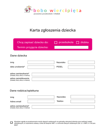 Karta zgłoszenia dziecka Chcę zapisać dziecko do: przedszkola żłobka Termin przyjęcia dziecka: Dane dziecka imię Nazwisko data urodzenia* PESEL adres zamieszkania* (miasto, kod, ulica, nr domu) adres zameldowania (miasto, kod, ulica, nr domu) Dane rodzica/opiekuna imię Nazwisko Adres email Telefon adres zamieszkania* (miasto, kod, ulica, nr domu) Telefon Wyrażam zgodę na przetwarzanie moich danych osobowych na potrzeby rekrutacji dziecka oraz realizacji zadań oświatowych, w rozumieniu ustawy z dnia 29 sierpnia 1997 r. o ochronie danych osobowych (Dz. U. z 1997r. nr 133 poz. 883)*