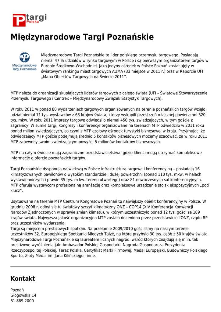 Międzynarodowe Targi Poznańskie Międzynarodowe Targi Poznańskie to lider polskiego przemysłu targowego. Posiadają niemal 47 % udziałów w rynku targowym w Polsce i są pierwszym organizatorem targów w Europie Środkowo-Wschodniej. Jako jedyny ośrodek w Polsce Poznań został ujęty w światowym rankingu miast targowych AUMA (33 miejsce w 2011 r.) oraz w Raporcie UFI „Mapa Obiektów Targowych na Świecie 2011”. MTP należą do organizacji skupiających liderów targowych z całego świata (UFI – Światowe Stowarzyszenie Przemysłu Targowego i Centrex – Międzynarodowy Związek Statystyk Targowych). W roku 2011 w ponad 80 wydarzeniach targowych organizowanych na terenie poznańskich targów wzięło udział niemal 11 tys. wystawców z 63 krajów świata, którzy wykupili przestrzeń o łącznej powierzchni 320 tys. mkw. W roku 2011 imprezy targowe odwiedziło niemal 450 tys. zwiedzających, w tym goście z zagranicy. W sumie targi, kongresy i konferencje organizowane na terenach MTP odwiedziło w 2011 roku ponad milion zwiedzających, co czyni z MTP czołowy ośrodek turystyki biznesowej w kraju. Przyjmując, że odwiedzający MTP goście podejmują średnio 5 kontaktów biznesowych możemy szacować, że w roku 2011 MTP zapewniły swoim zwiedzającym powyżej 5 milionów kontaktów biznesowych. MTP na całym świecie mają zagraniczne przedstawicielstwa, gdzie klienci mogą otrzymać kompleksowe informacje o ofercie poznańskich targów. Targi Poznańskie dysponują największą w Polsce infrastrukturą targową i konferencyjną – posiadają 16 klimatyzowanych pawilonów o wysokim standardzie i dużej powierzchni (ponad 110 tys. mkw. w halach wystawienniczych i prawie 35 tys. m kw. terenu otwartego) oraz 81 nowoczesnych sal konferencyjnych. MTP oferują wystawcom profesjonalną aranżację oraz kompleksowe urządzenie stoisk ekspozycyjnych „pod klucz”. Usytuowane na terenie MTP Centrum Kongresowe Poznań to największy obiekt konferencyjny w Polsce. W grudniu 2008 r. odbył się tu światowy szczyt klimatyczny ONZ – COP14 (XIV Konferencja Konwencji Narodów Zjednoczonych w sprawie zmian klimatu), w którym uczestniczyło ponad 12 tys. gości ze 189 krajów świata. Najwyższa jakość organizacyjna MTP została doceniona przez przedstawicieli ONZ, rządu RP oraz uczestników wydarzenia. Targi są miejscem prestiżowych spotkań. Na przełomie 2009/2010 gościliśmy na naszym terenie uczestników 32. Europejskiego Spotkania Młodych Taizé, na które przybyło 30 tys. osób z 50 krajów świata. Międzynarodowe Targi Poznańskie są laureatem licznych nagród, wśród których znajdują się m.in. tak prestiżowe wyróżnienia jak: Ambasador Polskiej Gospodarki, Nagroda Gospodarcza Prezydenta Rzeczypospolitej Polskiej, Teraz Polska, Certyfikat Marki Firmowej, Medal Europejski, Budowniczy Polskiego Sportu, Złoty Medal im. Jana Kilińskiego i inne. Kontakt Poznań Głogowska 14 61 869 2000 www.mtp.pl [email protected]