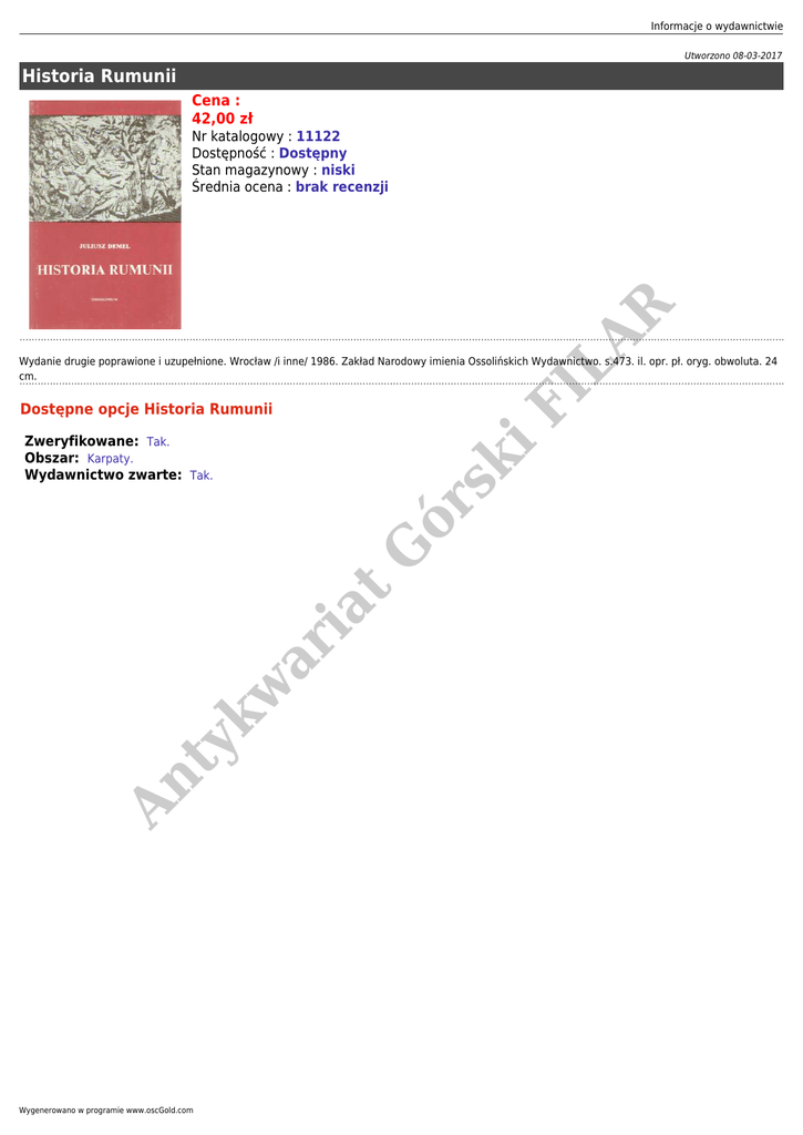 Informacje o wydawnictwie Utworzono 08-03-2017 Historia Rumunii Cena : 42,00 zł LA R Nr katalogowy : 11122 Dostępność : Dostępny Stan magazynowy : niski Średnia ocena : brak recenzji FI Wydanie drugie poprawione i uzupełnione. Wrocław /i inne/ 1986. Zakład Narodowy imienia Ossolińskich Wydawnictwo. s.473. il. opr. pł. oryg. obwoluta. 24 cm. Dostępne opcje Historia Rumunii An ty k w ar ia t G ór sk i Zweryfikowane: Tak. Obszar: Karpaty. Wydawnictwo zwarte: Tak. Wygenerowano w programie www.oscGold.com