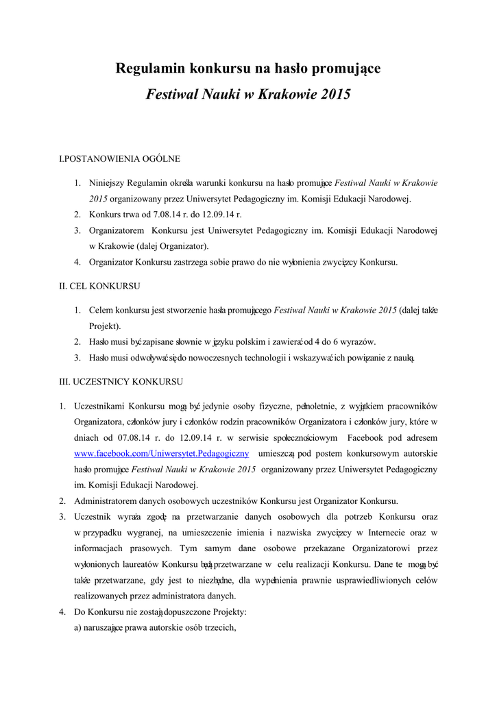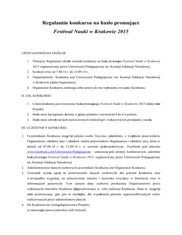 Regulamin konkursu na hasło promujące Festiwal Nauki w Krakowie 2015 I.POSTANOWIENIA OGÓLNE 1. Niniejszy Regulamin określa warunki konkursu na hasło promujące Festiwal Nauki w Krakowie 2015 organizowany przez Uniwersytet Pedagogiczny im. Komisji Edukacji Narodowej. 2. Konkurs trwa od 7.08.14 r. do 12.09.14 r. 3. Organizatorem Konkursu jest Uniwersytet Pedagogiczny im. Komisji Edukacji Narodowej w Krakowie (dalej Organizator). 4. Organizator Konkursu zastrzega sobie prawo do nie wyłonienia zwycięzcy Konkursu. II. CEL KONKURSU 1. Celem konkursu jest stworzenie hasła promującego Festiwal Nauki w Krakowie 2015 (dalej także Projekt). 2. Hasło musi być zapisane słownie w języku polskim i zawierać od 4 do 6 wyrazów. 3. Hasło musi odwoływać się do nowoczesnych technologii i wskazywać ich powiązanie z nauką. III. UCZESTNICY KONKURSU 1. Uczestnikami Konkursu mogą być jedynie osoby fizyczne, pełnoletnie, z wyjątkiem pracowników Organizatora, członków jury i członków rodzin pracowników Organizatora i członków jury, które w dniach od 07.08.14 r. do 12.09.14 r. w serwisie społecznościowym www.facebook.com/Uniwersytet.Pedagogiczny Facebook pod adresem umieszczą pod postem konkursowym autorskie hasło promujące Festiwal Nauki w Krakowie 2015 organizowany przez Uniwersytet Pedagogiczny im. Komisji Edukacji Narodowej. 2. Administratorem danych osobowych uczestników Konkursu jest Organizator Konkursu. 3. Uczestnik wyraża zgodę na przetwarzanie danych osobowych dla potrzeb Konkursu oraz w przypadku wygranej, na umieszczenie imienia i nazwiska zwycięzcy w Internecie oraz w informacjach prasowych. Tym samym dane osobowe przekazane Organizatorowi przez wyłonionych laureatów Konkursu będą przetwarzane w celu realizacji Konkursu. Dane te mogą być także przetwarzane, gdy jest to niezbędne, dla wypełnienia prawnie usprawiedliwionych celów realizowanych przez administratora danych. 4. Do Konkursu nie zostają dopuszczone Projekty: a) naruszające prawa autorskie osób trzecich, b) naruszające godnośćludzką, c) zawierające treści dyskryminujące ze względu na narodowość, płeć, rasę, przynależnośćetniczną, d) naruszające przekonania religijne lub polityczne, e) zagrażające psychicznemu lub moralnemu rozwojowi małoletnich, f) sprzyjające zachowaniom zagrażającym zdrowiu, bezpieczeństwu lub ochronie środowiska. 5. Organizator zastrzega sobie prawo niewykorzystania zwycięskiego Projektu. IV. ZASADY I PRZEBIEG KONKURSU 1. Przed przystąpieniem do Konkursu należy zapoznać się z Regulaminem Konkursu. 2. Udział w Konkursie polega na stworzeniu autorskiego hasła promującego Festiwal Nauki w Krakowie 2015 i zamieszczenie go pod postem konkursowym 3. Zakazane jest edytowanie wcześniej zamieszczonego hasła. Wpisy oznaczone jako edytowane, będą nieważne. 4. Nad właściwym przebiegiem Konkursu, wyłonieniem zwycięzcy oraz przyznaniem nagród czuwać będą Osoby Odpowiedzialne powołane przez Organizatora. 5. Wybór najlepszego Projektu zostanie dokonany przez jury powołane przez Organizatora. Decyzja jury jest ostateczna i niepodważalna. 6. Rozstrzygnięcie Konkursu – wyłonienie zwycięzcy - nastąpi w dniach 15-17.09.2014 r. 7. Publikacja wyników Konkursu nastąpi na fan page Uniwersytetu Pedagogicznego www.facebook.com/Uniwersytet.Pedagogiczny dnia 18.09.14 r. do godziny 15:00. V. NAGRODY 1. Nagrodą w Konkursie jest udział w profesjonalnym, wybranym przez zwycięzcę Konkursu szkoleniu z zakresu komunikacji i PR - organizowanym przez Ośrodek Badań Nad Mediami Uniwersytetu Pedagogicznego - w uzgodnionym z Organizatorem terminie. Ukończenie szkolenia będzie potwierdzone certyfikatem. 2. O przyznaniu nagród zwycięzca Konkursu zostanie powiadomiony drogą wiadomości Facebook na profil, z którego nadeszła odpowiedź konkursowa. 3. W przypadku braku możliwości skontaktowania się ze zwycięzcą Konkursu, nieodebrania nagrody (nieskorzystania ze szkolenia w uzgodnionym terminie), nagroda przepada. 4. Warunkiem uzyskania prawa do nagrody jest przesłanie przez zwycięzcę Konkursu, w odpowiedzi na informację Organizatora , danych umożliwiających jego identyfikację: imię i nazwisko oraz adres zamieszkania na terytorium RP, na adres: [email protected], nie później niż do 3 dni od daty powiadomienia na profilu Facebook przez Organizatora. 5. Zwycięzca Konkursu traci prawo do nagrody, bez jakichkolwiek roszczeń lub żądań wobec Organizatora, jeżeli nie przekaże danych osobowych lub przekazane dane osobowe okażą się błędne lub nieprawdziwe. 6. Nagroda nie podlega zamianie na inną nagrodę lub jej równowartośćpieniężną. 7. Zwycięzca nie może przenieśćpraw do przyznanej mu nagrody na osobę trzecią. 8. Organizator zastrzega, iż wartość nagrody stanowi jedyne wynagrodzenie za przeniesienie autorskich praw majątkowych do Projektu na polach eksploatacji wskazanych niżej (które zostaną przeniesione na podstawie zawartej osobnej umowy Organizatora ze zwycięzcą), we wszelkich formach i zakresach eksploatacji, w szczególności na następujących polach eksploatacji: utrwalania jakąkolwiek techniką, niezależnie od systemu, formatu i standardu na wszelkich nośnikach, w szczególności audiowizualnych, na kasetach wideo, na dysku komputerowym, DVD, dyskietce, na taśmie magnetycznej, na kliszy fotograficznej, płycie analogowej, płycie kompaktowej, na CD, VCD, CD Romie i plikach MP3, zwielokrotniania jakąkolwiek techniką, w szczególności światłoczułą, magnetyczną, audiowizualną, cyfrową (w jakimkolwiek systemie i na jakimkolwiek nośniku), optyczną, drukarską w dowolnej formie, techniką zapisu komputerowego, eksploatacji w całości lub we fragmentach w sieci on-line, w tym wprowadzania do pamięci komputera i/lub rozpowszechniania w sieci multimedialnej, w tym w Internecie i/lub udostępnianie w postaci cyfrowej w nieograniczonej ilości nadań i wielkości nakładów, publicznego