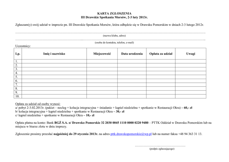 KARTA ZGŁOSZENIA III Drawskie Spotkania Morsów, 2-3 luty 2013r. Zgłaszam(y) swój udział w imprezie pn. III Drawskie Spotkania Morsów, która odbędzie się w Drawsku Pomorskim w dniach 2-3 lutego 2012r. …………………………………………………………………………………………………………………………………………………………. (nazwa klubu, adres) ……………………………………………………...………………………………………………………………………………………………….. (osoba do kontaktu, telefon, e-mail) Uczestnicy: Lp. Imię i nazwisko Miejscowość Data urodzenia Opłata za udział Uwagi 1. 2. 3. 4. 5. 6. 7. 8. 9. 10. Opłata za udział od osoby wynosi: a/ pobyt 2-3.02.2013r. (pakiet – nocleg + kolacja integracyjna + śniadanie + kąpiel niedzielna + spotkanie w Restauracji Okra) – 60,- zł b/ kolacja integracyjna + kąpiel niedzielna + spotkanie w Restauracji Okra – 30,- zł c/ kąpiel niedzielna + spotkanie w Restauracji Okra – 10,- zł Opłata płatna na konto: Bank BGŻ S.A. o/ Drawsko Pomorskie 32 2030 0045 1110 0000 0220 9480 – PTTK Oddział w Drawsku Pomorskim lub na miejscu w biurze zlotu w dniu imprezy. Zgłoszenie prosimy przesłać najpóźniej do 29 stycznia 2013r. na adres [email protected] lub na numer faksu +48 94 363 31 13. …………………..…………………… (podpis zgłaszającego)