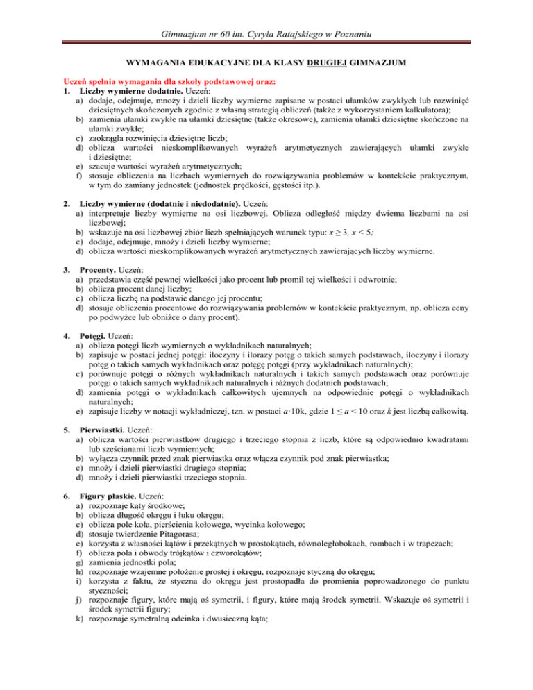 Gimnazjum nr 60 im. Cyryla Ratajskiego w Poznaniu WYMAGANIA EDUKACYJNE DLA KLASY DRUGIEJ GIMNAZJUM Uczeń spełnia wymagania dla szkoły podstawowej oraz: 1. Liczby wymierne dodatnie. Uczeń: a) dodaje, odejmuje, mnoży i dzieli liczby wymierne zapisane w postaci ułamków zwykłych lub rozwinięć dziesiętnych skończonych zgodnie z własną strategią obliczeń (także z wykorzystaniem kalkulatora); b) zamienia ułamki zwykłe na ułamki dziesiętne (także okresowe), zamienia ułamki dziesiętne skończone na ułamki zwykłe; c) zaokrągla rozwinięcia dziesiętne liczb; d) oblicza wartości nieskomplikowanych wyrażeń arytmetycznych zawierających ułamki zwykłe i dziesiętne; e) szacuje wartości wyrażeń arytmetycznych; f) stosuje obliczenia na liczbach wymiernych do rozwiązywania problemów w kontekście praktycznym, w tym do zamiany jednostek (jednostek prędkości, gęstości itp.). 2. Liczby wymierne (dodatnie i niedodatnie). Uczeń: a) interpretuje liczby wymierne na osi liczbowej. Oblicza odległość między dwiema liczbami na osi liczbowej; b) wskazuje na osi liczbowej zbiór liczb spełniających warunek typu: x ≥ 3, x < 5; c) dodaje, odejmuje, mnoży i dzieli liczby wymierne; d) oblicza wartości nieskomplikowanych wyrażeń arytmetycznych zawierających liczby wymierne. 3. Procenty. Uczeń: a) przedstawia część pewnej wielkości jako procent lub promil tej wielkości i odwrotnie; b) oblicza procent danej liczby; c) oblicza liczbę na podstawie danego jej procentu; d) stosuje obliczenia procentowe do rozwiązywania problemów w kontekście praktycznym, np. oblicza ceny po podwyżce lub obniżce o dany procent). 4. Potęgi. Uczeń: a) oblicza potęgi liczb wymiernych o wykładnikach naturalnych; b) zapisuje w postaci jednej potęgi: iloczyny i ilorazy potęg o takich samych podstawach, iloczyny i ilorazy potęg o takich samych wykładnikach oraz potęgę potęgi (przy wykładnikach naturalnych); c) porównuje potęgi o różnych wykładnikach naturalnych i takich samych podstawach oraz porównuje potęgi o takich samych wykładnikach naturalnych i różnych dodatnich podstawach; d) zamienia potęgi o wykładnikach całkowitych ujemnych na odpowiednie potęgi o wykładnikach naturalnych; e) zapisuje liczby w notacji wykładniczej, tzn. w postaci a·10k, gdzie 1 ≤ a < 10 oraz k jest liczbą całkowitą. 5. Pierwiastki. Uczeń: a) oblicza wartości pierwiastków drugiego i trzeciego stopnia z liczb, które są odpowiednio kwadratami lub sześcianami liczb wymiernych; b) wyłącza czynnik przed znak pierwiastka oraz włącza czynnik pod znak pierwiastka; c) mnoży i dzieli pierwiastki drugiego stopnia; d) mnoży i dzieli pierwiastki trzeciego stopnia. 6. Figury płaskie. Uczeń: a) rozpoznaje kąty środkowe; b) oblicza długość okręgu i łuku okręgu; c) oblicza pole koła, pierścienia kołowego, wycinka kołowego; d) stosuje twierdzenie Pitagorasa; e) korzysta z własności kątów i przekątnych w prostokątach, równoległobokach, rombach i w trapezach; f) oblicza pola i obwody trójkątów i czworokątów; g) zamienia jednostki pola; h) rozpoznaje wzajemne położenie prostej i okręgu, rozpoznaje styczną do okręgu; i) korzysta z faktu, że styczna do okręgu jest prostopadła do promienia poprowadzonego do punktu styczności; j) rozpoznaje figury, które mają oś symetrii, i figury, które mają środek symetrii. Wskazuje oś symetrii i środek symetrii figury; k) rozpoznaje symetralną odcinka i dwusieczną kąta; Gimnazjum nr 60 im. Cyryla Ratajskiego w Poznaniu l) konstruuje symetralną odcinka i dwusieczną kąta; m) konstruuje okrąg opisany na trójkącie oraz okrąg wpisany w trójkąt; n) rozpoznaje wielokąty foremne i korzysta z ich podstawowych własności. 7. Wyrażenia algebraiczne. Uczeń: a) opisuje za pomocą wyrażeń algebraicznych związki między różnymi wielkościami; b) oblicza wartości liczbowe wyrażeń algebraicznych; c) redukuje wyrazy podobne w sumie algebraicznej; d) dodaje i odejmuje sumy algebraiczne; e) mnoży jednomiany, mnoży sumę algebraiczną przez jednomian oraz, w nietrudnych przykładach, mnoży sumy algebraiczne; f) wyłącza wspólny czynnik z wyrazów sumy algebraicznej poza nawias. 8. Równania. Uczeń: zapisuje związki między wielkościami za pomocą równania pierwszego stopnia z jedną niewiadomą, w tym związki między wielkościami wprost proporcjonalnymi i odwrotnie proporcjonalnymi; a) zapisuje związki między wielkościami za pomocą równania pierwszego stopnia z jedną niewiadomą, w tym związki między wielkościami wprost proporcjonalnymi i odwrotnie proporcjonalnymi; b) rozwiązuje równania stopnia pierwszego z jedną niewiadomą; c) zapisuje związki między nieznanymi wielkościami za pomocą układu dwóch równań pierwszego stopnia z dwiema niewiadomymi; d) sprawdza, czy dana para liczb spełnia układ dwóch równań stopnia pierwszego z dwiema niewiadomymi; e) rozwiązuje układy równań stopnia pierwszego z dwiema niewiadomymi; f) za pomocą równań lub układów równań opisuje i rozwiązuje zadania osadzone w kontekście praktycznym. 9. Bryły. Uczeń: a) rozpoznaje graniastosłupy i ostrosłupy prawidłowe; b) oblicza pole powierzchni i objętość graniastosłupa prostego, ostrosłupa, walca, stożka, kuli (także w zadaniach osadzonych w kontekście praktycznym); c) zamienia jednostki objętości. 10. Statystyka opisowa i wprowadzenie do rachunku prawdopodobieństwa. Uczeń: a) interpretuje dane przedstawione za pomocą tabel, diagramów słupkowych i kołowych, wykresów; b) wyszukuje, selekcjonuje i porządkuje informacje z dostępnych źródeł; c) przedstawia dane w tabeli, za pomocą diagramu słupkowego lub kołowego; d) wyznacza średnią arytmetyczną i medianę zestawu danych; e) analizuje proste doświadczenia losowe (np. rzut kostką, rzut monetą, wyciąganie losu) i określa prawdopodobieństwa najprostszych zdarzeń w tych doświadczeniach (prawdopodobieńst