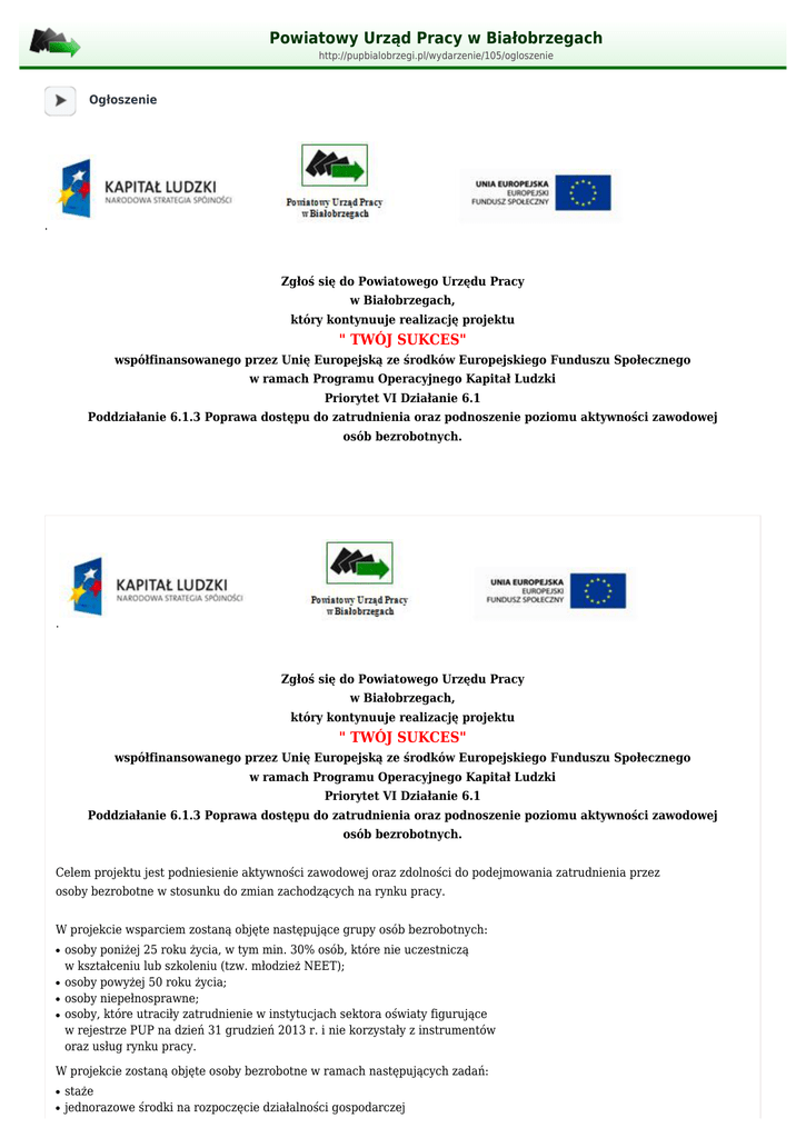 Powiatowy Urząd Pracy w Białobrzegach http://pupbialobrzegi.pl/wydarzenie/105/ogloszenie Ogłoszenie . Zgłoś się do Powiatowego Urzędu Pracy w Białobrzegach, który kontynuuje realizację projektu " TWÓJ SUKCES" współfinansowanego przez Unię Europejską ze środków Europejskiego Funduszu Społecznego w ramach Programu Operacyjnego Kapitał Ludzki Priorytet VI Działanie 6.1 Poddziałanie 6.1.3 Poprawa dostępu do zatrudnienia oraz podnoszenie poziomu aktywności zawodowej osób bezrobotnych. . Zgłoś się do Powiatowego Urzędu Pracy w Białobrzegach, który kontynuuje realizację projektu " TWÓJ SUKCES" współfinansowanego przez Unię Europejską ze środków Europejskiego Funduszu Społecznego w ramach Programu Operacyjnego Kapitał Ludzki Priorytet VI Działanie 6.1 Poddziałanie 6.1.3 Poprawa dostępu do zatrudnienia oraz podnoszenie poziomu aktywności zawodowej osób bezrobotnych. Celem projektu jest podniesienie aktywności zawodowej oraz zdolności do podejmowania zatrudnienia przez osoby bezrobotne w stosunku do zmian zachodzących na rynku pracy. W projekcie wsparciem zostaną objęte następujące grupy osób bezrobotnych: ● ● ● ● osoby poniżej 25 roku życia, w tym min. 30% osób, które nie uczestniczą w kształceniu lub szkoleniu (tzw. młodzież NEET); osoby powyżej 50 roku życia; osoby niepełnosprawne; osoby, które utraciły zatrudnienie w instytucjach sektora oświaty figurujące w rejestrze PUP na dzień 31 grudzień 2013 r. i nie korzystały z instrumentów oraz usług rynku pracy. W projekcie zostaną objęte osoby bezrobotne w ramach następujących zadań: ● ● staże jednorazowe środki na rozpoczęcie działalności gospodarczej Ogólna wartość projektu - 4 438 500,00 zł Okres realizacji projektu - 01.01.2014 r. - 31.12.2014 r. Osoby bezrobotne zainteresowane udziałem w projekcie, spełniające wymienione kryteria, oraz pracodawcy chcący zorganizować dla osób bezrobotnych miejsca pracy w ramach stażu, prosimy o zgłaszanie się do Powiatowego Urzędu Pracy w Białobrzegach, ul. Składowa 5, lub kontakt telefoniczny: 048 613 24 80 wew.107, 048 613 43 80 wew.107