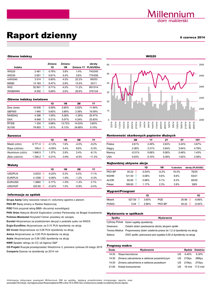 Raport dzienny 6 czerwca 2014 Gł€wne indeksy WIG20 Zmiana 1D Zmiana 1M obroty Zmiana 1Y PLN/USDm WIG20 2 481 0.76% 3.8% 1.4% 743/245 WIG30 2 651 0.81% 4.4% 3.6% 774/256 mWIG40 3 514 0.80% 4.0% 22.2% 160/53 MIS80 13 163 0.47% 2.8% 13.5% 33/11 WIG 52 901 0.71% 4.0% 11.2% 951/314 8 502 0.69% 2.6% 26.6% 375/124 2500 50 2450 40 2400 30 2350 20 1D 1M 3M 1Y 16 836 0.59% 2.65% 2.52% 11.94% S&P500 1 940 0.65% 3.89% 3.38% 19.59% NASDAQ 4 296 1.05% 5.28% -1.28% 25.47% DAX 9 948 0.21% 5.07% 4.24% 22.83% RTSI$ 1 334 0.68% 13.72% 14.53% 3.65% XU100 79 803 1.81% 6.13% 24.68% 5.15% 1D 1M 3M 1Y 6 771.0 -0.12% 1.6% -4.0% -9.2% Polska Ropa (USD/bbl) 29/5/14 26/5/14 21/5/14 16/5/14 8/5/14 13/5/14 5/5/14 29/4/14 24/4/14 17/4/14 9/4/14 14/4/14 4/4/14 1/4/14 27/3/14 24/3/14 2250 19/3/14 0 Rentowność skarbowych papier€w dłużnych Surowce Miedź (USD/t) 2300 10 3/3/14 Dow Jones 14/3/14 Gł€wne indeksy światowe 6/3/14 WIGBANKI 60 11/3/14 Indeks 3M 1Y 2Y 5Y 10Y 2.61% 2.49% 2.63% 3.24% 3.67% 109.4 -0.59% 3.4% 9.6% -0.3% Węgry 2.36% 2.31% 2.64% 3.64% 4.79% Aluminium (USD/t) 1 846.5 1.37% 3.9% 3.4% -6.1% Niemcy -0.01% 0.06% 0.06% 0.48% 1.43% Złoto (USD/OZ) 1 256.2 0.21% -3.9% -6.9% -11.3% USA 0.03% 0.10% 0.38% 1.62% 2.58% Najbardziej aktywne akcje Waluty 1D 1M 3M 1Y USD/PLN 3.0233 -0.22% 0.3% 0.2% -7.1% EUR/PLN 4.1298 -0.06% -1.6% -1.2% -4.3% EUR/USD 1.3660 0.17% -1.9% -1.4% 3.1% USD/HUF 223.92 -0.32% 1.0% -0.8% -0.4% 1D 1M % obrot€w obroty (PLN/USD) 40.22 -0.54% -0.2% 10.3% 76/25 KGHM 121.50 0.08% 9.6% 8.6% 63/21 ALIOR 82.80 0.98% 5.1% 8.2% 60/20 Pekao 189.60 1.17% 2.3% 3.9% 28/9 PKO BP Wygrani/Przegrani Informacje ze sp€łek 1D 1D Grupa Azoty Ceny nawoz‚w niższe r/r, wolumeny zgodnie z planem Mbank 527.50 3.65% PGE 20.96 -0.66% PKO BP Będą zmiany w Radzie Nadzorczej PGNiG 5.04 2.86% PKO BP 40.22 -0.54% PGE Fitch przyznał rating BBB+ dla emisji euroobligacji PKN Orlen Nabycie Birchill Exploration Limited Partnership od Bregal Investments Polimex-Mostostal Krzysztof Cetnar powołany do zarządu Wydarzenia w sp€łkach Sp€łka Wydarzenie Eurotel Akcjonariusz za przełożeniem decyzji o podziale zysku na NWZA Cyfrowy Polsat Dzień wypłaty dywidendy Ergis-Eurofilms Akcjonariusze za 0.10 PLN dywidendy na akcję Greeneco ED Invest Akcjonariusze za 0.06 PLN dywidendy na akcję Teresa Medica Proponowany dzień ustalenia prawa do 1,2 zł dywidendy na akcję Amica Akcjonariusze za 3.50 PLN dywidendy na akcję Selena Ostatni dzień zawieszenia obrotu akcjami sp‚łki ZWZ sp‚łki; planowana jest wypłata 0,28 zł dywidendy na akcję Asbis Akcjonariusze za 0.06 USD dywidendy na akcję NWR Spadek ratingu do CC od Agencji S&P CD Projekt Ruszyła przedsprzedaż Wiedźmina 3, premiera rynkowa 24 lutego 2015 Comperia Szansa na dywidendę za 2014 rok Prognozy makro Godz. Wydarzenie Będzie Ostatnio 14:30 Stopa bezrobocia US 6.40% 6.30% 14:30 Zmiana zatrudnienia w sektorze pozarolniczym US 215tys. 288tys. 14:30 Zmiana zatrudnienia w sektorze prywatnym US 210tys. 273tys. 21:00 Kredyt konsumencki US 16 mld 17.5 mld Informacje dotyczące powiązań Millennium DM ze sp‚łką, będącą przedmiotem niniejszego raportu oraz pozostałe informacje, wymagane przez Rozporządzenie RM z dnia 19.X.2005 roku umieszczone zostały na ostatniej stronie raportu. Informacje ze sp€łek Grupa Azoty Ceny nawoz€w niższe r/r, wolumeny zgodnie z planem Andrzej Skolmowski, wiceprezes Zarządu poinformował, że z perspektywy pierwszego p‚łrocza rynek ocenia dobrze,a wolumeny są zgodne z planem, chociaż ceny podstawowych nawoz‚w sp‚łki spadły o kilka procent r/r. Wiceprezes dodał, że widoczna jest poprawa w segmencie poliamid‚w (wzrost cen), natomiast trudna sytuacja utrzymuje się w segmencie kaprolaktamu. PKO BP Będą zmiany w Radzie Nadzorczej Bank poinformował o otrzymaniu od Skarbu Państwa Rzeczpospolitej Polskiej, akcjonariusza reprezentującego ponad 5% kapitału zakładowego Banku, żądanie uzupełnienia porządku obrad ZWZA zwołanego na dzień 26 czerwca br. o punkt przewidujący podjęcie uchwał w sprawie odwołania ze składu Rady Nadzorczej Banku. PGE Fitch przyznał rating BBB+ dla emisji euroobligacji Agencja Fitch przyznała euroobligacjom o wartości 500 mln EUR emitowanym przez PGE Sweden, sp‚łkę zależną, rating "BBB+". W maju PGE i PGE Sweden ustanowiły program emisji euroobligacji średnioterminowych maksymalnie do 2 mld EUR o minimalnym terminie zapadalności 1 rok, w ramach kt‚rej przed kilkoma dniami PGE Sweden wyemitowała pięcioletnie euroobligacje o wartości 500 mln EUR (o rentowności 1.625%). PKN Orlen Nabycie Birchill Exploration Limited Partnership od Bregal Investments TriOil Resources Ltd., sp‚łka pośrednio 100% zależna sfinalizowała w dniu 5 czerwca br. Nabycie 100% udział‚w sp‚łki Birchill Exploration Limited Partnership za cenę 255.6 mln CAD (707.5 mln PLN). Transakcja została sfinansowana przez podwyższenie kapitału TriOil (dokonane przez ORLEN Upstream International B.V.) oraz wykorzystanie dostępnej linii kredytowej TriOil, a zamknięcie transakcji nastąpiło po uzyskaniu zgody kanadyjskiego Komisarza ds. Konkurencji. Birchill z siedzibą w Calgary, jest sp‚łką zaangażowaną w poszukiwanie i wydobycie ropy naftowej i gazu, a eksploatowane przez Birchill złoża ropy i gazu w prowincji Alberta w Kanadzie posiada zasoby (2P) w wysokości około 26.6 mln boe. Średnie wydobycie Birchill w I kw. br. wyniosło około 3.4 tys. boe dziennie. Polimex-Mostostal Krzysztof Cetnar powołany do zarządu Rada nadzorcza powołała w dniu 5 czerwca br. Krzysztofa Cetnara do składu Zarządu na stanowisko Wiceprezesa Zarządu z dniem 6 czerwca br. na okres trzyletniej indywidualnej kadencji. Eurotel Akcjonariusz za przełożeniem decyzji o podziale zysku na NWZA Akcjonariusz sp‚łki dysponujący co najmniej 1/20 kapitału zgłosił propozycję uchwały na ZWZA zwołane na dzień 26 czerwca br. Zgodnie z proponowaną uchwałą decyzja o podziale zysk
