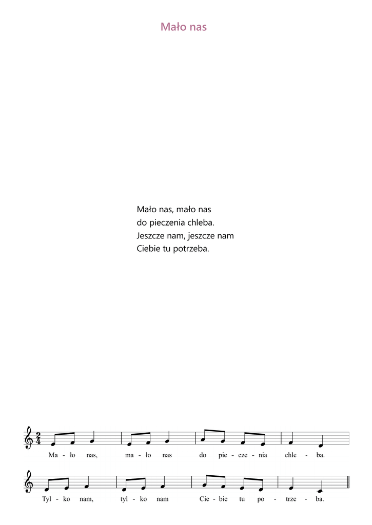 Mało nas Mało nas, mało nas do pieczenia chleba. Jeszcze nam, jeszcze nam Ciebie tu potrzeba.
