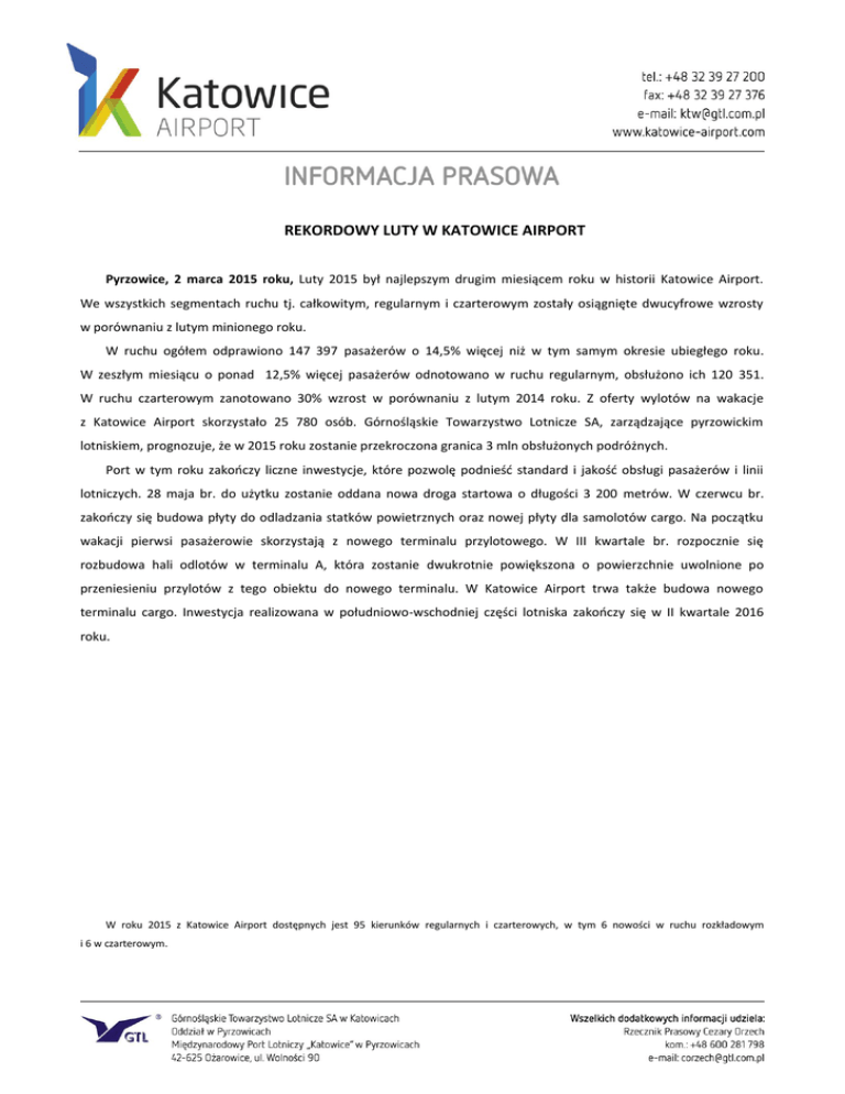 REKORDOWY LUTY W KATOWICE AIRPORT Pyrzowice, 2 marca 2015 roku, Luty 2015 był najlepszym drugim miesiącem roku w historii Katowice Airport. We wszystkich segmentach ruchu tj. całkowitym, regularnym i czarterowym zostały osiągnięte dwucyfrowe wzrosty w porównaniu z lutym minionego roku. W ruchu ogółem odprawiono 147 397 pasażerów o 14,5% więcej niż w tym samym okresie ubiegłego roku. W zeszłym miesiącu o ponad 12,5% więcej pasażerów odnotowano w ruchu regularnym, obsłużono ich 120 351. W ruchu czarterowym zanotowano 30% wzrost w porównaniu z lutym 2014 roku. Z oferty wylotów na wakacje z Katowice Airport skorzystało 25 780 osób. Górnośląskie Towarzystwo Lotnicze SA, zarządzające pyrzowickim lotniskiem, prognozuje, że w 2015 roku zostanie przekroczona granica 3 mln obsłużonych podróżnych. Port w tym roku zakończy liczne inwestycje, które pozwolę podnieść standard i jakość obsługi pasażerów i linii lotniczych. 28 maja br. do użytku zostanie oddana nowa droga startowa o długości 3 200 metrów. W czerwcu br. zakończy się budowa płyty do odladzania statków powietrznych oraz nowej płyty dla samolotów cargo. Na początku wakacji pierwsi pasażerowie skorzystają z nowego terminalu przylotowego. W III kwartale br. rozpocznie się rozbudowa hali odlotów w terminalu A, która zostanie dwukrotnie powiększona o powierzchnie uwolnione po przeniesieniu przylotów z tego obiektu do nowego terminalu. W Katowice Airport trwa także budowa nowego terminalu cargo. Inwestycja realizowana w południowo-wschodniej części lotniska zakończy się w II kwartale 2016 roku. W roku 2015 z Katowice Airport dostępnych jest 95 kierunków regularnych i czarterowych, w tym 6 nowości w ruchu rozkładowym i 6 w czarterowym.