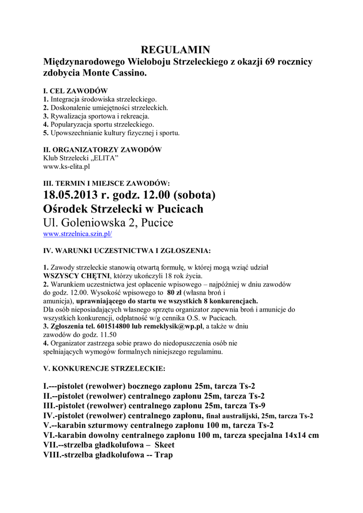 REGULAMIN Międzynarodowego Wieloboju Strzeleckiego z okazji 69 rocznicy zdobycia Monte Cassino. I. CEL ZAWODÓW 1. Integracja środowiska strzeleckiego. 2. Doskonalenie umiejętności strzeleckich. 3. Rywalizacja sportowa i rekreacja. 4. Popularyzacja sportu strzeleckiego. 5. Upowszechnianie kultury fizycznej i sportu. II. ORGANIZATORZY ZAWODÓW Klub Strzelecki „ELITA” www.ks-elita.pl III. TERMIN I MIEJSCE ZAWODÓW: 18.05.2013 r. godz. 12.00 (sobota) Ośrodek Strzelecki w Pucicach Ul. Goleniowska 2, Pucice www.strzelnica.szin.pl/ IV. WARUNKI UCZESTNICTWA I ZGŁOSZENIA: 1. Zawody strzeleckie stanowią otwartą formułę, w której mogą wziąć udział WSZYSCY CHĘTNI, którzy ukończyli 18 rok życia. 2. Warunkiem uczestnictwa jest opłacenie wpisowego – najpóźniej w dniu zawodów do godz. 12.00. Wysokość wpisowego to 80 zł (własna broń i amunicja), uprawniającego do startu we wszystkich 8 konkurencjach. Dla osób nieposiadających własnego sprzętu organizator zapewnia broń i amunicje do wszystkich konkurencji, odpłatność w/g cennika O.S. w Pucicach. 3. Zgłoszenia tel. 601514800 lub [email protected], a także w dniu zawodów do godz. 11.50 4. Organizator zastrzega sobie prawo do niedopuszczenia osób nie spełniających wymogów formalnych niniejszego regulaminu. V. KONKURENCJE STRZELECKIE: I.---pistolet (rewolwer) bocznego zapłonu 25m, tarcza Ts-2 II.--pistolet (rewolwer) centralnego zapłonu 25m, tarcza Ts-2 III.-pistolet (rewolwer) centralnego zapłonu 25m, tarcza Ts-9 IV.-pistolet (rewolwer) centralnego zapłonu, finał australijski, 25m, tarcza Ts-2 V.--karabin szturmowy centralnego zapłonu 100 m, tarcza Ts-2 VI.-karabin dowolny centralnego zapłonu 100 m, tarcza specjalna 14x14 cm VII.--strzelba gładkolufowa – Skeet VIII.-strzelba gładkolufowa -- Trap 1. Strzelanie dokładne – pistolet (rewolwer) bocznego zapłonu -broń bocznego zapłonu w kalibrze 22 LR (5,6 mm), -ilość strzałów: 13 z czego najlepszych 10 ocenianych -postawa - stojąc z wolnej ręki lub oburącz -czas: 10 min -maksymalna ilość punktów do uzyskania – 100 pkt. 2. Strzelanie dokładne – pistolet (rewolwer) centralnego zapłonu -broń centralnego zapłonu w kalibrze 7,62 – 11,43 mm, -ilość strzałów: 13 z czego najlepszych 10 ocenianych -postawa - stojąc z wolnej ręki lub oburącz -czas: 10 min -maksymalna ilość punktów do uzyskania – 100 pkt. 3. Strzelanie dynamiczne pistolet (rewolwer) centralnego zapłonu -broń – pistolet bocznego zapłonu w kalibrze 7,62 – 11,43 mm -ilość strzałów: 10 ocenianych 2 x po 5 strzałów z wymianą magazynka Seria 5 strzałów w czasie 10 sekund -postawa - stojąc z wolnej ręki lub oburącz -maksymalna ilość punktów do uzyskania – 100 pkt. 4. Konkurencja finał australijski -broń centralnego zapłonu w kalibrze 7,62 – 11,43 mm, -postawa - stojąc z wolnej ręki lub oburącz -czas – jedna minuta na jeden strzał -każdy zawodnik ładuje magazynek 1 nabojem i oddaje jeden strzał po każdej serii odpada zawodnik, który uzyskał najsłabszy wynik i tak aż do wyłonienia zwycięzcy. W przypadku uzyskania przez dwóch i więcej zawodników takiego samego najgorszego wyniku, będzie prowadzona dogrywka pomiędzy tymi zawodnikami. 5. Strzelanie dokładne- karabin szturmowy centralnego zapłonu (samopowtarzalny zasilany nabojem pośrednim) z mechanicznymi przyrządami celowniczymi. -broń – karabin centralnego zapłonu w kalibrze 5,56 – 11,43 mm, -ilość strzałów: 13 z czego najlepszych 10 ocenianych -postawa – leżąc lub siedząc -czas: 10 min -maksymalna ilość punktów do uzyskania – 100 pkt. 6. Strzelanie dokładne- karabin dowolny centralnego zapłonu z dowolnymi przyrządami celowniczymi (optyka itp.). -broń – karabin centralnego zapłonu w dowolnym kalibrze, -ilość strzałów: 13 z czego najlepszych 10 ocenianych -postawa – leżąc lub siedząc -czas: 15 min -maksymalna ilość punktów do uzyskania – 100 pkt. 7. Strzelanie Trap -broń – strzelba gładkolufowa, -ilość celi: 10, max ilość strzałów 20 -maksymalna ilość punktów do uzyskania – 10 pkt. 8. Strzelanie Skeet -broń – strzelba gładkolufowa, -ilość celi: 10, max ilość strzałów 20 -maksymalna ilość punktów do uzyskania – 10 pkt. VI. ZASADY I OCENA ZAWODÓW: -Zawody strzeleckie rozgrywane będą zgodnie z regulaminem zawodów oraz przepisami Polskiego Związku Strzelectwa Sportowego. -Decyzje sędziego głównego są ostateczne. VII. BROŃ I AMUNICJA 1. Broń i amunicja własna lub zabezpieczona przez organizatora zawodów (pistolety, karabiny, strzelby). 2. Organizator nie zapewnia sprzętu do oceny tarcz (lunet). VIII. KLASYFIKACJA Indywidualna dla każdego uczestnika w danej konkurencji oraz za wielobój. O kolejności zawodników decyduje suma punktów zdobytych w danej konkurencji. W przypadku uzyskania równej ilości przestrzelin w danej konkurencji przez dwóch i więcej zawodników, o kolejności decyduje liczba uzyskanych 10, 9, 8 itd. IX. TROFEA SPORTOWE:. Za zwycięstwo w konkurencji 1, 2, 3, 4, 5, 6, 7, 8: medal Za II, III miejsce w konkurencji 1, 2, 3, 4, 5, 6, 7, 8: medal Dla zwycięzcy w klasyfikacji generalnej (niespodzianka) X. OSOBY FUNKCYJNE: Sędzia główny/ obserwator ZZSS: Remigiusz Łysik Sędzia główny - pistolet: Robert Bojaruniec Sędzia główny - karabin: Karol Pieszak Sędzia główny - strzelba: Sebastian Milczanowski Komisja klasyfikacyjna: Andrzej Sulawiak
