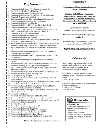 Pozdrowienia 1. 2. 3. 4. 5. 6. 7. 8. 9. 10. 11. 12. 13. 14. 15. 16. 17. 18. 19. 20. 21. 22. 23. 24. 25. 26. 27. 28. 29. 30. 31. 32. 33. 34. 35. 36. 37. 38. 39. 40. 41. 42. 43. Pozdrowienia dla Łukasza Ch. z IIa od dziewczyn z IIIa Dla Agi R, Izy K, Julity S, od Lidosławy O. Pozdrowienia dla Marcina K. od Magdy Oleksy Pozdrowienia dla Mateusza W. od Magdy, And eli i Rumuna Pozdro dla Szymona Jurgi od Kingi Serdeczne pozdrowienia dla p. Lidki od pasa erki na gap Pozdrowienia dla lepaka od dwóch wielbicielek ;) Pozdrowienia dla Liska od Malwi ki Pozdrowienia dla M.B, K.D, D.S, Mariki i A.B od Kini P. Pozdrowienia dla p. Gawrona od chłopaków z Ib Dla wszystkich m czyzn z grona pedagogicznego od wszystkich kobiet z grona pedagogicznego. Bobrzyce z Tuplic Pozdro dla p. Basi od jej ukochanej IIIa Pozdrowienia dla Adusia z IIa od kolegi z klasy Pozdrowienia dla klasy IIb od Marysi Pozdrowienia dla moich kochanych współpracowników z samorz du od Agusi. PS Gdzie moja ró a?! ;) Serdeczne pozdrowienia dla Karoliny Zaborowskiej za wsparcie. Nie ma drugiej takiej osoby jak ty. Dzi ki za poprzednie pozdrowienia Serdeczne pozdrowienia i buziaki dla Martusi O. Z IIIb od Natalki z IIa Pozdrawiam moj ukochan Lidosław Orkisz. Aga Roman. PS kiedy znów gonimy autobus?! ;) Pozdrowienia dla niu ki, barana z Cmentarnej od moka. PS I tak Ci sprzedam!!! Pozdrowienia dla mojego kochanego Zwierzaczka, Pimpusia i G zusia. Pozdrowienia dla Agi i Kami ki, Oli, Patrycji i Karoliny od Lidzi Pozdro dla Karoliny i Ka ki (było super wiecie gdzie) H …! Serdeczne buziaczki dla Parysi, Kami ki, Agusi, Lidziusi i Karoliniusi od Olusi Pozdrowienia dla całego grona pedagogicznego od super fajnej IIIa Pozdrowienia dla wszystkich ołnierzy z IIIa Dla mojej Podeszwy. Pompon Serdeczne pozdrowionka dla całej IIa; dla psiapsióły Marty i dla Rafała od Nati Serdeczne pozdrowienia dla Natalki i Wojtka z IIa od Martusi z IIIb Dla BUCZACZITY. Pompon & Podeszwa spółka z.o.o. Pozdrowienia dla Anety Sakowskiej, Moniki Pachnik, Marleny Korobczuk i Ewy Kamie skiej od Ewki Sz. Pozdrowienia dla Ewy Szczupak, Moniki P. Ewy Kamie skiej i dla całej IIc od Anety S. Dla pompona. Podeszwa Pozdro dla wszystkich dziewczyn z IIIa od Kaszy Pozdrowionka dla Kaszy od Kaszy manny z jednej półki Pozdrowienia dla pompona i podeszwy od Buczaczity (lubi was ) pozdrowienia dla pysznej kanapki Dla Kiki i Diany z Ib Dla p. Gawrona od pysznego serniczka Pozdrowienia dla Konika z IIIc od Ani Pozdrowienia dla Kini z Ia od Monisi i Mariolki Serdeczne pozdrowienia dla Damiana Cz. Od I.W. Pozdrowienia dla Ariela od Michała i Huberta Pozdrowienia dla ukochanej p. Władzi od jej ukochanej Iii Monika Wojda i Mariola Abrachamowska ! " # $ % & $# % '(( ) ! * * %!)# +! % , $+%) $ ! *% $ % %! % . /((0#" $# ! % % "1 ! # "2 % !3 # $ !# (444560789 : %; $# % $# % A $ $# % $ !% % !%< %! )# * !) # +% > # ! %! = /(( "+ * %! ! ! )# $ +! ?@"A !) )B(445''9056 > %! C % ' B= Fajne dowcipy Afryka rodzina pawianów zjada obiad. W pewnej chwili matka zwraca si do synka: -Jedz kulturalnie tego banana no em i widelcem, a nie jak ludzie- łapami... Leci mucha, a tu nagle wpadła na drzewo i spadła na ziemi . Po chwili wstaje, otrzepuje si i mówi: - To se kurde polatałam Przychodzi zm czony turysta do bacy w Dolinie Chochołowskiej i pyta: - Baco, macie to wrz tek? - Jest, ino zimny REDAKCJA Opiekunowie: Agnieszka Roman Redaktor Naczelny: Marcelina Tarnowska Zast pca: Ines Wrzesi ski Skarbnik: A ka elisko, Judyta Szulc Made by: Ania Rogo a, Marcelina Sarnowska