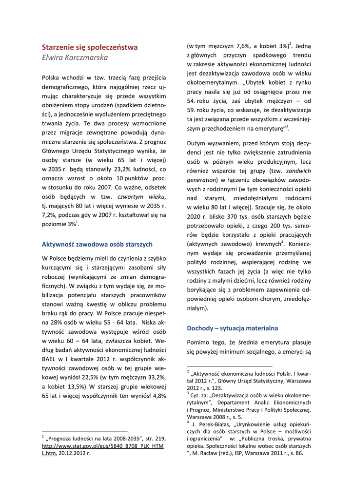 Starzenie się społeczeństwa Elwira Karczmarska Polska wchodzi w tzw. trzecią fazę przejścia demograficznego, która najogólniej rzecz ujmując charakteryzuje się przede wszystkim obniżeniem stopy urodzeń (spadkiem dzietności), a jednocześnie wydłużeniem przeciętnego trwania życia. Te dwa procesy wzmocnione przez migracje zewnętrzne powodują dynamiczne starzenie się społeczeństwa. Z prognoz Głównego Urzędu Statystycznego wynika, że osoby starsze (w wieku 65 lat i więcej) w 2035 r. będą stanowiły 23,2% ludności, co oznacza wzrost o około 10 punktów proc. w stosunku do roku 2007. Co ważne, odsetek osób będących w tzw. czwartym wieku, tj. mających 80 lat i więcej wyniesie w 2035 r. 7,2%, podczas gdy w 2007 r. kształtował się na poziomie 3%1. Aktywność zawodowa osób starszych W Polsce będziemy mieli do czynienia z szybko kurczącymi się i starzejącymi zasobami siły roboczej (wynikającymi ze zmian demograficznych). W związku z tym wydaje się, że mobilizacja potencjału starszych pracowników stanowi ważną kwestię w obliczu problemu braku rąk do pracy. W Polsce pracuje niespełna 28% osób w wieku 55 - 64 lata. Niska aktywność zawodowa występuje wśród osób w wieku 60 – 64 lata, zwłaszcza kobiet. Według badań aktywności ekonomicznej ludności BAEL w I kwartale 2012 r. współczynnik aktywności zawodowej osób w tej grupie wiekowej wyniósł 22,5% (w tym mężczyzn 33,2%, a kobiet 13,5%) W starszej grupie wiekowej 65 lat i więcej współczynnik ten wyniósł 4,8% 1 „Prognoza ludności na lata 2008-2035”, str. 219, http://www.stat.gov.pl/gus/5840_8708_PLK_HTM L.htm, 20.12.2012 r. (w tym mężczyzn 7,6%, a kobiet 3%)2. Jedną z głównych przyczyn spadkowego trendu w zakresie aktywności ekonomicznej ludności jest dezaktywizacja zawodowa osób w wieku okołoemerytalnym. „Ubytek kobiet z rynku pracy nasila się już od osiągnięcia przez nie 54. roku życia, zaś ubytek mężczyzn – od 59. roku życia, co wskazuje, że dezaktywizacja ta jest związana przede wszystkim z wcześniejszym przechodzeniem na emeryturę”3. Dużym wyzwaniem, przed którym stoją decydenci jest nie tylko zwiększenie zatrudnienia osób w późnym wieku produkcyjnym, lecz również wsparcie tej grupy (tzw. sandwich generation) w łączeniu obowiązków zawodowych z rodzinnymi (w tym konieczności opieki nad starymi, zniedołężniałymi rodzicami w wieku 80 lat i więcej). Szacuje się, że około 2020 r. blisko 370 tys. osób starszych będzie potrzebowało opieki, z czego 200 tys. seniorów będzie korzystało z opieki pracujących (aktywnych zawodowo) krewnych4. Koniecznym wydaje się prowadzenie przemyślanej polityki rodzinnej, wspierającej rodzinę we wszystkich fazach jej życia (a więc nie tylko rodziny z małymi dziećmi, lecz również rodziny borykające się z problemem zapewnienia odpowiedniej opieki osobom chorym, zniedołężniałym). Dochody – sytuacja materialna Pomimo tego, że średnia emerytura plasuje się powyżej minimum socjalnego, a emeryci są 2 „Aktywność ekonomiczna ludności Polski. I kwartał 2012 r.”, Główny Urząd Statystyczny, Warszawa 2012 r., s. 123. 3 Cyt. za: „Dezaktywizacja osób w wieku okołoemerytalnym”, Departament Analiz Ekonomicznych i Prognoz, Ministerstwo Pracy i Polityki Społecznej, Warszawa 2008 r., s. 5. 4 J. Perek-Białas, „Urynkowienie usług opiekuńczych dla osób starszych w Polsce – możliwości i ograniczenia” w: „Publiczna troska, prywatna opieka. Społeczności lokalne wobec osób starszych ”, M. Racław (red.), ISP, Warszawa 2011 r., s. 86. grupą stosunkowo mało zagrożoną ubóstwem5 to należy pamiętać, iż jest to grupa zróżnicowana, a ich wydatki mają niekorzystną strukturę (z dużym udziałem wydatków stałych) i charakteryzują się małą elastycznością. W jednoosobowych gospodarstwach domowych emerytów wydatki na użytkowanie mieszkania i nośniki energii stanowiły w 2009 r. 28,7% wydatków ogółem, zaś na zdrowie 10,2% (przy średniej dla wszystkich gospodarstw domowych odpowiednio 11,9% oraz 5,3%)6. Zgodnie z wynikami badań CBOS z 2010 r. prawie co drugi (46%) ankietowany w starszym wieku zadeklarował, że żyje na średnim poziomie tzn. starcza mu na codzienne wydatki, ale na poważne zakupy musi oszczędzać. Niewiele mniej osób zadeklarowało, że żyje skromnie i musi na co dzień bardzo oszczędnie gospodarować środkami, a 6% badanych wyraziło opinię, że żyje biednie i ma problemy z zaspokojeniem nawet podstawowych potrzeb7. Badania Elżbiety Tarkowskiej wykazały, że ok. 6,3% emerytów żyje w sferze skrajnego ubóstwa8. Niemniej jednak sytuacja materialna osób starszych w Polsce nie jest zła na tle dramatycznej sytuacji dzieci/młodzieży do lat 19, bezrobotnych czy sięgającym 40% ubóstwem rodzin wielodzietnych9. Bardzo ważnym problemem, przed którym stoją dziś decydenci jest kwestia kształtu sys5 Przeciętna emerytura w 2012 r. w Polsce wyniosła 1938,09 zł brutto, źródło „Biuletyn Statystyczny” nr 3/2013, s. 80. 6 B. Gałązka-Petz, „Uwagi o dochodach ze świadczeń emerytalno-rentowych”, w: „O sytuacji ludzi w starszym wieku”, op. cit., s. 10. 7 „Obraz typowego Polaka w starszym wieku”, BS/2/2010, CBOS, Warszawa 2010 r., s. 5. 8 E. Tarkowska „Oblicza polskiej biedy” IFiS PAN, Warszawa 2007 r., s. 4. 9 E. Bojanowska „Ludzie starsi w rodzinie i społeczeństwie” w: „O sytuacji ludzi w starszym wieku”, J. Hrynkiewicz (red.), Rządowa Rada Ludnościowa, Warszawa 2012 r., s. 22. 2 temu emerytalnego – filar kapitałowy nie funkcjonuje tak jak oczekiwano – średnia emerytura wypłacana obecnie z OFE wynosi ok. 80 zł miesięcznie. Problem w tym, że przyszłe świadczenia emerytalne będą z pewnością na znacznie niższym poziomie zastępowalności w stosunku do dochodów z pracy. Ponadto wprowadzony w 1999 r. system emerytalny (oparty na systemie kapitałowym i zdefiniowanej