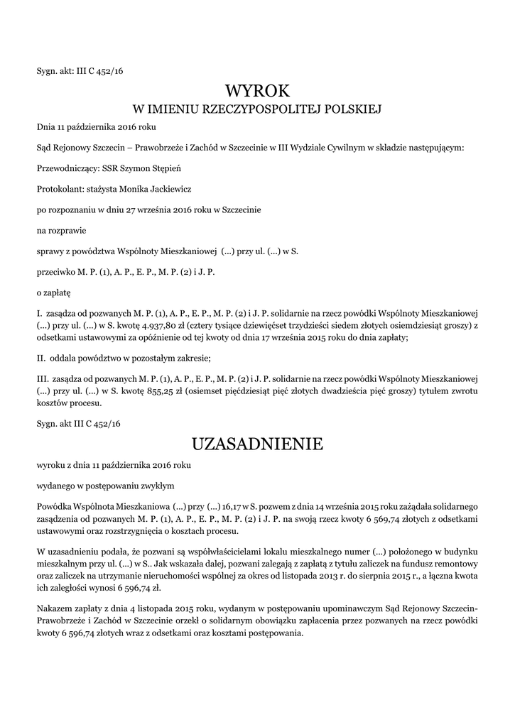 Sygn. akt: III C 452/16 WYROK W IMIENIU RZECZYPOSPOLITEJ POLSKIEJ Dnia 11 października 2016 roku Sąd Rejonowy Szczecin – Prawobrzeże i Zachód w Szczecinie w III Wydziale Cywilnym w składzie następującym: Przewodniczący: SSR Szymon Stępień Protokolant: stażysta Monika Jackiewicz po rozpoznaniu w dniu 27 września 2016 roku w Szczecinie na rozprawie sprawy z powództwa Wspólnoty Mieszkaniowej (...) przy ul. (...) w S. przeciwko M. P. (1), A. P., E. P., M. P. (2) i J. P. o zapłatę I. zasądza od pozwanych M. P. (1), A. P., E. P., M. P. (2) i J. P. solidarnie na rzecz powódki Wspólnoty Mieszkaniowej (...) przy ul. (...) w S. kwotę 4.937,80 zł (cztery tysiące dziewięćset trzydzieści siedem złotych osiemdziesiąt groszy) z odsetkami ustawowymi za opóźnienie od tej kwoty od dnia 17 września 2015 roku do dnia zapłaty; II. oddala powództwo w pozostałym zakresie; III. zasądza od pozwanych M. P. (1), A. P., E. P., M. P. (2) i J. P. solidarnie na rzecz powódki Wspólnoty Mieszkaniowej (...) przy ul. (...) w S. kwotę 855,25 zł (osiemset pięćdziesiąt pięć złotych dwadzieścia pięć groszy) tytułem zwrotu kosztów procesu. Sygn. akt III C 452/16 UZASADNIENIE wyroku z dnia 11 października 2016 roku wydanego w postępowaniu zwykłym Powódka Wspólnota Mieszkaniowa (...) przy (...) 16,17 w S. pozwem z dnia 14 września 2015 roku zażądała solidarnego zasądzenia od pozwanych M. P. (1), A. P., E. P., M. P. (2) i J. P. na swoją rzecz kwoty 6 569,74 złotych z odsetkami ustawowymi oraz rozstrzygnięcia o kosztach procesu. W uzasadnieniu podała, że pozwani są współwłaścicielami lokalu mieszkalnego numer (...) położonego w budynku mieszkalnym przy ul. (...) w S.. Jak wskazała dalej, pozwani zalegają z zapłatą z tytułu zaliczek na fundusz remontowy oraz zaliczek na utrzymanie nieruchomości wspólnej za okres od listopada 2013 r. do sierpnia 2015 r., a łączna kwota ich zaległości wynosi 6 596,74 zł. Nakazem zapłaty z dnia 4 listopada 2015 roku, wydanym w postępowaniu upominawczym Sąd Rejonowy SzczecinPrawobrzeże i Zachód w Szczecinie orzekł o solidarnym obowiązku zapłacenia przez pozwanych na rzecz powódki kwoty 6 596,74 złotych wraz z odsetkami oraz kosztami postępowania. Powyższemu nakazowi zapłaty pozwani sprzeciwili się, zaskarżając go w całości, co doprowadziło do utraty mocy przez ten nakaz zapłaty. W sprzeciwie wnieśli o oddalenie powództwa w całości wskazując, iż nie zostało wykazane tak co do zasady jak i wysokości, kwestionując pozew co do podstaw naliczania, wysokości oraz wymagalności poszczególnych sum składających się na dochodzoną kwotę. Ponadto A. P., E. P. i M. P. (2) wskazały, iż od kilku lat nie mieszkają w przedmiotowym lokalu. Na rozprawie w dniu 24 maja 2016 r. pełnomocnik pozwanych oświadczył, że kwestionuje dochodzone roszczenie jedynie co do kwoty 1 631,94 zł. W toku procesu strony podtrzymały dotychczasowe stanowiska. Sąd ustalił następujący stan faktyczny: Pozwani są współwłaścicielami lokalu mieszkalnego numer (...) położonego w budynku mieszkalnym przy ul. (...) w S. o łącznej powierzchni użytkowej 89,28 m2. Jednocześnie są oni członkami wspólnoty mieszkaniowej obejmującej lokale położone przy ul. (...) w S.. W własnością lokalu związany jest udział wynoszący (...) części wspólnych nieruchomości. Okoliczność bezsporna, a nadto: • odpis zwykły księgi wieczystej, k. 12-21; Dnia 20 marca 2013 roku właściciele lokali tworzący wspólnotę mieszkaniową podjęli uchwałę nr 3/2013, w której ustalili wysokość opłat na rok 2013 r. oraz uchwałę nr 5/2013, w której obciążyli właścicieli nie sprzątających w swojej klatce kwotą 50 zł miesięcznie. W dniu 25 marca 2014 r. właściciele lokali tworzący wspólnotę mieszkaniową podjęli uchwałę nr 3/2014, w której ustalili wysokość opłat na pokrycie kosztów zarządu nieruchomością wspólną od 1 kwietnia 2014 r. Natomiast w dniu 6 marca 2015 r. właściciele lokali tworzący wspólnotę mieszkaniową podjęli uchwałę nr 3/2015, w której ustalili wysokość opłat na pokrycie kosztów zarządu nieruchomością wspólną od 1 kwietnia 2015 r. Okoliczność bezsporna, a nadto: • uchwały, k. 22-25; Powódka w niniejszym postępowaniu dochodziła od pozwanych kwoty 6 569,74 zł za okres od dnia listopada 2013 r. do sierpnia 2015 r. Pismem z dnia 25 czerwca 2015 roku pozwana M. P. (1) została wezwana przez powódkę do uiszczenia kwoty 5 944,92 zł z tytułu kosztów związanych z utrzymaniem nieruchomości wspólnej. Również pozostałe pozwane wzywane były przez powódkę do zapłaty tej kwoty. Dowód: • informacja o wymiarze zaliczki, k. 26-29; • raport, k. 30-33; • pisma powódki, k. 34-38; • pisma pozwanych, k. 39-40; • wydruki z e-mail, k. 65-68; • zeznania świadka K. K.; • zeznania pozwanej M. P. (1) Pozwane A. P., E. P. i M. P. (2) studiują na Uniwersytecie im. A. M. w P. i od kilku lat nie mieszkają w S.. Dowód: • decyzja k. 63, 84,95, 98-99; • wydruk z e-mail, k. 83; • umowy k. 85-86, 97,109; • zaświadczenie k. 96 Sąd zważył, co następuje: Powództwo okazało się uzasadnione w części. Żądanie to zostało oparte na dyspozycji wynikającej z art. 13 ust. 1 ustawy z dnia 24 czerwca 1994 roku o własności lokali (t.j. Dz.U. z 2000 roku, nr 80, poz. 903 ze zm.), zgodnie z którym właściciel lokalu tworzący wspólnotę mieszkaniową ponosi wydatki związane z utrzymaniem jego lokalu, jest obowiązany utrzymywać swój lokal w należytym stanie, przestrzegać porządku domowego, uczestniczyć w kosztach zarządu związanych z utrzymaniem nieruchomości wspólnej, korzystać z niej w sposób nie utrudniający korzystania przez innych współwłaścicieli oraz współdziałać z nimi w ochronie wspólnego dobra. Zgodnie zaś z art. 15 ust. 1 tej ustawy, właściciel zobowiązany jest do uiszczania zaliczek na pokrycie kosztów 