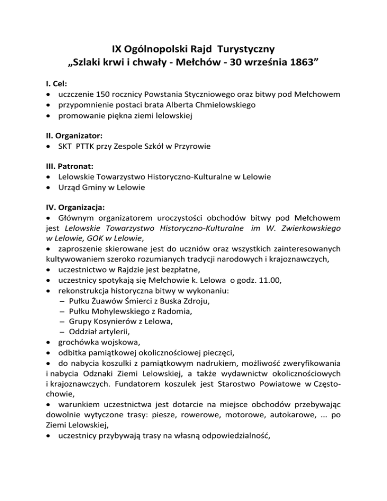 IX Ogólnopolski Rajd Turystyczny „Szlaki krwi i chwały - Mełchów - 30 września 1863” I. Cel: uczczenie 150 rocznicy Powstania Styczniowego oraz bitwy pod Mełchowem przypomnienie postaci brata Alberta Chmielowskiego promowanie piękna ziemi lelowskiej II. Organizator: SKT PTTK przy Zespole Szkół w Przyrowie III. Patronat: Lelowskie Towarzystwo Historyczno-Kulturalne w Lelowie Urząd Gminy w Lelowie IV. Organizacja: Głównym organizatorem uroczystości obchodów bitwy pod Mełchowem jest Lelowskie Towarzystwo Historyczno-Kulturalne im W. Zwierkowskiego w Lelowie, GOK w Lelowie, zaproszenie skierowane jest do uczniów oraz wszystkich zainteresowanych kultywowaniem szeroko rozumianych tradycji narodowych i krajoznawczych, uczestnictwo w Rajdzie jest bezpłatne, uczestnicy spotykają się Mełchowie k. Lelowa o godz. 11.00, rekonstrukcja historyczna bitwy w wykonaniu: Pułku Żuawów Śmierci z Buska Zdroju, Pułku Mohylewskiego z Radomia, Grupy Kosynierów z Lelowa, Oddział artylerii, grochówka wojskowa, odbitka pamiątkowej okolicznościowej pieczęci, do nabycia koszulki z pamiątkowym nadrukiem, możliwość zweryfikowania i nabycia Odznaki Ziemi Lelowskiej, a także wydawnictw okolicznościowych i krajoznawczych. Fundatorem koszulek jest Starostwo Powiatowe w Częstochowie, warunkiem uczestnictwa jest dotarcie na miejsce obchodów przebywając dowolnie wytyczone trasy: piesze, rowerowe, motorowe, autokarowe, ... po Ziemi Lelowskiej, uczestnicy przybywają trasy na własną odpowiedzialność, każdy uczestnik powinien posiadać ubiór odpowiedni do pogody i uprawianej formy turystyki, rajd odbędzie się bez względu na warunki pogodowe. V. Termin: 5 października 2013 roku, godzina 11.00 Mełchów VI. Organizatorzy: Komandor Rajdu: Jerzy Sikorski PROGRAM UROCZYSTOŚCI: Godz. 11.00 Msza Św. w intencji poległych powstańców z 1863r. w kaplicy w Mełchowie, Apel poległych, Salwa honorowa, Wspomnienie o bitwie, Występ Dziecięcej i Młodzieżowej Orkiestry Dętej działającej przy GOK w Lelowie, Godz. 12.00 Inscenizacja z epoki powstania styczniowego w wykonaniu grup rekonstrukcyjnych: Pułku Żuawów Śmierci z Buska Zdroju, Pułku Mohylewskiego z Radomia, Grupy Kosynierów z Lelowa, Godz. 13.00 Wspólna grochówka. SERDECZNIE ZAPRASZAMY!