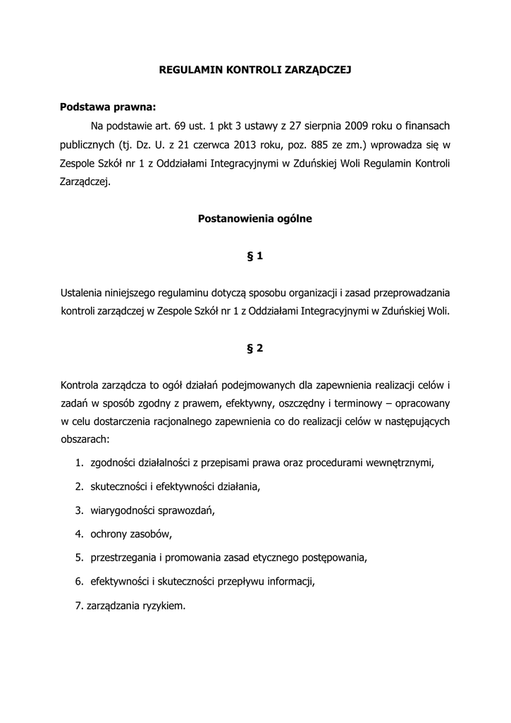 REGULAMIN KONTROLI ZARZĄDCZEJ Podstawa prawna: Na podstawie art. 69 ust. 1 pkt 3 ustawy z 27 sierpnia 2009 roku o finansach publicznych (tj. Dz. U. z 21 czerwca 2013 roku, poz. 885 ze zm.) wprowadza się w Zespole Szkół nr 1 z Oddziałami Integracyjnymi w Zduńskiej Woli Regulamin Kontroli Zarządczej. Postanowienia ogólne §1 Ustalenia niniejszego regulaminu dotyczą sposobu organizacji i zasad przeprowadzania kontroli zarządczej w Zespole Szkół nr 1 z Oddziałami Integracyjnymi w Zduńskiej Woli. §2 Kontrola zarządcza to ogół działań podejmowanych dla zapewnienia realizacji celów i zadań w sposób zgodny z prawem, efektywny, oszczędny i terminowy – opracowany w celu dostarczenia racjonalnego zapewnienia co do realizacji celów w następujących obszarach: 1. zgodności działalności z przepisami prawa oraz procedurami wewnętrznymi, 2. skuteczności i efektywności działania, 3. wiarygodności sprawozdań, 4. ochrony zasobów, 5. przestrzegania i promowania zasad etycznego postępowania, 6. efektywności i skuteczności przepływu informacji, 7. zarządzania ryzykiem. Środowisko wewnętrzne §3 Nauczyciele są świadomi wartości etycznych przyjętych w szkole, określonych w Kodeksie Etyki Nauczyciela, stanowiącym załącznik nr 1 do niniejszego Regulaminu. §4 Zatrudnieni w szkole pracownicy samorządowi są świadomi wartości etycznych, określonych w Kodeksie Etyki Pracowników Samorządowych, stanowiącym załącznik nr 2 do niniejszego Regulaminu. §5 1. Rekrutacja nowych pracowników przebiega w taki sposób, aby zapewnić wybór najlepszego kandydata. 2. Rekrutację nowych pracowników przeprowadza komisja rekrutacyjna, w skład której wchodzą: - Dyrektor Zespołu Szkół, - Wicedyrektor Zespołu Szkół – szkoły podstawowej lub publicznego gimnazjum, - Starszy Specjalista d/s kadr. 3. Szczegółowe wymagania dotyczące kwalifikacji nauczycieli zawiera Rozporządzenie Ministra Edukacji Narodowej z 12 marca 2009 roku w sprawie szczegółowych kwalifikacji wymaganych od nauczycieli oraz określenia szkół i wypadków, w których można zatrudnić nauczycieli niemających wyższego wykształcenia lub ukończonego zakładu kształcenia nauczycieli (tj. Dz. U. z 20 czerwca 2013 roku, poz. 1207 ze zm.). 4. Szczegółowe wymagania dotyczące kwalifikacji zatrudnionych w szkole pracowników samorządowych określa Rozporządzenie Rady Ministrów z dnia 18 marca 2009 roku w sprawie wynagradzania pracowników samorządowych (tj. Dz. U. z 18 listopada 2014 roku, poz. 1786 ze zm.). 5. Każdemu pracownikowi szkoły przedstawiono na piśmie opis stanowiska pracy, określający zakres jego obowiązków, uprawnień i odpowiedzialności. Przyjęcie opisu stanowiska jest potwierdzone podpisem pracownika. §6 1. Praca nauczyciela w szkole podlega ocenie. Szczegółowe regulacje dotyczące przeprowadzenia oceny nauczyciela znajdują się w Rozporządzeniu Ministra Edukacji Narodowej z dnia 21 grudnia 2012 roku w sprawie kryteriów i trybu dokonywania oceny pracy nauczyciela, trybu postępowania odwoławczego oraz składu i sposobu powoływania zespołu oceniającego (tj. Dz. U. z 2012 roku, poz. 1538 ze zm.). 2. Ocenie podlega praca pracownika samorządowego zatrudnionego w szkole. Szczegółowe zasady przeprowadzania ocen pracowników samorządowych określa załącznik do zarządzenia nr 2 Dyrektora Zespołu Szkół nr 1 z Oddziałami Integracyjnymi w Zduńskiej Woli. §7 1. Strukturę organizacyjną szkoły, szczegółowy zakres kompetencji Dyrektora, Wicedyrektora Zespołu Szkół – szkoły podstawowej oraz publicznego gimnazjum, jak również kierownika pływalni określa Statut Szkoły. Cele i zarządzanie ryzykiem §8 Misją szkoły jest tworzenie uczniom możliwości pełnego rozwoju intelektualnego, psychicznego i fizycznego w poszanowaniu ich godności i wolności światopoglądowej oraz przygotowanie ich do dalszego kształcenia. §9 1. Cele Zespołu Szkół nr 1 są określane w rocznej perspektywie. 2. Cele Zespołu Szkół na rok kolejny określa zespół w skład którego wchodzą: - Dyrektor Zespołu Szkół, - Wicedyrektor Zespołu Szkół – szkoły podstawowej lub publicznego gimnazjum, - Główny księgowy. 3. Zespół określa cele Zespołu Szkół nr 1 na rok kolejny w terminie do 28 lutego danego roku. 4. Wyznaczone przez zespół cele są wpisywane w rejestrze celów i ryzyk, stanowiącym załącznik Nr 3 do regulaminu. 5. Zespół określony w ust. 2 określa mierniki realizacji celów. Mierniki są wpisywane w rejestrze celów i ryzyk, stanowiącej załącznik nr 3 do regulaminu. § 10 1. Raz w roku dokonywana jest identyfikacja ryzyk w odniesieniu do celów ustalonych w trybie określonym w § 9 regulaminu. 2. Zarządzanie ryzykiem odbywa się poprzez: - identyfikację ryzyka, - monitorowanie realizacji zadań, - analizę ryzyka i podejmowanie działań zaradczych. 3. W procesie identyfikacji ryzyka wykorzystuje się ustalenia audytu, wyniki ocen i kontroli. 4. Identyfikacji ryzyk dokonuje zespół określony w § 9 ust. 2 regulaminu. 5. O terminie przeprowadzenia identyfikacji ryzyk decyduje Dyrektor Zespołu Szkół. 6. Ponowna identyfikacja ryzyk jest przeprowadzana również przypadku istotnej zmiany warunków w których funkcjonuje szkoła. 7. O przeprowadzeniu ponownej identyfikacji ryzyka decyduje Dyrektor Zespołu Szkół. 8. Zidentyfikowane ryzyka są wpisywane w rejestrze celów i ryzyk, stanowiącym załącznik nr 3 do regulaminu. 9. Zidentyfikowane ryzyka poddawane są analizie, mającej na celu określenie możliwych skutków wystąpienia danego ryzyka. 10. Analizy ryzyka dokonuje zespół określony w § 9 ust. 2 regulaminu. 11. Przewidywane skutki wystąpienia ryzyka są wpisywane w rejestrze celów i ryzyk. § 11 1. Dyrektor Zespołu Szkół i pozostali członkowie zespołu określonego w § 9 ust. 2 niniejszego regulaminu na postawie wyników analizy ryzyka i przewidywanych skutków wystąpienia danego ryzyka określają r