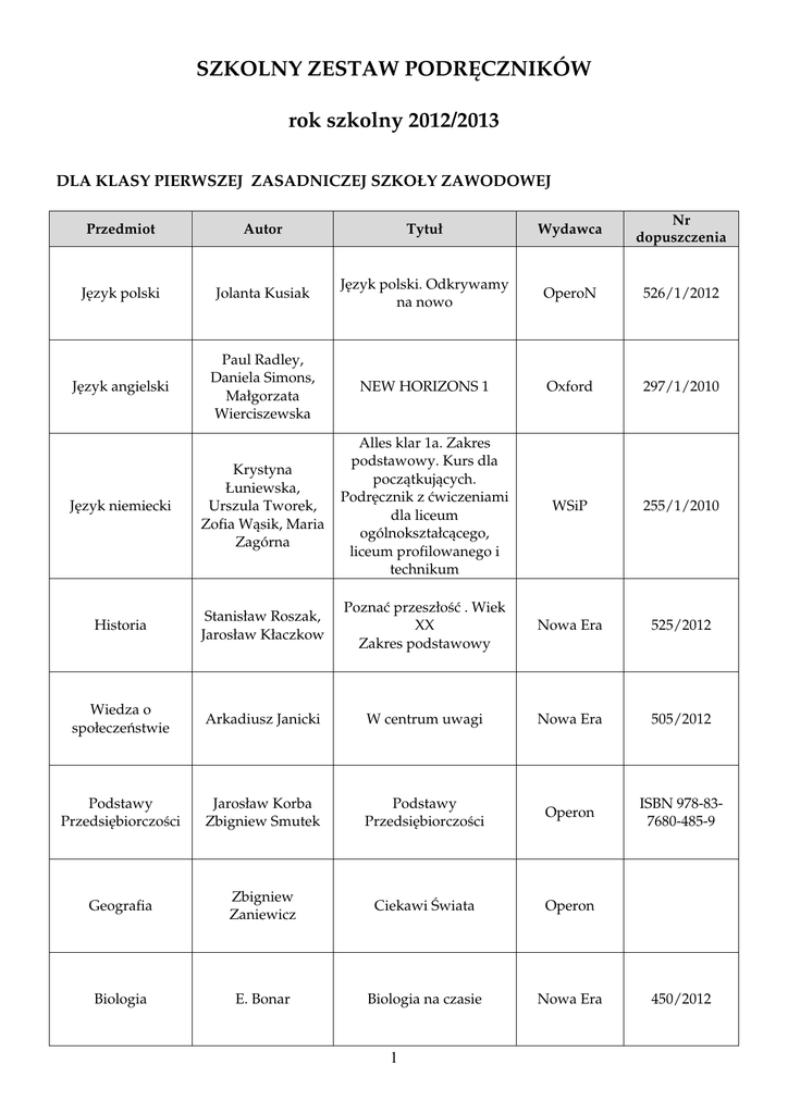 SZKOLNY ZESTAW PODRĘCZNIKÓW rok szkolny 2012/2013 DLA KLASY PIERWSZEJ ZASADNICZEJ SZKOŁY ZAWODOWEJ Przedmiot Autor Tytuł Wydawca Nr dopuszczenia Język polski Jolanta Kusiak Język polski. Odkrywamy na nowo OperoN 526/1/2012 Język angielski Paul Radley, Daniela Simons, Małgorzata Wierciszewska NEW HORIZONS 1 Oxford 297/1/2010 Język niemiecki Krystyna Łuniewska, Urszula Tworek, Zofia Wąsik, Maria Zagórna Alles klar 1a. Zakres podstawowy. Kurs dla początkujących. Podręcznik z ćwiczeniami dla liceum ogólnokształcącego, liceum profilowanego i technikum WSiP 255/1/2010 Historia Stanisław Roszak, Jarosław Kłaczkow Poznać przeszłość . Wiek XX Zakres podstawowy Nowa Era 525/2012 Wiedza o społeczeństwie Arkadiusz Janicki W centrum uwagi Nowa Era 505/2012 Podstawy Przedsiębiorczości Jarosław Korba Zbigniew Smutek Podstawy Przedsiębiorczości Operon ISBN 978-837680-485-9 Geografia Zbigniew Zaniewicz Ciekawi Świata Operon Biologia E. Bonar Biologia na czasie Nowa Era 1 450/2012 Chemia Romuald Hassa Aleksandra Mrzigod Janusz Mrzigod To jest chemia Nowa Era 438/2012 Fizyka Ryszard Rozenbajgier, Edmund Misiaszek Fizyka z astronomią dla zasadniczych szkół zawodowych Zamkor 321/03 Matematyka Wojciech Babiański, Karolina Wej Matematyka 1 Nowa era 573/1/2012 Informatyka Grażyna Hermanowska Wojciech Hermanowski Technologia informacyjna Operon 224/04 Edukacja dla bezpieczeństwa M. Goniewicz A.W. NowakKowal Z. Smutek Edukacja dla bezpieczeństwa OPERON 411/2012 REA 28/2008 PRZEDMIOTY ZAWODOWE Towar jako przedmiot handlu Marta Misiarz Katarzyna Kocierz Towaroznawstwo DLA KLASY DRUGIEJ ZASADNICZEJ SZKOŁY ZAWODOWEJ Przedmiot Autor Tytuł Wydawca Nr dopuszczenia Język polski Maja Olszaniecka, Jolanta Kręcichwost Magia słów. Kształcenie literackie i językowe. Podręcznik dla zasadniczej szkoły zawodowej. Część 2 Wydawnictw o Szkolne PWN 420/03 Język angielski Paul Radley, Daniela Simons, Małgorzata Wierciszewska NEW HORIZONS 1 Oxford 297/1/2010 Język niemiecki Przemysław Wolski, Marzena Sosińska Mein Beruf 2 Podręcznik z ćwiczeniami dla szkoły zawodowej rea 102/5 2 Historia i wiedza o społeczeństwie Anna LandauCzajka Historia i wiedza o społeczeństwie Wydawnictw o Szkolne PWN 64/03 Matematyka Praca zbiorowa pod red. Jerzego Nowika Matematyka bliżej nas NOWIK 201/04 Fizyka i astronomia Brzezowski Sławomir Fizyka i astronomia. Podręcznik Operon 377/03 Geografia z ochroną i kształtowaniem środowiska P. Wład Geografia Ortus Podstawy przedsiębiorczości Technologia informacyjna Przysposobienie obronne PRZEDMIOTY ZAWODOWE Towaroznawstwo Marta Misiarz Katarzyna Kocierz Towaroznawstwo 3 REA 28/2008 DLA KLASY TRZECIEJ ZASADNICZEJ SZKOŁY ZAWODOWEJ Przedmiot Język polski Autor Tytuł Wydawca Nr dopuszczenia Maja Olszaniecka, Jolanta Kręcichwost Magia słów. Kształcenie literackie i językowe. Podręcznik dla zasadniczej szkoły zawodowej. Część 2 Wydawnictwo Szkolne PWN 420/03 Praca zbiorowa pod red. Jerzego Nowika Matematyka bliżej nas NOWIK 201/04 Język angielski Język niemiecki Historia i wiedza o społeczeństwie Matematyka Fizyka i astronomia Geografia z ochroną i kształtowaniem środowiska Podstawy przedsiębiorczości Technologia informacyjna Przysposobienie obronne Z powyższego zestawu podręczników nieobowiązkowymi są podręczniki do religii. 4