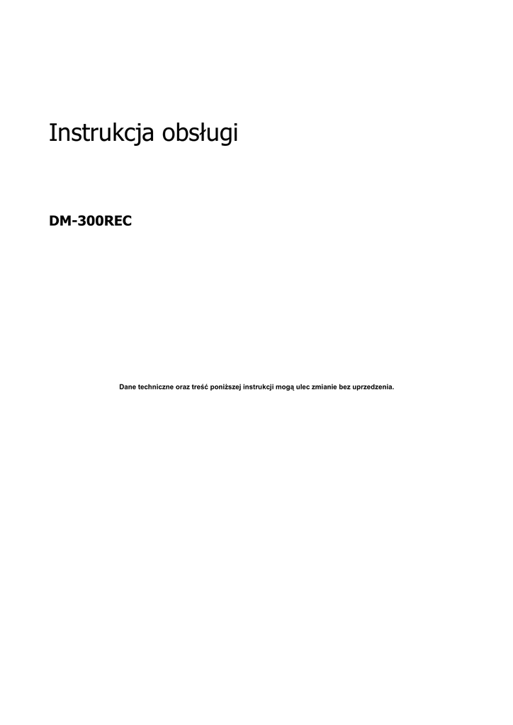 Instrukcja obsługi DM-300REC Dane techniczne oraz treść poniższej instrukcji mogą ulec zmianie bez uprzedzenia. Odbiornik zgodny jest z warunkami dyrektywy 89/336/EEC dotyczącej przestrzegania przez kraje członkowskie przepisów zgodności elektromagnetycznej oraz warunkami dyrektyw 73/23/EEC i 93/68/EEC dotyczących przestrzegania przez kraje członkowskie przepisów niskiego napięcia i bezpieczeństwa związanego z obsługą urządzeń elektrycznych. Symbol ten informuje, że danego urządzenia elektrycznego lub elektronicznego, po zakończeniu jego eksploatacji, nie wolno wyrzucać razem z odpadami gospodarczymi. Urządzenie należy przekazać do wyspecjalizowanego punktu zbiórki. Szczegółowe informacje o najbliższym punkcie zbiórki można uzyskać u władz lokalnych. Ponadto produkt można oddać lokalnemu dystrybutorowi podczas zakupu innego urządzenia o podobnych właściwościach. Odpowiednia utylizacja urządzenia pozwala zachować cenne zasoby naturalne i uniknąć negatywnego wpływu na zdrowie i środowisko, które może być zagrożone w przypadku niewłaściwego postępowania z odpadami. 1. Opis urządzenia ● Podsłuch zwierząt w otwartej przestrzeni, idealny dla miłośników ptaków, ● Cyfrowe nagrywanie dźwięku do wewnętrznej pamięci, ● Odtwarzanie ostatniego nagrania, ● Obserwacja zwierząt z 8 krotnym powiększeniem, ● Wygodne i dobrze dopasowane słuchawki, ● Paraboliczny ekran skupiający dźwięk z jednego kierunku, który słychać z ponad 100m, ● Zasilanie z baterii 9V (brak w zestawie) 2. Obsługa urządzenia 1 2 3 4 7 5 6 8 10 9 1 Pokrętło regulacji ostrości 2 Wizjer powiększający 8x 3 Przycisk nagrywania (maksymalnie 12 sekund) 4 Przycisk odtwarzania 5 Gniazdo słuchawkowe mini-jack 3.5 mm 6 Pokrywa baterii. Aby wymienić baterię odkręć śrubkę. 7 Mikrofon kierunkowy 8 Regulacja wzmocnienia 9 Słuchawki 10 Przycisk włączający podsłuch. ● Aby rozpocząć nasłuchiwanie wystarczy wcisnąć jeden przycisk (nr 3 na rysunku). ● Nagrywanie aktywne jest tylko podczas trzymania wciśniętego przycisku nr 3. ● Regulacja ostrości odbywa się za pomocą pokrętła nr 1. 2. Specyfikacja techniczna Nagrywanie audio: Tak, maks. 12 sekund Regulacja wzmocnienia: Tak Zasięg mikrofonu: ok 100m (w wolnej przestrzeni) Powiększenie wizjera: 8x Zasilanie: bateria 9V, typ 6F22 Masa: 330 g Wymiary: Ø210 x 270 mm