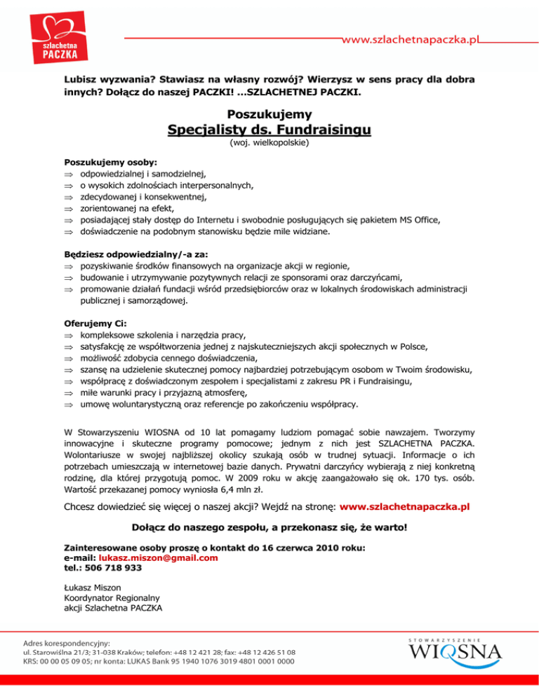 Lubisz wyzwania? Stawiasz na własny rozwój? Wierzysz w sens pracy dla dobra innych? Dołącz do naszej PACZKI! …SZLACHETNEJ PACZKI. Poszukujemy Specjalisty ds. Fundraisingu (woj. wielkopolskie) Poszukujemy osoby: ⇒ odpowiedzialnej i samodzielnej, ⇒ o wysokich zdolnościach interpersonalnych, ⇒ zdecydowanej i konsekwentnej, ⇒ zorientowanej na efekt, ⇒ posiadającej stały dostęp do Internetu i swobodnie posługujących się pakietem MS Office, ⇒ doświadczenie na podobnym stanowisku będzie mile widziane. Będziesz odpowiedzialny/-a za: ⇒ pozyskiwanie środków finansowych na organizacje akcji w regionie, ⇒ budowanie i utrzymywanie pozytywnych relacji ze sponsorami oraz darczyńcami, ⇒ promowanie działań fundacji wśród przedsiębiorców oraz w lokalnych środowiskach administracji publicznej i samorządowej. Oferujemy Ci: ⇒ kompleksowe szkolenia i narzędzia pracy, ⇒ satysfakcję ze współtworzenia jednej z najskuteczniejszych akcji społecznych w Polsce, ⇒ moŜliwość zdobycia cennego doświadczenia, ⇒ szansę na udzielenie skutecznej pomocy najbardziej potrzebującym osobom w Twoim środowisku, ⇒ współpracę z doświadczonym zespołem i specjalistami z zakresu PR i Fundraisingu, ⇒ miłe warunki pracy i przyjazną atmosferę, ⇒ umowę woluntarystyczną oraz referencje po zakończeniu współpracy. W Stowarzyszeniu WIOSNA od 10 lat pomagamy ludziom pomagać sobie nawzajem. Tworzymy innowacyjne i skuteczne programy pomocowe; jednym z nich jest SZLACHETNA PACZKA. Wolontariusze w swojej najbliŜszej okolicy szukają osób w trudnej sytuacji. Informacje o ich potrzebach umieszczają w internetowej bazie danych. Prywatni darczyńcy wybierają z niej konkretną rodzinę, dla której przygotują pomoc. W 2009 roku w akcję zaangaŜowało się ok. 170 tys. osób. Wartość przekazanej pomocy wyniosła 6,4 mln zł. Chcesz dowiedzieć się więcej o naszej akcji? Wejdź na stronę: www.szlachetnapaczka.pl Dołącz do naszego zespołu, a przekonasz się, Ŝe warto! Zainteresowane osoby proszę o kontakt do 16 czerwca 2010 roku: e-mail: [email protected] tel.: 506 718 933 Łukasz Miszon Koordynator Regionalny akcji Szlachetna PACZKA