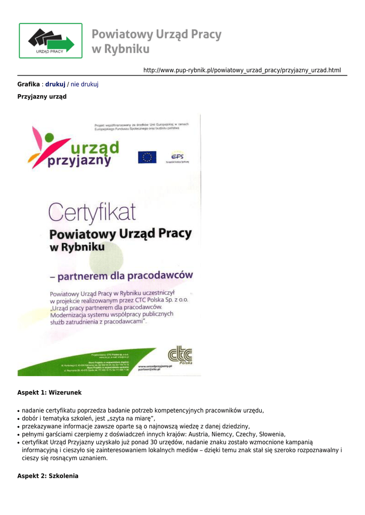 http://www.pup-rybnik.pl/powiatowy_urzad_pracy/przyjazny_urzad.html Grafika : drukuj / nie drukuj Przyjazny urząd Aspekt 1: Wizerunek ● ● ● ● ● nadanie certyfikatu poprzedza badanie potrzeb kompetencyjnych pracowników urzędu, dobór i tematyka szkoleń, jest „szyta na miarę”, przekazywane informacje zawsze oparte są o najnowszą wiedzę z danej dziedziny, pełnymi garściami czerpiemy z doświadczeń innych krajów: Austria, Niemcy, Czechy, Słowenia, certyfikat Urząd Przyjazny uzyskało już ponad 30 urzędów, nadanie znaku zostało wzmocnione kampanią informacyjną i cieszyło się zainteresowaniem lokalnych mediów – dzięki temu znak stał się szeroko rozpoznawalny i cieszy się rosnącym uznaniem. Aspekt 2: Szkolenia OBSZAR I SZKOLENIA INTERPERSONALNE ● ● ● ● ● Organizacja czasu pracy. Budowanie skutecznego zespołu. Trening efektywnej rozmowy z klientem – oszczędność czasu, osiąganie celu Skuteczna komunikacja kluczem do porozumienia – świadomość własnego charakteru kluczem do świadomego komunikowania się. Trudny klient – trudne sytuacje – jak sobie poradzić? OBSZAR II SZKOLENIA MERYTORYCZNE I TECHNICZNE ● ● ● ● ● ● ● ● ● ● ● ● ● ● ● Pośrednik pracy profesjonalnym doradcą – trendy, nowinki, najnowsze badania. Marketing pośrednictwa pracy – czy możliwe jest partnerstwo z agencjami zatrudnienia? Najnowsze zmiany prawa pracy – aktualizacja wiedzy dla działu kadr. Przewodnik po funduszach unijnych, czyli jak skutecznie aplikować m.in. w programach POKL, LdV, EWT. Wdrożenie projektów finansowanych z programów unijnych: realizacja, zarządzanie, ewaluacja, rozliczenie i kontrola. Kodeks Postępowania Administracyjnego – wybrane aspekty dla urzędów pracy w oparciu o najnowsze orzecznictwo. Nowelizacja ustawy o promocji zatrudnienia i instytucji rynku pracy. Nowa ustawa o finansach publicznych – wybrane aspekty dla urzędów pracy. Co oznacza dla urzędu pracy nowelizacja ustawy Prawo Zamówień Publicznych. Wykorzystanie metod aktywnych w szkoleniach w urzędzie pracy. E-podpis i e-formularz urząd pracy przyszłości. Rozwiązywania problemów i podejmowanie decyzji w organizacji a codzienna praktyka urzędu. Analiza i badanie rynku pracy – metodyka, skuteczność a koszty. Pakiet Office – poziom podstawowy. Pakiet Office – poziom zaawansowany. OBSZAR III PROMOCJA I WIZERUNEK URZĘDU ● ● ● ● ● PUP urzędem przyjaznym – jak panować nad wizerunkiem Powiatowego Urzędu Pracy. Z kamerą w urzędzie, czyli jak występować publicznie: warsztat z autoprezentacji i wystąpień publicznych z wideo rejestracją. Urząd w sieci – jak wykorzystać Internet do skutecznej komunikacji z odbiorcami PUP. Żeby dobrze o nas pisali – jak zainteresować dziennikarzy inicjatywami urzędu pracy. Dress code – praktyczne przykłady z urzędów pracy.