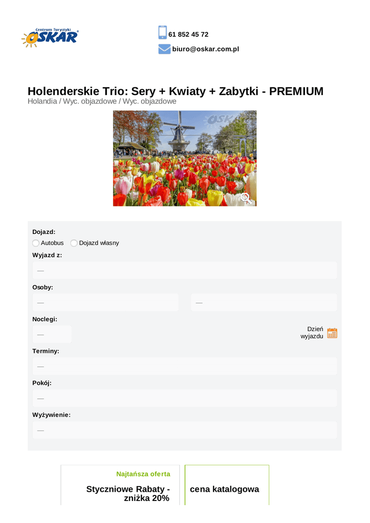 61 852 45 72 [email protected] Holenderskie Trio: Sery + Kwiaty + Zabytki - PREMIUM Holandia / Wyc. objazdowe / Wyc. objazdowe Dojazd: Autobus Dojazd własny Wyjazd z: Osoby: Noclegi: Dzień wyjazdu Terminy: Pokój: Wyżywienie: Najtańsza oferta Styczniowe Rabaty zniżka 20% cena katalogowa Suma: do 11 marca 2017: 577,00 zł do 11 marca 2017: 173,10 zł do 11 marca 2017: 0,00 zł do 11 marca 2017: 403,90 zł 577,00 zł Suma: 577,00 zł Opis oferty Miejscowość Przejazd autokarem PREMIUM autokar-premium-oskar-tablet-gniazdko-usb-wygodne-fotele Opinie Realizacja imprezy autokarami PREMIUM to gwarancja: transportu autokarami z roczników 2015 i 2016 produkcji Irizar i VDL Rozkład jazdy indywidualnego, multimedialnego systemu rozrywki - tablet z dotykowym ekranem w każdym zagłówku (filmy, gry, muzyka itp.). Możliwość podłączenia własnego nośnika danych poprzez wejście AUX lub USB. najwyższej klasy skórzanych lub półskórzanych foteli z możliwością regulacji oparcia lub/i zagłówka największej w Polsce przestrzeni między siedzeniami małej półki przed każdym siedzeniem + siateczki na czasopisma, książki czy telefon bezpłatnego dostępu do sieci WiFi na terenie Polski* gniazdek elektrycznych 230V wydajnej klimatyzacji sterowanej indywidualnie bogato wyposażonego barku udostępnionego w czasie jazdy WC na pokładzie autokaru Idealna i komfortowa podróż… ZAWSZE! Na ternie Polski GWARANTUJEMY, że wszystkie przejazdy realizowane są autobusem, busem lub samochodem osobowym. Zapewnimy komfortowy transport na każdym etapie podróży. Ważne: Autokar Premium jest autokarem docelowym. *jakość usług internetowych może różnić się w zależności od jakości sygnału TOUR GUIDE oprowadzanie z indywidualnym systemem nagłośnieniowym Mobilny zestaw audio: indywidulany zestaw słuchawkowy połączony bezprzewodowo z mikrofonem pilota/przewodnika. Ubezpieczenie Warunki ubezpieczenia Bezpieczne Podróże Signal Iduna dokument do pobrania www.oskar.com.pl/zalaczniki/owu Warunki ubezpieczenia Kosztów Imprezy Turystycznej Signal Iduna dokument do pobrania www.oskar.com.pl/zalaczniki/owurg Karta Dużej Rodziny www.oskar.com.pl/zalaczniki/karta_duzej_rodziny Turystyczny Fundusz Gwarancyjny W związku z powołaniem do życia w dniu 26.11.2016 Turystycznego Funduszu Gwarancyjnego każdy klient Biura Podróży Oskar zobowiązany jest do zapłaty kwoty w wysokości 10zł/os. przy każdorazowej rezerwacji imprezy turystycznej (obowiązuje od dnia 26.11.2016). Kwota przeznaczona na Turystyczny Fundusz Gwarancyjny zostanie automatycznie doliczona do wartości rezerwacji (w momencie jej dokonania). Wyjątkiem są imprezy turystyczne odbywające się w krajach posiadających granicę z Rzeczpospolitą Polską. Składka nie jest przychodem biura. Warunki promocji FIRST MINUTE www.oskar.com.pl/zalaczniki/warunki_promocji Udogodnienia Klimatyzacja Regulowane fotele Tacki Multimedia Nowoczesna flota Zawodowy kierowca Pasy bezpieczeństwa Toaleta w autokarze Podnóżki Wi-Fi Bez paszportu Premium Elite Tour guide Program ramowy Dzień 1 Wyjazd z Polski zgodnie z rozkładem jazdy autokarów. Dzień 2 Przyjazd w do Alkmaar - miasteczka słynącego z targów serowych, w którym będziemy mieli możliwość zakupy holenderskiego sera. Następnie przejazd do jednej z fabryki serów Jacob's Hoeve (lub innej), a tam oprowadzanie z przewodnikiem, który pokaże nam z czego powstają prawdziwe holenderskie sery, jak wygląda ich proces produkcji oraz jak one smakują. Każdy z Was podczas wizyty w fabryce będzie mógł skosztować tego co wyda mu się najsmaczniejsze. Po oprowadzaniu przez przewodnika udamy się do sklepu, gdzie każdy w Was będzie mógł zakupić to, co najbardziej mu zasmakowało. Wieczorem wizyta z mieście Zaanstand, gdzie każdy z nas będzie miał okazję do zobaczenia prawdziwych holenderskich wiatraków czyli jednego z symboli Holandii. Nocleg na terenie Holandii. Dzień 3 Śniadanie. Wykwaterowanie z hotelu. Przejazd do ogrodów Keukenhof - najpiękniejszego parku wiosennego świata gdzie na powierzchni 32 ha można podziwiać ponad 7 milionów kwitnących tulipanów, żonkili, hiacyntów oraz innych roślin cebulowych. Dzień w Keukenhof to dzień pełen wspaniałych przeżyć i niezapomnianych wrażeń. Keukenhof pełen jest niepowtarzalnych kolorów i zapachów, które wywołują jedyne w swoim rodzaju poczucie wolności. Dysponuje doskonałym zapleczem, zachwyca 30 spektakularnymi wystawami kwiatowymi, zaskakującymi i inspirującymi ogrodami oraz tętniącymi życiem wydarzeniami. W godzinach południowych przejazd do Amsterdamu zwanego Wenecją Północy - miasta położonego na ponad sześciuset kanałach które kiedyś były drogą komunikacji i transportu towarów w tym portowym, kupieckim mieście, a teraz niezwykle malownicze, oddają specyficzny charakter miasta. W programie zwiedzania- Oude Kerk - "Stary Kościół" - jedna z najpiękniejszych budowli w mieście, najstarszy kościół, Nieuwe Kerk - kościół (z początku XV wieku), Magere Brud - najsłynniejszy most w Amsterdamie, Singel (najstarszy kanał), Plac Dam, Pałac Królewski, Plac Mennicy, Nieuwmarkt, Chinatown i dzielnica Czerwonych Latarni. Po zakończeniu zwiedzania czas wolny. W godzinach późnowieczornych wyjazd w drogę powrotną do Polski. Nocny przejazd. Dzień 4 Przyjazd do Polski. Cena obejmuje przejazd autokarem klasy LUX (klimatyzacja, DVD, WC, barek) zakwaterowanie: 1 nocleg wyżywienie: 1 śniadanie kontynentalne ubezpieczenie KL, NNW, bagaż opiekę pilota Cena nie obejmuje Dopłaty wymagane na miejscu koszty programowe: 30 €/os (obejmują bilet wstępu do Keukenhof, opłaty lokalne oraz usługę przewodnicką po Amsterdamie) - płatne u pilota w autokarze; nie podlegają rozliczeniu obiadokolacja: 15 €/os; płatne u pilota w autokarze Dopłaty opcjonalne godzinny rejs autobusem wodnym po kanałach Amsterdamu: 16 €/os z audioguide w języku polskim; (wymagana wcześn