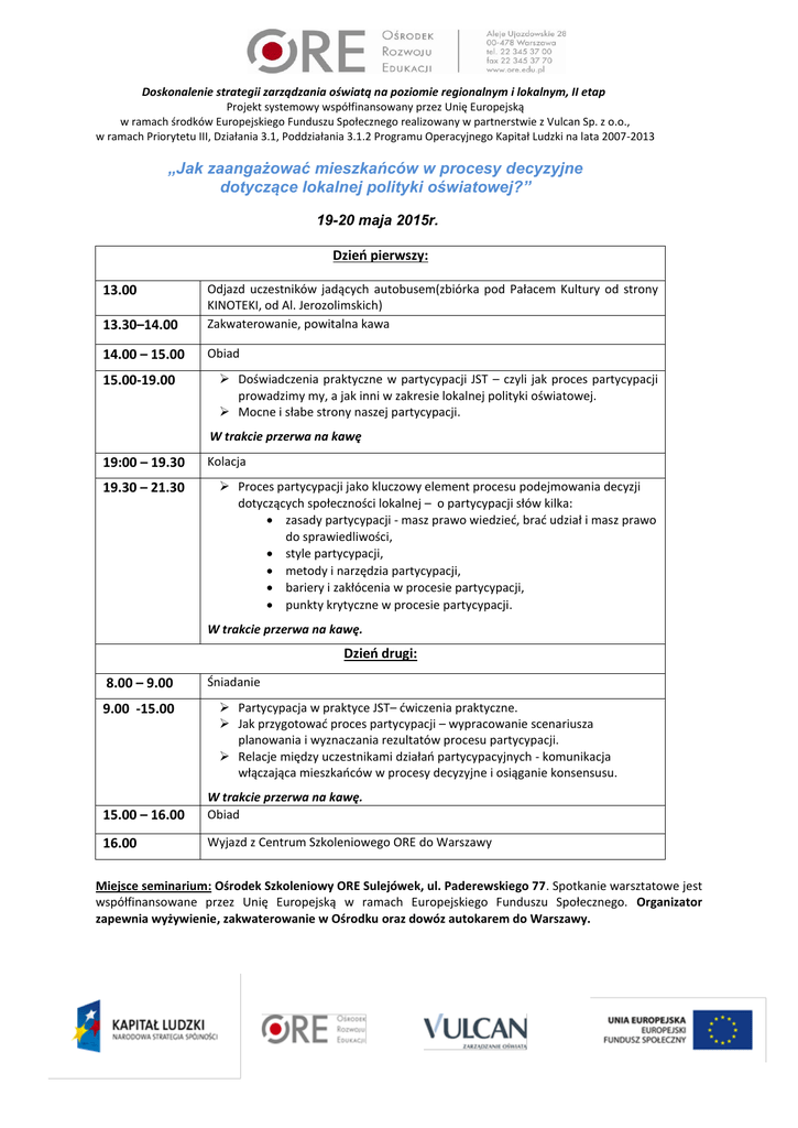 Doskonalenie strategii zarządzania oświatą na poziomie regionalnym i lokalnym, II etap Projekt systemowy współfinansowany przez Unię Europejską w ramach środków Europejskiego Funduszu Społecznego realizowany w partnerstwie z Vulcan Sp. z o.o., w ramach Priorytetu III, Działania 3.1, Poddziałania 3.1.2 Programu Operacyjnego Kapitał Ludzki na lata 2007-2013 „Jak zaangażować mieszkańców w procesy decyzyjne dotyczące lokalnej polityki oświatowej?” 19-20 maja 2015r. Dzień pierwszy: 13.30–14.00 Odjazd uczestników jadących autobusem(zbiórka pod Pałacem Kultury od strony KINOTEKI, od Al. Jerozolimskich) Zakwaterowanie, powitalna kawa 14.00 – 15.00 Obiad 13.00 15.00-19.00  Doświadczenia praktyczne w partycypacji JST – czyli jak proces partycypacji prowadzimy my, a jak inni w zakresie lokalnej polityki oświatowej.  Mocne i słabe strony naszej partycypacji. W trakcie przerwa na kawę 19:00 – 19.30 19.30 – 21.30 Kolacja  Proces partycypacji jako kluczowy element procesu podejmowania decyzji dotyczących społeczności lokalnej – o partycypacji słów kilka:  zasady partycypacji - masz prawo wiedzieć, brać udział i masz prawo do sprawiedliwości,  style partycypacji,  metody i narzędzia partycypacji,  bariery i zakłócenia w procesie partycypacji,  punkty krytyczne w procesie partycypacji. W trakcie przerwa na kawę. Dzień drugi: 8.00 – 9.00 9.00 -15.00 Śniadanie  Partycypacja w praktyce JST– ćwiczenia praktyczne.  Jak przygotować proces partycypacji – wypracowanie scenariusza planowania i wyznaczania rezultatów procesu partycypacji.  Relacje między uczestnikami działań partycypacyjnych - komunikacja włączająca mieszkańców w procesy decyzyjne i osiąganie konsensusu. 15.00 – 16.00 W trakcie przerwa na kawę. Obiad 16.00 Wyjazd z Centrum Szkoleniowego ORE do Warszawy Miejsce seminarium: Ośrodek Szkoleniowy ORE Sulejówek, ul. Paderewskiego 77. Spotkanie warsztatowe jest współfinansowane przez Unię Europejską w ramach Europejskiego Funduszu Społecznego. Organizator zapewnia wyżywienie, zakwaterowanie w Ośrodku oraz dowóz autokarem do Warszawy.
