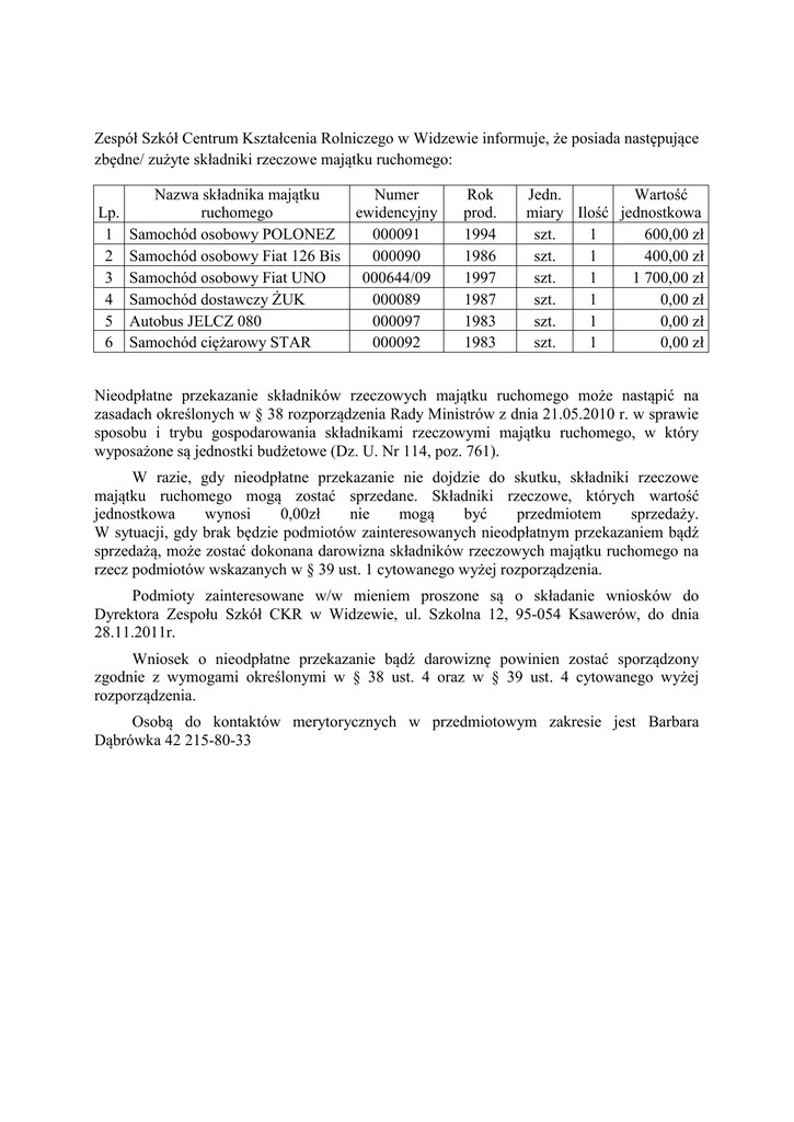 Zespół Szkół Centrum Kształcenia Rolniczego w Widzewie informuje, że posiada następujące zbędne/ zużyte składniki rzeczowe majątku ruchomego: Lp. 1 2 3 4 5 6 Nazwa składnika majątku Numer ruchomego ewidencyjny Samochód osobowy POLONEZ 000091 Samochód osobowy Fiat 126 Bis 000090 Samochód osobowy Fiat UNO 000644/09 Samochód dostawczy ŻUK 000089 Autobus JELCZ 080 000097 Samochód ciężarowy STAR 000092 Rok prod. 1994 1986 1997 1987 1983 1983 Jedn. Wartość miary Ilość jednostkowa szt. 1 600,00 zł szt. 1 400,00 zł szt. 1 1 700,00 zł szt. 1 0,00 zł szt. 1 0,00 zł szt. 1 0,00 zł Nieodpłatne przekazanie składników rzeczowych majątku ruchomego może nastąpić na zasadach określonych w § 38 rozporządzenia Rady Ministrów z dnia 21.05.2010 r. w sprawie sposobu i trybu gospodarowania składnikami rzeczowymi majątku ruchomego, w który wyposażone są jednostki budżetowe (Dz. U. Nr 114, poz. 761). W razie, gdy nieodpłatne przekazanie nie dojdzie do skutku, składniki rzeczowe majątku ruchomego mogą zostać sprzedane. Składniki rzeczowe, których wartość jednostkowa wynosi 0,00zł nie mogą być przedmiotem sprzedaży. W sytuacji, gdy brak będzie podmiotów zainteresowanych nieodpłatnym przekazaniem bądź sprzedażą, może zostać dokonana darowizna składników rzeczowych majątku ruchomego na rzecz podmiotów wskazanych w § 39 ust. 1 cytowanego wyżej rozporządzenia. Podmioty zainteresowane w/w mieniem proszone są o składanie wniosków do Dyrektora Zespołu Szkół CKR w Widzewie, ul. Szkolna 12, 95-054 Ksawerów, do dnia 28.11.2011r. Wniosek o nieodpłatne przekazanie bądź darowiznę powinien zostać sporządzony zgodnie z wymogami określonymi w § 38 ust. 4 oraz w § 39 ust. 4 cytowanego wyżej rozporządzenia. Osobą do kontaktów merytorycznych w przedmiotowym zakresie jest Barbara Dąbrówka 42 215-80-33