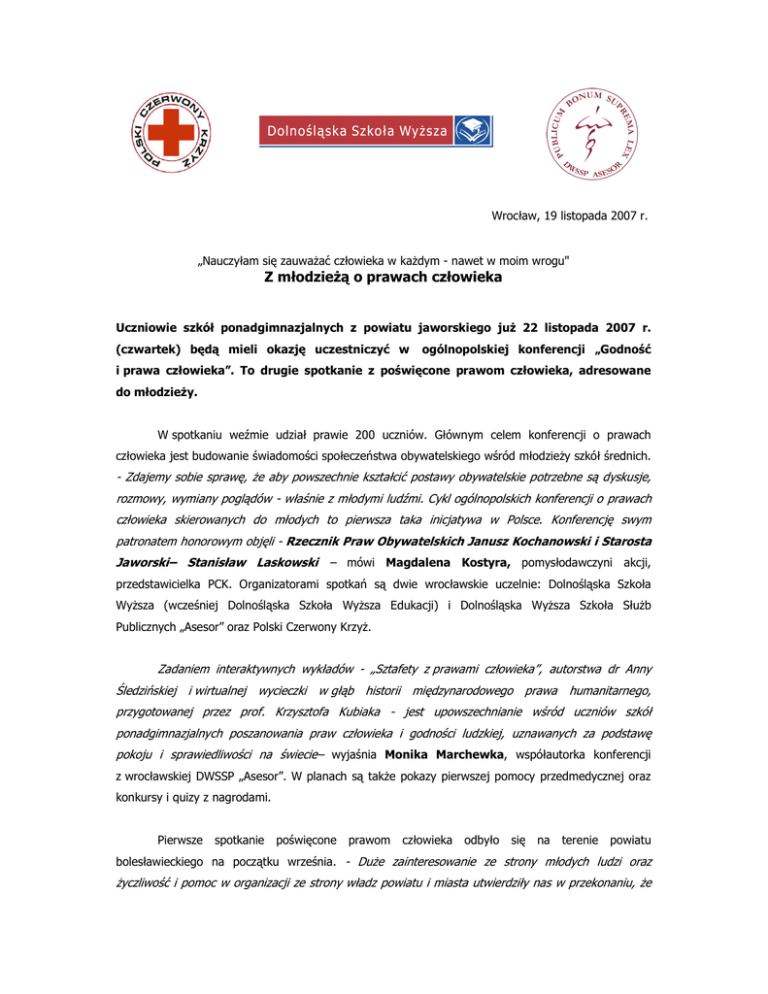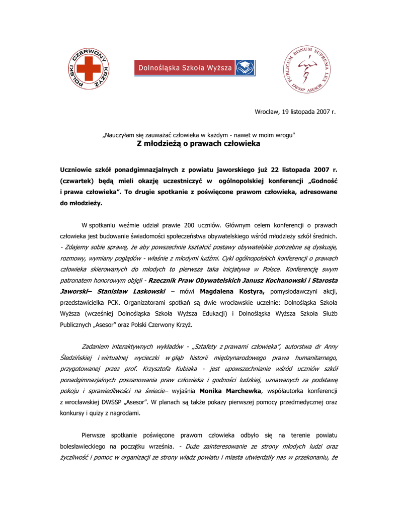 Wrocław, 19 listopada 2007 r. „Nauczyłam się zauważać człowieka w każdym - nawet w moim wrogu" Z młodzieżą o prawach człowieka Uczniowie szkół ponadgimnazjalnych z powiatu jaworskiego już 22 listopada 2007 r. (czwartek) będą mieli okazję uczestniczyć w ogólnopolskiej konferencji „Godność i prawa człowieka”. To drugie spotkanie z poświęcone prawom człowieka, adresowane do młodzieży. W spotkaniu weźmie udział prawie 200 uczniów. Głównym celem konferencji o prawach człowieka jest budowanie świadomości społeczeństwa obywatelskiego wśród młodzieży szkół średnich. - Zdajemy sobie sprawę, że aby powszechnie kształcić postawy obywatelskie potrzebne są dyskusje, rozmowy, wymiany poglądów - właśnie z młodymi ludźmi. Cykl ogólnopolskich konferencji o prawach człowieka skierowanych do młodych to pierwsza taka inicjatywa w Polsce. Konferencję swym patronatem honorowym objęli - Rzecznik Praw Obywatelskich Janusz Kochanowski i Starosta Jaworski– Stanisław Laskowski – mówi Magdalena Kostyra, pomysłodawczyni akcji, przedstawicielka PCK. Organizatorami spotkań są dwie wrocławskie uczelnie: Dolnośląska Szkoła Wyższa (wcześniej Dolnośląska Szkoła Wyższa Edukacji) i Dolnośląska Wyższa Szkoła Służb Publicznych „Asesor” oraz Polski Czerwony Krzyż. Zadaniem interaktywnych wykładów - „Sztafety z prawami człowieka”, autorstwa dr Anny Śledzińskiej i wirtualnej wycieczki w głąb historii międzynarodowego prawa humanitarnego, przygotowanej przez prof. Krzysztofa Kubiaka - jest upowszechnianie wśród uczniów szkół ponadgimnazjalnych poszanowania praw człowieka i godności ludzkiej, uznawanych za podstawę pokoju i sprawiedliwości na świecie– wyjaśnia Monika Marchewka, współautorka konferencji z wrocławskiej DWSSP „Asesor”. W planach są także pokazy pierwszej pomocy przedmedycznej oraz konkursy i quizy z nagrodami. Pierwsze spotkanie poświęcone prawom człowieka odbyło się na terenie powiatu bolesławieckiego na początku września. - Duże zainteresowanie ze strony młodych ludzi oraz życzliwość i pomoc w organizacji ze strony władz powiatu i miasta utwierdziły nas w przekonaniu, że konferencja „Godność i prawa człowieka” to bardzo cenna inicjatywa. Kolejne spotkania z cyklu planujemy w Wałbrzychu, Kłodzku, Oleśnicy i Górze – zapowiada Wioletta Samborska, współautorka konferencji z wrocławskiej DSW. Patroni medialni: Konferencja "Godność i prawa człowieka” odbędzie się w Auli I Zespół Szkół Ogólnokształcących, ul. T. Kościuszki 8 w Jaworze. Początek o godz. 10.00. Wstęp wolny. dr hab. prof. DSW i AMW- Krzysztof Kubiak – politolog, doktor habilitowany, komandor porucznik (rezerwy). Absolwent Uniwersytetu Gdańskiego, Akademii Obrony Narodowej, Akademii Marynarki Wojennej oraz Szwedzkiej Królewskiej Akademii Wojskowej. Szef Katedry Działań Sił Morskich w AON, kierownik zakładu bezpieczeństwa międzynarodowego w Dolnośląskiej Szkole Wyższej Edukacji. Autor ponad 50 publikacji polsko i obcojęzycznych z zakresu bezpieczeństwa międzynarodowego, terroryzmu, zarządzania kryzysowego i międzynarodowego prawa humanitarnego. Członek Polskiego Towarzystwa Nautologicznego. Zainteresowania - publicystyka polityczna i wojskowa, turystyka militarna (szczególnie zabytki sztuki fortyfikacyjnej), muzea wojskowe i nautyczne. Dr Anna Magdalena Śledzińska – ukończyła z wyróżnieniem studia prawa na Wydziale Prawa, Administracji i Ekonomii Uniwersytetu Wrocławskiego oraz studia na kierunku stosunki międzynarodowe Wydziału Nauk Społecznych. Od 1999 r. z przerwami przebywała zagranicą, łącząc udział w naukowych projektach międzynarodowych z ciekawością poznania świata. W 2002 r. podjęła dalsze studia prawnicze na Uniwersytecie Środkowoeuropejskim w Budapeszcie, uzyskując tytuł magistra prawa ze specjalizacją - porównawcze prawo konstytucyjne, a następnie tytuł doktora nauk prawnych. Od marca tego roku związana jest zawodowo z DWSSP „Asesor”. Uczestniczy także w różnych grupach badawczych związanych z ochroną praw człowieka. Jej zainteresowania naukowe dotyczą prawa konstytucyjnego, praw człowieka i prawa europejskiego.