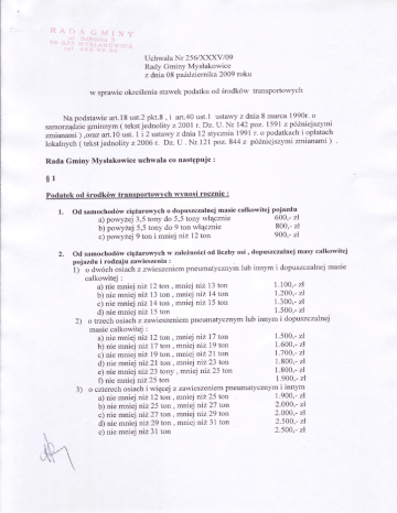 UchwalaNr 256D(XXV/09 RadyGminyMyslakowice 2009roku z dnia08 paZdziemika stawekpodatkuod Srodkówtransportowych w sprawieokreélenia Na podstawieart.18ust.2pkt.8, i art.40ust l ustawyz dnia 8 marca1990r'o samorzed;iegminnym( tekstj eánolity2 2001r ' Dz. U Nr 142poz' 1591z pó2niejszymi zmiana;i ),o-razart.10ust. I i2 ustawyz dnia12stycznia1991r. o podatkachi oplatach lokalnych(tekstjednolityz 2006r. Dz. U . Nr.121poz.844z pó2niejszymizmianami) Rada Gminy Myslakowiceuchwalaco nastppuje: sr t. 2. Od samochodówcig2arowycho dopuszczalnejmasiecalkowitej pojazdu a) powyzej3,5tony do 5,5tony wlqcznie b) powyzej5,5tonYdo 9 ton wl4cznie c) powyzej9 ton i mniej niL 12ron 600,-z\ 800,-zt 800,- zzll 900"- od liczby osi, dopuszczalneimasycalkowitej Orl samochodówcig2arowychw zale¿nosci : pojazdui rodzajuzawieszenia i;" o d*o.t osiachz zwieszeniempneumatycznymlub innym i dopuszczalnejmasie calkowitej: 1.100.-zl a) nie mniej ni? 12 ton, mniej niZ 13ton 1.200..200,-zt b) nie mniejniZ 13ton, mniejniZ 14ton 1 \.300,. 3 0 0 zL .c) nie mniejniz 14 ton, mniejniZ 15ton zl 1.500.1'500'd) nie mniej ni2 15ton i dopus: dopuszczalnej innym lub pneumatycznym 2) o trzechosiachz zawieszeniem : masiecalkowitej 1'500,-zl a) nie mniej Íiz 12 to17,mniej ni2 17ton 1'600'-zl b) niemniejni2l7 fon, mniejniZ 19ton 1 700,-zl c) nie mniejniz 19 ton, mniejni2 21 ton 1 800,-zl d) nie mniej nil 2I ton, mniejniZ 23 ton 1 800,-zl ej niemniejni223 tony, mniejniZ25 ton 1 900,-zl f.¡nie mniej riz25 fon i innym pneumatycznym 3) o czterechosiachi wiqcejz zawieszeniem 1 900,-z1 a) nie mniejni2 12ton , mniejniL 25 ton 2000'- zl' b) nie mniej niz 25 fon,mnielni227 ton 2'000'- zl cj nie mniej ni227 fo¡, mniejniZ 29 ton 2'500'-zl d) niemniejri229 ton, mniejniz 3l ton 2'500'-z+ e) niemnieini2 31ton l4cznie Od ci4gników siodlowych i balastowych przystosowanych.do uzywania pojazdów z nacze!4 lub przyczep4 o dopuszczalnej masie calkowitej zespolu od 3,5 tony i poni2ej12 ton 1.400,-zl Od ciqgników siodlorrTch i balastowych prrystosowanych-do u2ywania l4cznie z nacze"p4lub przyczep4 o dopuszczalnej masie calkowitej zespolu pojazdów równej lub wyiszej 12 ton lub innym pneumatyczllym l) o dwóchosiachz zawieszeniem zl 1.400,a) nie mniej niz 12 ton, mniej niz 18ton zl 1.500,b) niemniejniZ 18ton, mniejniZ25 ton zl 1.600,c) niemniej¡i225 fon, mniejniZ31 ton 2.000,-z1 d) nie mniejni23 I ton innym lub pneumatycznym 2) o trzechosiachz zawieszeniem 2.000,-zl niZ40 ton mniej 12 ron, a) nie mniej ni? 2.600,-zl b) nie mniej niz 40 ton Od przyczepi naczep, z wyj4tkiem zwi4zanychwyl4czniez.dzialalno3ci4rolnicz4 p.o*ndroo4 p""ez podatnikapodatku rolnego, które l4czniez pojazdemsilnikowym masgcalkowit4 : posiadaj4dopuszczaln4 Od 7 ton i ponizej12ton 1.200,-zl rolnicz4 wyl4czniez dzialalnoéci4 6, Od prryczepi naczep, z wyj4tkiemzwi4zanych silnikowym p.o*udron4pr"", pod"tnikupodatkurolnego,którel4czniez pojazdern : mas€calkowit4 dopuszczalnA posiadaj4 masie j"áit": osi z zawieszeniem lub innymi dopuszczalnej pner.rmatycznym i; "calkowitejzespolu Pojazdów: | 200'- zl a) nie mnieJni212 ton, mniejniz i 8 ton l'300,'z\ ni2 18ton, mniejniz 25 ton ú; niemnié.¡ 1 '300,-zi cj nie mniej Liz 25 fon lub innym i dopuszczalnej pneumatycznym 2) o dwáchosiach z zav¡ieszentem masiecalkowitejzespolupojazdów: 1.400,-zl a) nie mniej ni2 !2 fon, mniejni2 28 ton 1.400,-zl b) nie mniejniz 28 foí, mniejni2 33 ton 1.600,-zL c) niemniejniZ33ton, mniejniZ38ton 1.900,-z, d) nie mniej ni2 38 ton lub innym i dopuszczalnej pneumatycznym 3) o trzech osiachz zawieszeniem masie calkowitej zespolupojazdów : a) nie mniej íi2 12 ton, mniej ni2 38 ton b) nie mniej niZ 38 ton Od autobusów bezwzglgduna ilo5ómiejsc L 1 0 0 ,z- I 1.900,-zl zl 1.200,- $2 uchwala podlegaogloszeniuprzezrozplakatowaniena tablicy ogloszeúw urzqdzie Gminy oraz opublikowaniew prasielokalnej . $3 Z uplywem 3l grudnia2009roku traci moc uchwalaNr 78DilIl07 Rady Gminy Myslakowicez dnia 17 listopada2007r. w sprawiestawekpodatkuod érodków transportowychoraz wprowadzeniezwolnieú z tych podatków. s4 Wykonanieuchwaly powierzasig Wójtowi Gminy Myslakowice. $s Uchwalawchodzi w Zyciepo uplywie 14 dni od daty ogloszeniaw Dzienniku Urzqdowyrn od dnia 1 stycznia2010roku i ma zastosowanie WojewództwaDolnoÉl4skiego IIRZI' liadV ..rr i-.Zi\(lA i \ ' s : ¿ ii i o \ ' ; i t . e