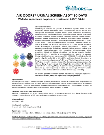 AIR ODORS® URINAL SCREEN ASD™ 30 DAYS Wkładka zapachowa do pisuaru z systemem ASD™, 30 dni Zakres zastosowania: Dezodorująca wkładka do pisuaru o trwałości zapachu około 30 dni. Stosowanie wkładki dodatkowo skraca czas czyszczenia pisuaru do 30% oraz zabezpiecza prewencyjnie odpływ pisuaru przed zatkaniem. Nowoczesny design i ciekawa kolorystyka pozwala na umiejscowienie wkładki praktycznie w każdej publicznej męskiej toalecie. Wkładka wydziela niepowtarzalny i dyskretny zapach wyczuwalny w toalecie. Elastyczny ekran, wykonany z wysokogatunkowego polimeru, posiada opatentowany system ASD™ (AntiSplash Device™), czyli odpowiedni kształt, wysokość i twardość włosia, co znacząco wpływa na redukcję rozprysku moczu, a tym samym zmniejsza ryzyko krzyżowego przenoszenia bakterii bezpośrednio z pisuaru, czy zabrudzenia garderoby. Dodatkowo poprawia higienę, estetykę podłogi oraz przegrody międzypisuarowej, nie powodując nieprzyjemnego odoru amoniaku. Wkładki nie blakną, nie żółkną i nie barwią ceramiki. Produkt biodegradowalny - zgodnie z przeprowadzonymi testami w zakresie biodegradacji beztlenowej wg normy ASTM- 0-5511-02. Produkt jest również zgodny z Dyrektywą EU LZO nr 1999/13/EC (pol. Lotne Związki Organiczne) w Europie, znane również pod nazwą V.O.C (ang. Volatile Organic Compounds) w U.S.A., jako produkty przyjazne środowisku. Dostępne są następujące zapachy i kolory: Berry (k. purpurowy), Spiced Apple (k. jasnozielony), Ice Mint (k. jasnoniebieski i k. czarny), Mango (k. pomarańczowy), Green Pine (k. zielony), Lavender (k. jasnopurpurowy) i Melon (k. czerwony). Wymiary wkładki wynoszą około: średnica 180 mm, wysokość 20 mm, waga netto 60 g. Air Odors® posiada kompletny system neutralizacji przykrych zapachów i umożliwia ułożenie jednej linii zapachowej w męskiej toalecie. Sposób użycia: Wkładkę należy wyjąć z opakowania przy pomocy jednorazowej rękawiczki i umiejscowić bezpośrednio w czystym pisuarze, wypustkami „do góry”. Podczas bieżącego mycia pisuaru wkładkę należy wyjąć. Wkładki nie należy czyścić i nasączać jakimikolwiek środkami chemicznymi, dezynfekującymi i zapachowymi. Po około 30 dniach użytkowania lub widocznym zużyciu wkładkę należy wymienić na nową. Składniki, karta MSDS i kraj pochodzenia: Zgodnie z zaleceniami UE. Przed rozpoczęciem pracy z preparatem zapoznaj się z kartą charakterystyki substancji niebezpiecznej MSDS. Wyprodukowano w Meksyku. Import z USA. Okres ważności: minimum 2 lata Opakowanie handlowe 1 op. x 2 szt. = 2 szt. (waga brutto 130 g) Sposób pakowania: 1 kart. x 12 box x 5 op. x 2 szt. = 120 szt., 1 box x 5 op. x 2 szt. = 10 szt. (waga brutto 820 g) Produkt do użytku profesjonalnego. Za szkody spowodowane niewłaściwym użyciem producent, importer/ dostawca nie ponosi odpowiedzialności. Importer: OPTIMAL 80-404 Gdańsk, ul. M. Reja 3, Poland, tel. +4858 762 25 55, tel/fax. +4858 763 43 89, e-mail: [email protected], http:// www.airodors.com