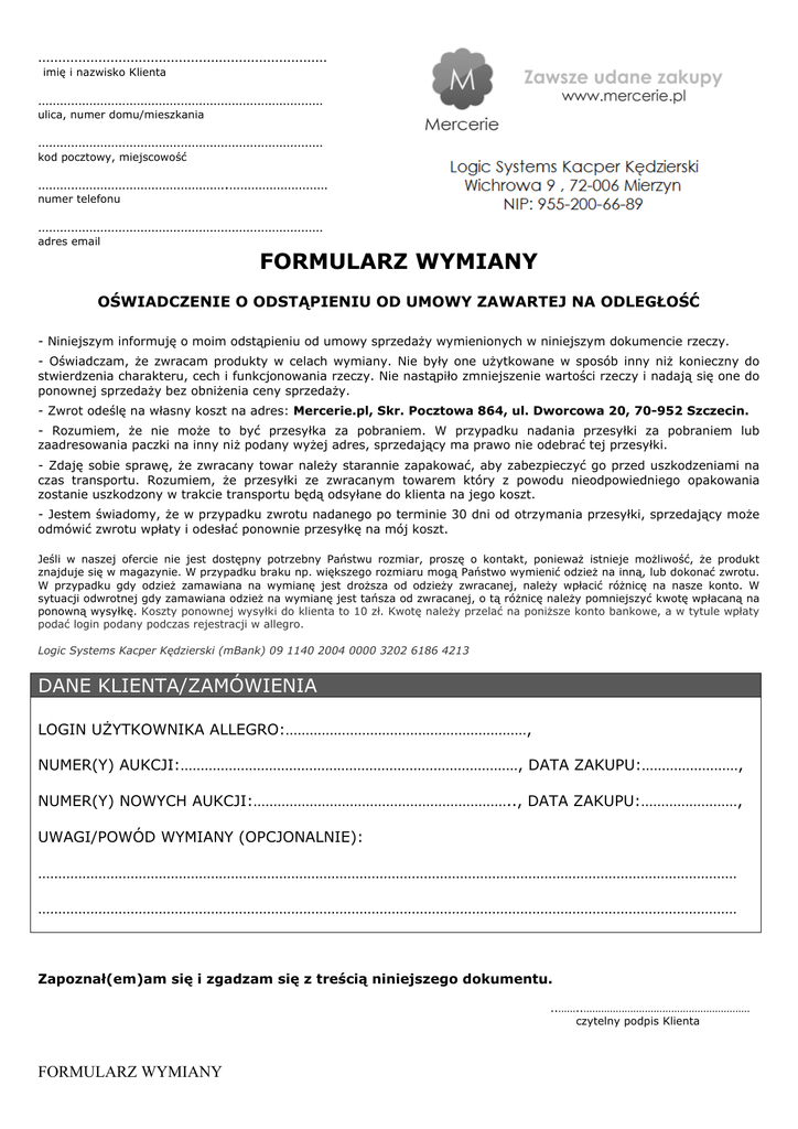 ……………………………………………………………… imię i nazwisko Klienta …………………………………………………………………… ulica, numer domu/mieszkania …………………………………………………………………… kod pocztowy, miejscowość …………………………………………….……………………… numer telefonu …………………………………………………………………… adres email FORMULARZ WYMIANY OŚWIADCZENIE O ODSTĄPIENIU OD UMOWY ZAWARTEJ NA ODLEGŁOŚĆ - Niniejszym informuję o moim odstąpieniu od umowy sprzedaży wymienionych w niniejszym dokumencie rzeczy. - Oświadczam, że zwracam produkty w celach wymiany. Nie były one użytkowane w sposób inny niż konieczny do stwierdzenia charakteru, cech i funkcjonowania rzeczy. Nie nastąpiło zmniejszenie wartości rzeczy i nadają się one do ponownej sprzedaży bez obniżenia ceny sprzedaży. - Zwrot odeślę na własny koszt na adres: Mercerie.pl, Skr. Pocztowa 864, ul. Dworcowa 20, 70-952 Szczecin. - Rozumiem, że nie może to być przesyłka za pobraniem. W przypadku nadania przesyłki za pobraniem lub zaadresowania paczki na inny niż podany wyżej adres, sprzedający ma prawo nie odebrać tej przesyłki. - Zdaję sobie sprawę, że zwracany towar należy starannie zapakować, aby zabezpieczyć go przed uszkodzeniami na czas transportu. Rozumiem, że przesyłki ze zwracanym towarem który z powodu nieodpowiedniego opakowania zostanie uszkodzony w trakcie transportu będą odsyłane do klienta na jego koszt. - Jestem świadomy, że w przypadku zwrotu nadanego po terminie 30 dni od otrzymania przesyłki, sprzedający może odmówić zwrotu wpłaty i odesłać ponownie przesyłkę na mój koszt. Jeśli w naszej ofercie nie jest dostępny potrzebny Państwu rozmiar, proszę o kontakt, ponieważ istnieje możliwość, że produkt znajduje się w magazynie. W przypadku braku np. większego rozmiaru mogą Państwo wymienić odzież na inną, lub dokonać zwrotu. W przypadku gdy odzież zamawiana na wymianę jest droższa od odzieży zwracanej, należy wpłacić różnicę na nasze konto. W sytuacji odwrotnej gdy zamawiana odzież na wymianę jest tańsza od zwracanej, o tą różnicę należy pomniejszyć kwotę wpłacaną na ponowną wysyłkę. Koszty ponownej wysyłki do klienta to 10 zł. Kwotę należy przelać na poniższe konto bankowe, a w tytule wpłaty podać login podany podczas rejestracji w allegro. Logic Systems Kacper Kędzierski (mBank) 09 1140 2004 0000 3202 6186 4213 DANE KLIENTA/ZAMÓWIENIA LOGIN UŻYTKOWNIKA ALLEGRO:……………………………………………………, NUMER(Y) AUKCJI:…………………………………………………………………………, DATA ZAKUPU:……………………, NUMER(Y) NOWYCH AUKCJI:……………………………………………………….., DATA ZAKUPU:……………………, UWAGI/POWÓD WYMIANY (OPCJONALNIE): ………………………………………………………………………………………………………………………………………………………… ………………………………………………………………………………………………………………………………………………………… Zapoznał(em)am się i zgadzam się z treścią niniejszego dokumentu. ..……..………………………………………………… czytelny podpis Klienta FORMULARZ WYMIANY
