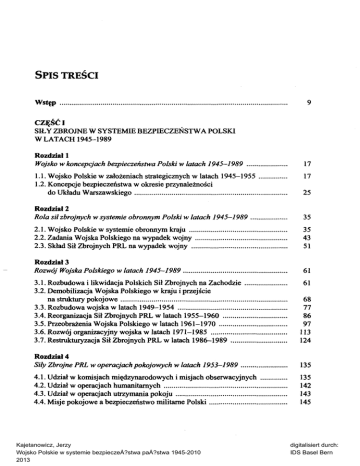 SPIS TREŚCI Wstęp SIŁY ZBROJNE W SYSTEMIE BEZPIECZEŃSTWA POLSKI W LATACH 1945-1989 Rozdział 1 Wojsko w koncepcjach bezpieczeństwa Polski w latach 17 1.1. Wojsko Polskie w założeniach strategicznych w latach 1945-1955 Koncepcje bezpieczeństwa w okresie przynależności do Układu Warszawskiego 25 Rozdział 2 Rola sił zbrojnych w systemie obronnym Polski w latach 1945-1989 35 2.1. Wojsko Polskie w systemie obronnym kraju 2.2. Zadania Wojska Polskiego na wypadek wojny 2.3. Skład Sił Zbrojnych PRL na wypadek wojny Rozdział 3 Rozwój Wojska Polskiego w latach 1945-1989 17 35 43 61 3.1. Rozbudowa i Polskich Sił Zbrojnych na Zachodzie 3.2. Demobilizacja Wojska Polskiego w kraju i przejście na struktury pokojowe 3.3. Rozbudowa wojska w latach 1949-1954 3.4. Reorganizacja Sił Zbrojnych PRL w latach 1955-1960 3.5. Przeobrażenia Wojska Polskiego w latach 1961-1970 3.6. Rozwój organizacyjny wojska w latach 1971-1985 3.7. Restrukturyzacja Sił Zbrojnych PRL w latach 124 Rozdział 4 Zbrojne PRL w operacjach pokojowych w latach 1953-1989 135 4.1. Udział w komisjach międzynarodowych i misjach obserwacyjnych 4.2. Udział w operacjach humanitarnych 4.3. Udział w operacjach utrzymania pokoju 4.4. Misje pokojowe a bezpieczeństwo militarne Polski 135 142 143 145 Kajetanowicz, Jerzy Wojsko Polskie w systemie bezpieczeÅ?stwa paÅ?stwa 1945-2010 2013 61 68 77 86 97 digitalisiert durch: IDS Basel Bern CZĘŚĆ II WOJSKO POLSKIE W SYSTEMIE BEZPIECZEŃSTWA PAŃSTWA W LATACH 1990-2010 Rozdział 1 Wojsko w strategiach bezpieczeństwa III Rzeczypospolitej 1.1. Siły zbrojne w strategiach bezpieczeństwa Polski w latach 1.2. Rola wojska w strategiach bezpieczeństwa państwa w latach Rozdział 2 Rola sił zbrojnych w systemie bezpieczeństwa III RP 2.1. Przeobrażenia sytemu bezpieczeństwa państwa w latach 2.2. Zmiany w systemie bezpieczeństwa państwa w latach 2.3. Zadania sił zbrojnych w sytuacji zagrożenia bezpieczeństwa militarnego państwa 2.4. Skład Sił Zbrojnych RP na wypadek wojny Rozdział 3 Rozwój Wojska Polskiego w latach 3.1. Zmiany składu wojska w okresie transformacji ustrojowej 3.2. Siły Zbrojne RP w latach 151 151 155 169 169 174 181 185 191 191 206 Rozdział 4 Siły Zbrojne RP w operacjach na rzecz utrzymania pokoju w latach 4.1. Udział w misjach obserwacyjnych 4.2. Udział w operacjach utrzymania pokoju 4.3. Udział w pokojowych operacjach stabilizacyjnych i wymuszania pokoju 4.4. Misje pokojowe a bezpieczeństwo militarne Polski 219 224 228 238 Zakończenie 245 Załączniki Nr Węzłowe założenia obronne Polskiej Rzeczypospolitej Ludowej z 31 października 1973 r Nr 2. Doktryna obronna Rzeczypospolitej Polskiej z 1990 r Założenia polskiej polityki bezpieczeństwa Polityka bezpieczeństwa i strategia obronna Rzeczypospolitej Polskiej z 1992 r Nr 4. Strategia bezpieczeństwa Rzeczypospolitej Polskiej z 4 stycznia 2000 r Nr 5. Strategia obronności Rzeczypospolitej Polskiej z 23 maja 2000 r 251 263 273 293 313 Nr 6. Strategia bezpieczeństwa narodowego Rzeczypospolitej Polskiej z 22 lipca 2003 r Nr 7. Strategia bezpieczeństwa narodowego Rzeczypospolitej Polskiej z 2007 r Nr Strategia obronności Rzeczypospolitej Polskiej z 2009 r Bibliografia 339 357 417 Wykaz najczęściej używanych skrótów Wykaz tabel 435 Wykaz schematów 437