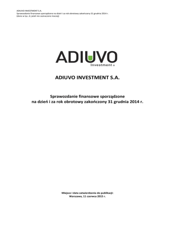 ADIUVO INVESTMENT S.A. Sprawozdanie finansowe sporządzone na dzień i za rok obrotowy zakończony 31 grudnia 2014 r. (dane w tys. zł, jeżeli nie zaznaczono inaczej) ADIUVO INVESTMENT S.A. Sprawozdanie finansowe sporządzone na dzień i za rok obrotowy zakończony 31 grudnia 2014 r. Miejsce i data zatwierdzenia do publikacji: Warszawa, 11 czerwca 2015 r. ADIUVO INVESTMENT S.A. Sprawozdanie finansowe sporządzone na dzień i za rok obrotowy zakończony 31 grudnia 2014 r. (dane w tys. zł, jeżeli nie zaznaczono inaczej) SPIS TREŚCI RACHUNEK ZYSKÓW I STRAT ..................................................................................................................................... 4 SPRAWOZDANIE Z DOCHODÓW CAŁKOWITYCH....................................................................................................... 5 SPRAWOZDANIE Z SYTUACJI FINANSOWEJ ............................................................................................................... 6 SPRAWOZDANIE ZE ZMIAN W KAPITALE WŁASNYM ................................................................................................ 7 SPRAWOZDANIE Z PRZEPŁYWÓW PIENIĘŻNYCH ...................................................................................................... 8 DODATKOWE INFORMACJE I OBJAŚNIENIA .............................................................................................................. 9 Nota 1 Informacje ogólne ........................................................................................................................................ 9 Nota 2 Skład Zarządu oraz Rady Nadzorczej Spółki ................................................................................................. 9 2.1 Zarząd .............................................................................................................................................................. 9 2.2 Rada Nadzorcza ............................................................................................................................................. 10 Nota 3 Zatwierdzenie sprawozdania finansowego ................................................................................................ 10 Nota 4 Opis ważniejszych stosowanych zasad rachunkowości .............................................................................. 10 4.1 Podstawa sporządzenia sprawozdania finansowego .................................................................................... 10 4.2 Waluta funkcjonalna i waluta sprawozdawcza ............................................................................................. 10 4.3 Nowe standardy i interpretacje .................................................................................................................... 11 4.4 Zmiany stosowanych zasad rachunkowości .................................................................................................. 15 4.5 Polityka rachunkowości ................................................................................................................................. 15 4.5.1 Przeliczenie pozycji wyrażonych w walutach obcych ................................................................................. 15 4.5.2 Rzeczowe aktywa trwałe ............................................................................................................................ 15 4.5.3 Koszty finansowania zewnętrznego ........................................................................................................... 16 4.5.4 Nieruchomości inwestycyjne ..................................................................................................................... 16 4.5.5 Leasing i prawo wieczystego użytkowania gruntu ..................................................................................... 17 4.5.6 Wartości niematerialne .............................................................................................................................. 17 4.5.7 Utrata wartości aktywów niefinansowych ................................................................................................. 18 4.5.8 Instrumenty finansowe .............................................................................................................................. 19 4.5.9 Zapasy ........................................................................................................................................................ 22 4.5.10 Należności z tytułu dostaw i usług oraz pozostałe należności ................................................................. 23 4.5.11 Środki pieniężne i ekwiwalenty środków pieniężnych ............................................................................. 24 4.5.12 Aktywa trwałe przeznaczone do zbycia ................................................................................................... 24 4.5.13 Kapitał własny .......................................................................................................................................... 24 4.5.14 Oprocentowane kredyty bankowe, pożyczki i papiery dłużne................................................................. 24 4.5.15 Zobowiązania z tytułu dostaw i usług oraz pozostałe zobowiązania ....................................................... 25 4.5.16 Rezerwy .................................................................................................................................................... 25 4.5.17 Zobowiązania i aktywa warunkowe ......................................................................................................... 25 4.5.18 Świadczenia pracownicze ......................................................................................................................... 25 4.5.19 Płatności w formie akcji ....................................................................................................................
