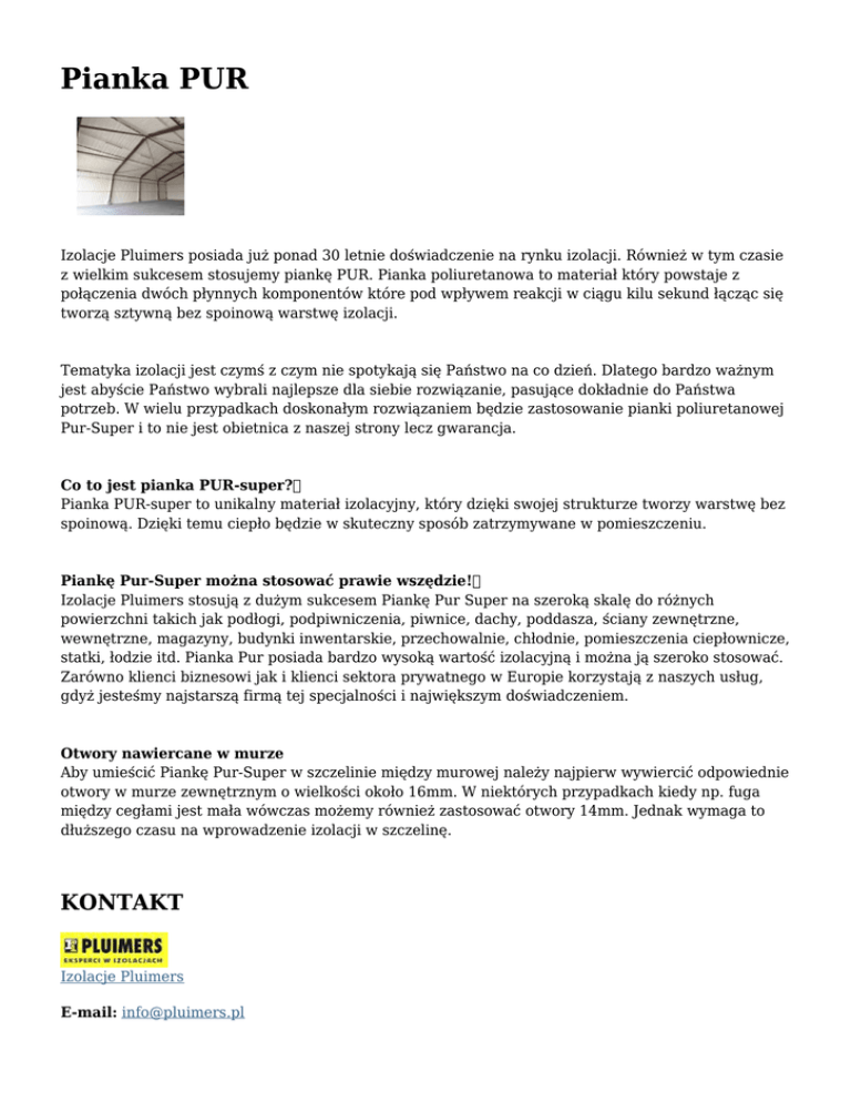 Pianka PUR Izolacje Pluimers posiada już ponad 30 letnie doświadczenie na rynku izolacji. Również w tym czasie z wielkim sukcesem stosujemy piankę PUR. Pianka poliuretanowa to materiał który powstaje z połączenia dwóch płynnych komponentów które pod wpływem reakcji w ciągu kilu sekund łącząc się tworzą sztywną bez spoinową warstwę izolacji. Tematyka izolacji jest czymś z czym nie spotykają się Państwo na co dzień. Dlatego bardzo ważnym jest abyście Państwo wybrali najlepsze dla siebie rozwiązanie, pasujące dokładnie do Państwa potrzeb. W wielu przypadkach doskonałym rozwiązaniem będzie zastosowanie pianki poliuretanowej Pur-Super i to nie jest obietnica z naszej strony lecz gwarancja. Co to jest pianka PUR-super? Pianka PUR-super to unikalny materiał izolacyjny, który dzięki swojej strukturze tworzy warstwę bez spoinową. Dzięki temu ciepło będzie w skuteczny sposób zatrzymywane w pomieszczeniu. Piankę Pur-Super można stosować prawie wszędzie! Izolacje Pluimers stosują z dużym sukcesem Piankę Pur Super na szeroką skalę do różnych powierzchni takich jak podłogi, podpiwniczenia, piwnice, dachy, poddasza, ściany zewnętrzne, wewnętrzne, magazyny, budynki inwentarskie, przechowalnie, chłodnie, pomieszczenia ciepłownicze, statki, łodzie itd. Pianka Pur posiada bardzo wysoką wartość izolacyjną i można ją szeroko stosować. Zarówno klienci biznesowi jak i klienci sektora prywatnego w Europie korzystają z naszych usług, gdyż jesteśmy najstarszą firmą tej specjalności i największym doświadczeniem. Otwory nawiercane w murze Aby umieścić Piankę Pur-Super w szczelinie między murowej należy najpierw wywiercić odpowiednie otwory w murze zewnętrznym o wielkości około 16mm. W niektórych przypadkach kiedy np. fuga między cegłami jest mała wówczas możemy również zastosować otwory 14mm. Jednak wymaga to dłuższego czasu na wprowadzenie izolacji w szczelinę. KONTAKT Izolacje Pluimers E-mail: [email protected] WWW: www.pluimers.pl Tel: +48 24 253 87 70 Adres: Wojska Polskiego 10 A 99-300 Kutno