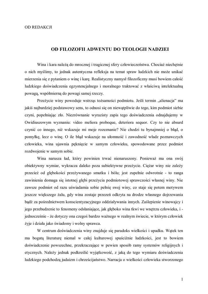 OD REDAKCJI OD FILOZOFII ADWENTU DO TEOLOGII NADZIEI Wina i kara należą do mrocznej i tragicznej sfery człowieczeństwa. Chociaż niechętnie o nich myślimy, to jednak autentyczna refleksja na temat spraw ludzkich nie może unikać mierzenia się z pytaniem o winę i karę. Realistyczny namysł filozoficzny musi bowiem całość ludzkiego doświadczenia egzystencjalnego i moralnego traktować z właściwą intelektualną powagą, współmierną do powagi samej rzeczy. Przeżycie winy powoduje wstrząs tożsamości podmiotu. Jeśli termin „alienacja” ma jakiś najbardziej podstawowy sens, to odnosi się on niewątpliwie do tego, kim podmiot siebie czyni, popełniając zło. Niezrównanie wyrazisty zapis tego doświadczenia odnajdujemy w Owidiuszowym wyznaniu: video meliora proboque, deteriora sequor. Czy to nie absurd czynić co innego, niż wskazuje mi moje rozeznanie? Nie chodzi tu bynajmniej o błąd, o pomyłkę, lecz o winę. O ile błąd wskazuje na ułomność i zawodność władz poznawczych człowieka, wina ujawnia pęknięcie w samym człowieku, spowodowane przez podmiot rozdwojenie w samym sobie. Wina narusza ład, który powinien trwać nienaruszony. Ponieważ ma ona swój obiektywny wymiar, wykracza daleko poza subiektywne przeżycie. Ciężar winy nie zależy przecież od głębokości przeżywanego smutku i bólu; jest zupełnie odwrotnie - to ranga zawinienia domaga się istotnej głębi przeżycia podmiotowej sprawczości własnej winy. Nie zawsze podmiot od razu uświadamia sobie pełnię swej winy, co staje się potem motywem jeszcze większego żalu, gdy wina zostaje przezeń odkryta na drodze własnego dojrzewania bądź za pośrednictwem konscientyzacyjnego oddziaływania innych. Zaślepienie winowajcy i jego przebudzenie to fenomeny odsłaniające, jak głęboko wina tkwi we wnętrzu człowieka, i jednocześnie - że dotyczy ona czegoś bardzo ważnego w realnym świecie, w którym człowiek żyje i działa jako świadomy i wolny sprawca. W centrum doświadczenia winy znajduje się paradoks wielkości i upadku. Wątek ten ma bogatą literaturę niemal w całej kulturowej spuściźnie ludzkości, jest to bowiem doświadczenie powszechne, przekraczające w pewien sposób ramy systemów religijnych i etycznych. Należy jednak podkreślić wyjątkowość, z jaką do tego wymiaru doświadczenia ludzkiego podchodzą judaizm i chrześcijaństwo. Narracja o wielkości człowieka stworzonego 1 na obraz i podobieństwo Boga i o jego upadku wskutek grzechu stanowi jądro biblijnej antropologii. Doktryna chrześcijańska ujmuje to tragiczne dla kondycji ludzkiej doświadczenie w kategorii grzechu pierworodnego, za sprawą którego człowiek dąży do ustanowienia świata poza Bogiem i wbrew Bogu. Według Hegla grzech pierworodny jest początkiem ludzkich dziejów, pozwala on człowiekowi stać się wyłącznym protagonistą historii. Trudno nie zdumieć się tym, że oświeceniowa próba życia poza Bogiem, według założenia etsi Deus non daretur, wynika z negacji grzechu pierworodnego i jednocześnie staje się jego monstrualną egzemplifikacją w historii i w kulturze. Wszystkie ludzkie rozdroża zdają się sprowadzać do najbardziej pierwotnej pokusy zajęcia miejsca Boga przez człowieka. Objawienie judeochrześcijańskie ontologiczny fundament ludzkiej winy i jej fenomenologię sytuuje w przestrzeni Bosko-ludzkiego dramatu. W świetle doświadczenia winy antropologia bez teologii pozostaje niedokończona, co więcej, staje się niezrozumiała. Wina i kara są tak podstawowymi fenomenami ludzkiego życia, towarzyszącymi człowiekowi w ciągu całych dziejów, że zrozumiałe staje się, iż problematyka ta znajduje żywe odzwierciedlenie w tekstach religijnych oraz w literaturze pięknej. Ta ostatnia dostarcza wstrząsających opisów zarówno aktów, które obciążają człowieka winą, jak i opisów kary, jaka go za to spotyka. W literaturze nie brakuje także wnikliwych przedstawień procesu odkrywania i uznawania winy. Począwszy od starotestamentalnych Psalmów, poezja potrafi wyrazić błaganie grzesznika o miłosierdzie. W błagalnym głosie Psalmisty, podobnie jak w głosie skruchy i prośby wyrażanej przez poetów różnych epok, grzesznik może rozpoznać swój własny głos. Poznawczej, katarktycznej i pokutnej roli słowa nie sposób przecenić. Mówienie o winie i karze z konieczności musi zaczynać się od wypowiedzi w pierwszej osobie i nie może ono być monologiem bez adresata. Emblematycznym przykładem tego typu ewokacji jest psalm De profundis. Z głębokości wołam do Ciebie, Panie, o Panie, wysłuchaj głosu mego! Nakłoń swoich uszu ku głośnemu błaganiu mojemu! Jeśli zachowasz pamięć o grzechach, Panie, Panie, któż się ostoi? Ale Ty udzielasz przebaczenia, aby Ci służono z bojaźnią. W Panu pokładam nadzieję, 2 nadzieję żywi moja dusza, czeka na Twe słowo. Dusza moja oczekuje Pana bardziej niż strażnicy świtu, bardziej niż strażnicy świtu. Ps 130, 1-6 Tematyka winy i kary w ujęciu obiektywizującym staje się z kolei przedmiotem zainteresowania licznych dyscyplin opisowych, takich jak: historia, kulturoznawstwo, psychologia i socjologia, oraz nauk normatywnych: prawa i pedagogiki. Bogata wiedza empiryczna i normatywna na temat winy i kary domaga się osadzenia jej na fundamencie mądrościowym, uwzględniającym sedno ludzkiego dramatu, jako niezbędna jawi się refleksja filozoficzna i teologiczna. Problematyka winy i kary nie tylko niesie interesujące szczegółowe kwestie do rozważenia przez filozofię i teologię, ale jej aktualność, wypływająca ze stałego ciągle obecnego i niezmiennie niepokojącego - doświadczenia winy, przesądza o aktualności samego dyskursu filozoficznego i teologicznego, którego celem jest pełniejsze poznanie człowieka. Pytanie o winę i karę staje się również pytaniem o filozofię i teologię. Jaka filozofia i jaka teologia dysponują kluczem do adekwatnego traktowan