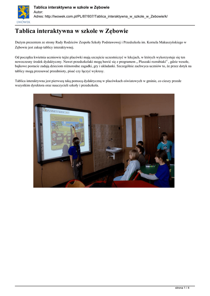Tablica interaktywna w szkole w Zębowie Autor: Adres: http://lwowek.com.pl/PL/87/937/Tablica_interaktywna_w_szkole_w_Zebowie/k/ Tablica interaktywna w szkole w Zębowie Dużym prezentem ze strony Rady Rodziców Zespołu Szkoły Podstawowej i Przedszkola im. Kornela Makuszyńskiego w Zębowie jest zakup tablicy interaktywnej. Od początku kwietnia uczniowie tejże placówki mają szczęście uczestniczyć w lekcjach, w których wykorzystuje się ten nowoczesny środek dydaktyczny. Nawet przedszkolaki mogą bawić się z programem „ Pluszaki rozrabiaki” , gdzie wesołe, bajkowe postacie zadają dzieciom różnorodne zagadki, gry i układanki. Szczególnie zachwyca uczniów to, że przez dotyk na tablicy mogą przesuwać przedmioty, pisać czy łączyć wykresy. Tablica interaktywna jest pierwszą taką pomocą dydaktyczną w placówkach oświatowych w gminie, co cieszy przede wszystkim dyrektora oraz nauczycieli szkoły i przedszkola. strona 1 / 4 Tablica interaktywna w szkole w Zębowie Autor: Adres: http://lwowek.com.pl/PL/87/937/Tablica_interaktywna_w_szkole_w_Zebowie/k/ strona 2 / 4 Tablica interaktywna w szkole w Zębowie Autor: Adres: http://lwowek.com.pl/PL/87/937/Tablica_interaktywna_w_szkole_w_Zebowie/k/ strona 3 / 4 Tablica interaktywna w szkole w Zębowie Autor: Adres: http://lwowek.com.pl/PL/87/937/Tablica_interaktywna_w_szkole_w_Zebowie/k/ strona 4 / 4 Powered by TCPDF (www.tcpdf.org)