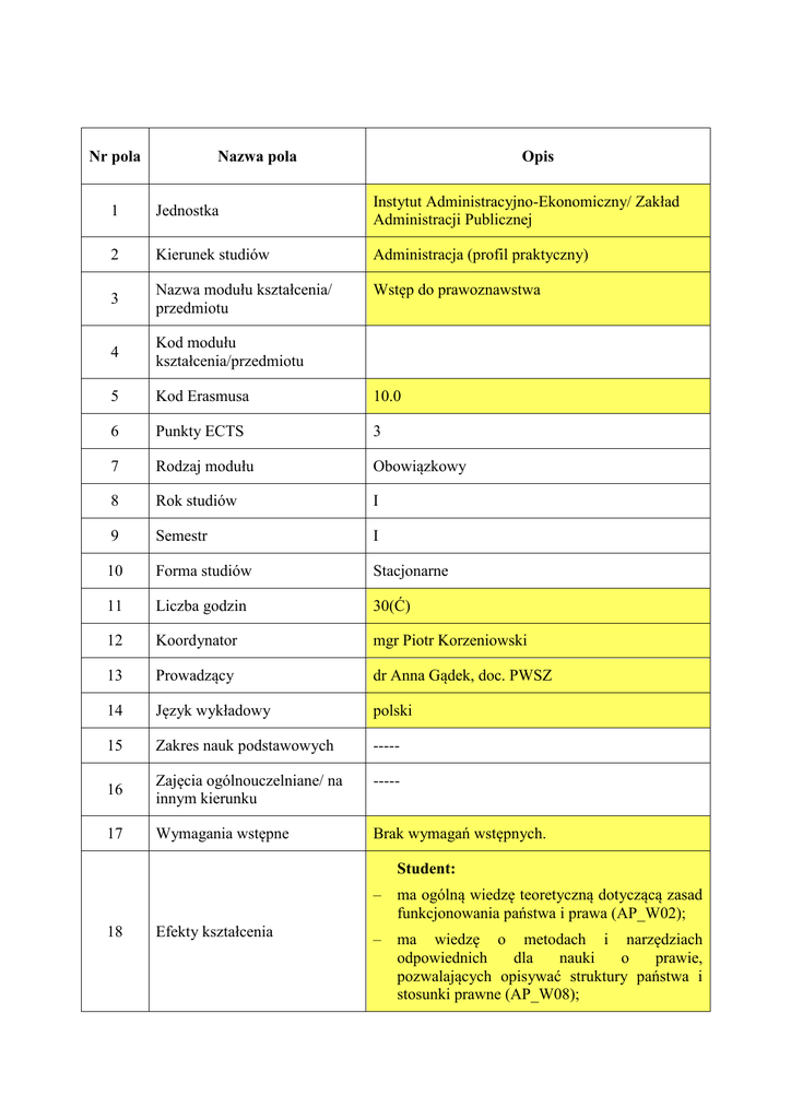 Nr pola Nazwa pola Opis 1 Jednostka Instytut Administracyjno-Ekonomiczny/ Zakład Administracji Publicznej 2 Kierunek studiów Administracja (profil praktyczny) 3 Nazwa modułu kształcenia/ przedmiotu Wstęp do prawoznawstwa 4 Kod modułu kształcenia/przedmiotu 5 Kod Erasmusa 10.0 6 Punkty ECTS 3 7 Rodzaj modułu Obowiązkowy 8 Rok studiów I 9 Semestr I 10 Forma studiów Stacjonarne 11 Liczba godzin 30(Ć) 12 Koordynator mgr Piotr Korzeniowski 13 Prowadzący dr Anna Gądek, doc. PWSZ 14 Język wykładowy polski 15 Zakres nauk podstawowych ----- 16 Zajęcia ogólnouczelniane/ na innym kierunku ----- 17 Wymagania wstępne Brak wymagań wstępnych. Student: 18 Efekty kształcenia – ma ogólną wiedzę teoretyczną dotyczącą zasad funkcjonowania państwa i prawa (AP_W02); – ma wiedzę o metodach i narzędziach odpowiednich dla nauki o prawie, pozwalających opisywać struktury państwa i stosunki prawne (AP_W08); 19 Stosowane metody dydaktyczne – potrafi posługiwać się podstawowymi pojęciami prawnymi oraz wykorzystywać podstawową wiedzę teoretyczną do szczegółowego opisu i praktycznego analizowania sytuacji prawnych (AP_U01), (AP_U12); – potrafi współdziałać i pracować w grupie oraz uczestniczyć w przygotowaniu różnorodnych projektów społecznych (AP_K05); – prawidłowo identyfikuje i rozstrzyga dylematy prawne, etyczne i moralne związane z pełnieniem różnych ról społecznych i zawodowych (AP_K03). Dominujące metody nauczania praktycznego, tj. praca z aktem normatywnym, pokaz, praca z literaturą, rozwiązywanie casusów, ćwiczenia praktyczne. Systematyczna ocena poziomu wiedzy (pytania ustne na zajęciach oraz 1 kolokwium zawierające pytania otwarte); Systematyczna ocena umiejętności studenta wynikająca z poziomu wykonanych zadań, rozwiązanych casusów i wymaganych ćwiczeń; 20 Metody sprawdzania i kryteria oceny efektów kształcenia Systematyczna ocena prezentowanych postaw społecznych tj. umiejętność pracy w grupie, gotowość do samokształcenia, zaangażowanie, etyka i kultura osobista. Wymagana jest obecność na wszystkich zajęciach (nieobecność można odrobić z inną grupą lub podczas indywidualnych konsultacji). Warunkiem zaliczenia jest uzyskanie pozytywnej oceny końcowej, liczonej jako średnia arytmetyczna ocen cząstkowych uzyskiwanych wg wyżej wymienionych zasad, przy założeniu że: 1. Ocena niedostateczna (2,0): wystawiana jest wtedy, jeśli w zakresie co najmniej jednej z trzech składowych (W,U lub K) przedmiotowych efektów kształcenia student nie zrealizował zakładanych efektów kształcenia. 2. Ocena dostateczna (3,0): wystawiana jest wtedy, jeśli w zakresie każdej z trzech składowych (W,U lub K) student zrealizuje zakładane efekty oraz opanuje obowiązujący materiał przynajmniej w 50%. 2 Forma i warunki zaliczenia 3. Ocena ponad dostateczna (3,5): wystawiana jest wtedy, jeśli w zakresie każdej z trzech składowych (W,U lub K) student zrealizuje zakładane efekty oraz opanuje obowiązujący materiał przynajmniej w 61 – 70%. 4. Ocena dobra (4,0): wystawiana jest wtedy, jeśli w zakresie każdej z trzech składowych (W,U lub K) student zrealizuje zakładane efekty oraz opanuje obowiązujący materiał przynajmniej w 71 – 80%. 5. Ocena ponad dobra (4,5): wystawiana jest wtedy, jeśli w zakresie każdej z trzech składowych (W,U lub K) student zrealizuje zakładane efekty oraz opanuje obowiązujący materiał przynajmniej w 81 – 90%. 22 Treści kształcenia (skrócony opis) 6. Ocena bardzo dobra (5,0): wystawiana jest wtedy, jeśli w zakresie każdej z trzech składowych (W,U lub K) student zrealizuje zakładane efekty oraz opanuje obowiązujący materiał przynajmniej w 91%. 1. Przedmiot i podstawowe problemy badawcze prawoznawstwa. 2. Podstawowe działy i dyscypliny prawoznawstwa. 3. Poglądy na istotę prawa i jego społeczne funkcje. 4. Prawo a inne porządki normatywne. 5. Rola prawa w organizacji państwowej. 6. Podstawowe pojęcia charakterystyczne dla 23 Treści kształcenia (pełny opis) nauk prawnych. 1. Przedmiot i podstawowe problemy badawcze prawoznawstwa. Podstawowe działy i dyscypliny prawoznawstwa. 2. Poglądy na istotę prawa i jego społeczne funkcje: organizacyjna, ochronna, kontrolna, represyjna, wychowawcza, rozstrzygania konfliktów. 3. Prawo a inne porządki normatywne. 4. Pojęcie systemu prawa. Działy systemu prawa. 5. Gałęzie prawa. 6. Świadomość prawna i kultura prawna. Główne kultury prawne. 7. Źródła prawa i tworzenie prawa. 8. System źródeł prawa Rzeczpospolitej Polskiej. 9. Pojecie przepisu prawnego. Rodzaje przepisów prawnych 10. Budowa aktu normatywnego. 11. Ogłaszanie aktów normatywnych i ich wejście w życie. 12. Norma prawna. Elementy normy prawnej i jej rodzaje. 13. Obowiązywanie prawa w czasie i przestrzeni. 14. Pojecie i wykładni prawa i jej rodzaje. 15. Dyrektywy interpretacyjne. 16. Luki i analogie w prawie. 17. Wnioskowania i argumentacje prawnicze. 18. Struktura prawa. Tworzenie prawa. 19. Stosowanie prawa, model decyzyjny sądowego stosowania prawa. 20. Zdarzenia prawne i ich klasyfikacja. 21. Podział zdarzeń prawnych. 22. Stosunki prawne. Rodzaje stosunków prawnych. 23. Podmioty prawa. 24. Osoby fizyczne. 25. Osoby prawne. Niepełne (ułomne) osoby prawne. 26. Zdolność. prawna i zdolność do czynności prawnych. 27. Odpowiedzialność prawna. 28. Typowe postawy wobec prawa. Legalizm, konformizm, oportunizm, anarchizm. 29. Pojęcie państwa. Teorie powstania państwa. 30. Atrybuty państwa. Literatura podstawowa: 24 Literatura podstawowa i uzupełniająca – Korybski, L. Leszczyński, A. Pieniążek, Wstęp do prawoznawstwa, Lublin (najnowsze wydanie). – J. Nowacki, Z. Tobor, Wstęp do prawoznawstwa, Katowice 2007, Literatura uzupełniająca: 25 Przyporządkowanie modułu kształcenia/ przedmiotu do obszaru/ obszarów kształcenia – T. Darecki, P. Winczorek, Wstęp prawoznawstwa, wyd. C.H. Beck, 2009. – K. Dobrzeniecki, 