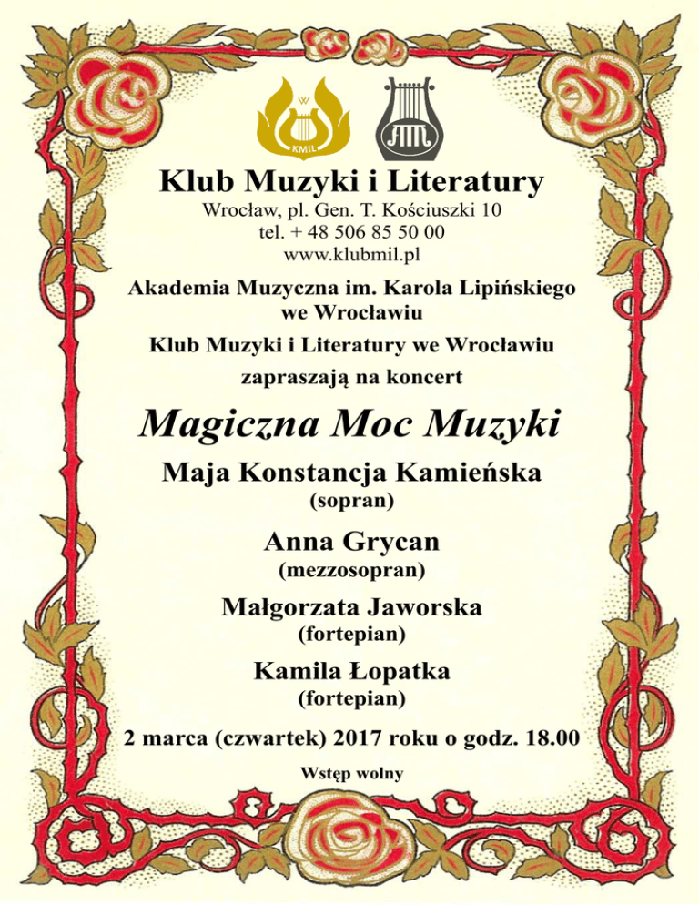Klub Muzyki i Literatury Wrocław, pl. Gen. T. Kościuszki 10 tel. + 48 506 85 50 00 www.klubmil.pl Akademia Muzyczna im. Karola Lipińskiego we Wrocławiu Klub Muzyki i Literatury we Wrocławiu zapraszają na koncert Magiczna Moc Muzyki Maja Konstancja Kamieńska (sopran) Anna Grycan (mezzosopran) Małgorzata Jaworska (fortepian) Kamila Łopatka (fortepian) 2 marca (czwartek) 2017 roku o godz. 18.00 Wstęp wolny