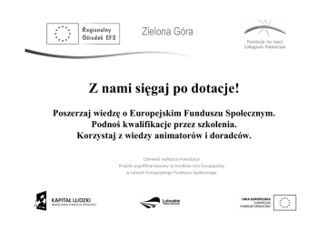 Zielona Góra Z nami sięgaj po dotacje! Poszerzaj wiedzę o Europejskim Funduszu Społecznym. Podnoś kwalifikacje przez szkolenia. Korzystaj z wiedzy animatorów i doradców. Człowiek najlepsza inwestycja Projekt współfinansowany ze środków Unii Europejskiej w ramach Europejskiego Funduszu Społecznego Celem Regionalnego Ośrodka Europejskiego Funduszu Społecznego w Zielonej Górze jest wspieranie wszystkich, którzy są zainteresowani dotacjami z Europejskiego Funduszu Społecznego. Znamy problemy związane z pisaniem wniosków, realizacją projektów. Przerabialiśmy je wielokrotnie w organizacjach pozarządowych, w których działamy lub działaliśmy. Przykłady czerpiemy z Ŝycia, gdyŜ w naszym ośrodku pracują osoby z wieloletnim doświadczeniem w projektach. U nas dowiesz się wszystkiego o EFS, o bieŜących konkursach, skorzystasz ze szkoleń. Uzyskasz pomoc w przygotowaniu i realizacji projektów, wstępną opinię o wniosku, moŜesz umówić się na konsultacje z doradcą lub animatorem lokalnym. Wspieramy takŜe inicjatywy, pomagamy w przekształcaniu pomysłów w dobre projekty, diagnozowaniu lokalnych potrzeb, tworzeniu planów działania. Nasz ośrodek świadczy następujące usługi: 1. Zachęcanie potencjalnych projektodawców do aplikowania o środki z EFS. 2. Usługa informacyjna na temat moŜliwości udziału w projekcie współfinansowanym ze środków EFS. 3. Konsultacje na temat moŜliwości współfinansowania projektu ze środków EFS. 4. Pomoc w przygotowaniu projektu kwalifikującego się o dofinansowanie z EFS. 5. Pomoc we wdraŜaniu projektu współfinansowanego ze środków EFS. 6. Animowanie inicjatyw lokalnych, zawieranie partnerstw. Wszyscy projektodawcy, którzy chcą skorzystać ze wsparcia EFS, dzięki ośrodkowi mogą: 1. Uczestniczyć w szkoleniach z zakresu przygotowania projektów EFS, prowadzonych przez akredytowanych trenerów (m.in. z zarządzania projektem, jego monitoringu i kontroli finansowej). 2. Skorzystać z pomocy doradców na kaŜdym etapie: przy pla-no-wa-niu projektów, w trak-cie przy-go-to-wa-nia wnio-sku o dofinansowanie, reali-za-cji czy roz-li-cza-niu dota-cji ze środ-ków EFS. Pod-czas indy-wi-du-al-nych spo-tkań, doradca opie-ra-jąc się na infor-ma-cjach i mate-ria-łach prze-ka-za-nych przez Państwa, stara się zna-leźć optymalne roz-wią-za-nie pro-ble-mów. 3. Skorzystać z pomocy animatorów, którzy wspierają lokalne inicjatywy współpracy, słuŜą pomocą i inspiracją przy przekształcaniu pomysłów w dobre projekty oraz pomagają w diagnozowaniu lokalnych potrzeb lub tworzeniu planów działania organizacji. 4. Dokonać wstępnej oceny wniosków. 5. Uczestniczyć w spotkaniach informacyjnych, konferencjach i seminariach promujących Europejski Fundusz Społeczny. Usługi świadczone są bezpłatnie, bez-po-śred-nio w sie-dzi-bie ośrodka, a takŜe w siedzibie projektodawcy! Prowadzimy klienta przez całą ścieŜkę: od identyfikacji problemu poprzez przygotowanie i realizację projektu do jego zakończenia. Eksperci ośrodka asystują, wspierają projektodawcę, ale nie wykonują za niego zadań związanych z przygotowaniem i realizacją projektu. Kto moŜe skorzystać z naszej pomocy? Instytucje rynku pracy (publiczne słuŜby zatrudnienia, Ochotnicze Hufce Pracy, agencje zatrudnienia, instytucje szkoleniowe, instytucje dialogu społecznego i partnerstwa lokalnego, czyli związki zawodowe, pracodawcy, organizacje pozarządowe współpracujące z publicznymi słuŜbami zatrudnienia), organizacje przedsiębiorców i przedsiębiorcy, organizacje pozarządowe, szkoły (w tym wyŜsze), jednostki naukowe, samorządy, Ośrodki Pomocy Społecznej, Powiatowe Centra Pomocy Rodzinie, Domy Pomocy Społecznej, Domy Dziecka, ośrodki doradztwa rolniczego, osoby indywidualne. Obsługujemy powiaty z południowej części województwa: - krośnieński, - nowosolski, - świebodziński, - wschowski, - zielonogórski, - Ŝagański, - Ŝarski. KADRA OŚRODKA: Kierownik: Magdalena Tokarska Specjalistki ds. informacji i promocji: Joanna Baranowska-Sklizmont, Renata Wcisło Doradcy kluczowi: Anna Serba, Ryszard Grzegorz Mądry Animatorzy lokalni: Joanna Strzałkowska, Maciej Kaleta DANE ADRESOWE: Regionalny Ośrodek EFS w Zielonej Górze przy Fundacji na rzecz Collegium Polonicum Ul. Jedności 19 65-018 Zielona Góra Tel. 68 30 70 938 E-mail: [email protected] Godziny otwarcia ośrodka: poniedziałek i czwartek – 8.00-17.00 wtorek, środa, piątek – 8.00-16.00 Warto zaglądać na naszą stronę internetową, tu znajdują się bieŜące informacje o naszej działalności: http://zielonagora.roefs.pl Zielona Góra Dziękujemy za uwagę! Zapraszamy do korzystania z oferty naszego ośrodka. Człowiek najlepsza inwestycja Projekt współfinansowany ze środków Unii Europejskiej w ramach Europejskiego Funduszu Społecznego