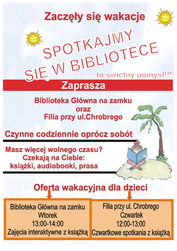 Zaczęły się wakacje Y M J A K T E O C P E S T O I L B I B W to świetny pomysł!!! Ę I S Zaprasza Biblioteka Główna na zamku oraz Filia przy ul.Chrobrego Czynne codziennie oprócz sobót Masz więcej wolnego czasu? Czekają na Ciebie: książki, audiobooki, prasa Oferta wakacyjna dla dzieci Filia przy ul. Chrobrego Biblioteka Główna na zamku Czwartek Wtorek 13:00-14:00 12:00-13:00 Zajęcia interaktywne z książką Czwartkowe spotkania z książką