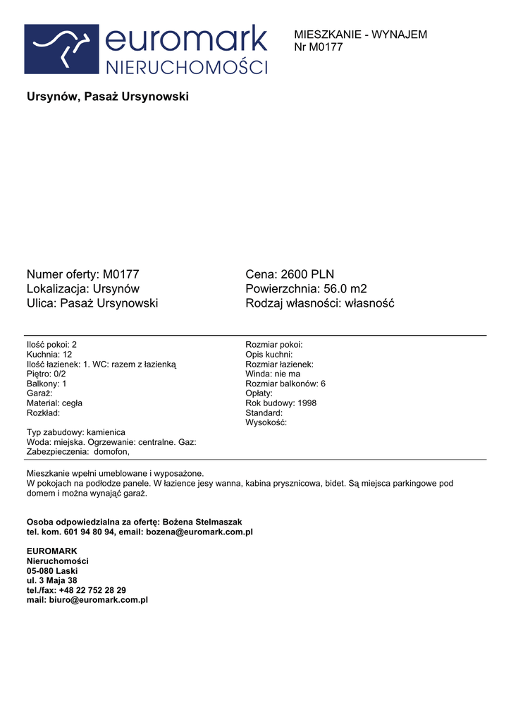 MIESZKANIE - WYNAJEM Nr M0177 Ursynów, Pasaż Ursynowski Numer oferty: M0177 Lokalizacja: Ursynów Ulica: Pasaż Ursynowski Cena: 2600 PLN Powierzchnia: 56.0 m2 Rodzaj własności: własność Ilość pokoi: 2 Kuchnia: 12 Ilość łazienek: 1. WC: razem z łazienką Piętro: 0/2 Balkony: 1 Garaż: Material: cegła Rozkład: Rozmiar pokoi: Opis kuchni: Rozmiar łazienek: Winda: nie ma Rozmiar balkonów: 6 Opłaty: Rok budowy: 1998 Standard: Wysokość: Typ zabudowy: kamienica Woda: miejska. Ogrzewanie: centralne. Gaz: Zabezpieczenia: domofon, Mieszkanie wpełni umeblowane i wyposażone. W pokojach na podłodze panele. W łazience jesy wanna, kabina prysznicowa, bidet. Są miejsca parkingowe pod domem i można wynająć garaż. Osoba odpowiedzialna za ofertę: Bożena Stelmaszak tel. kom. 601 94 80 94, email: [email protected] EUROMARK Nieruchomości 05-080 Laski ul. 3 Maja 38 tel./fax: +48 22 752 28 29 mail: [email protected]